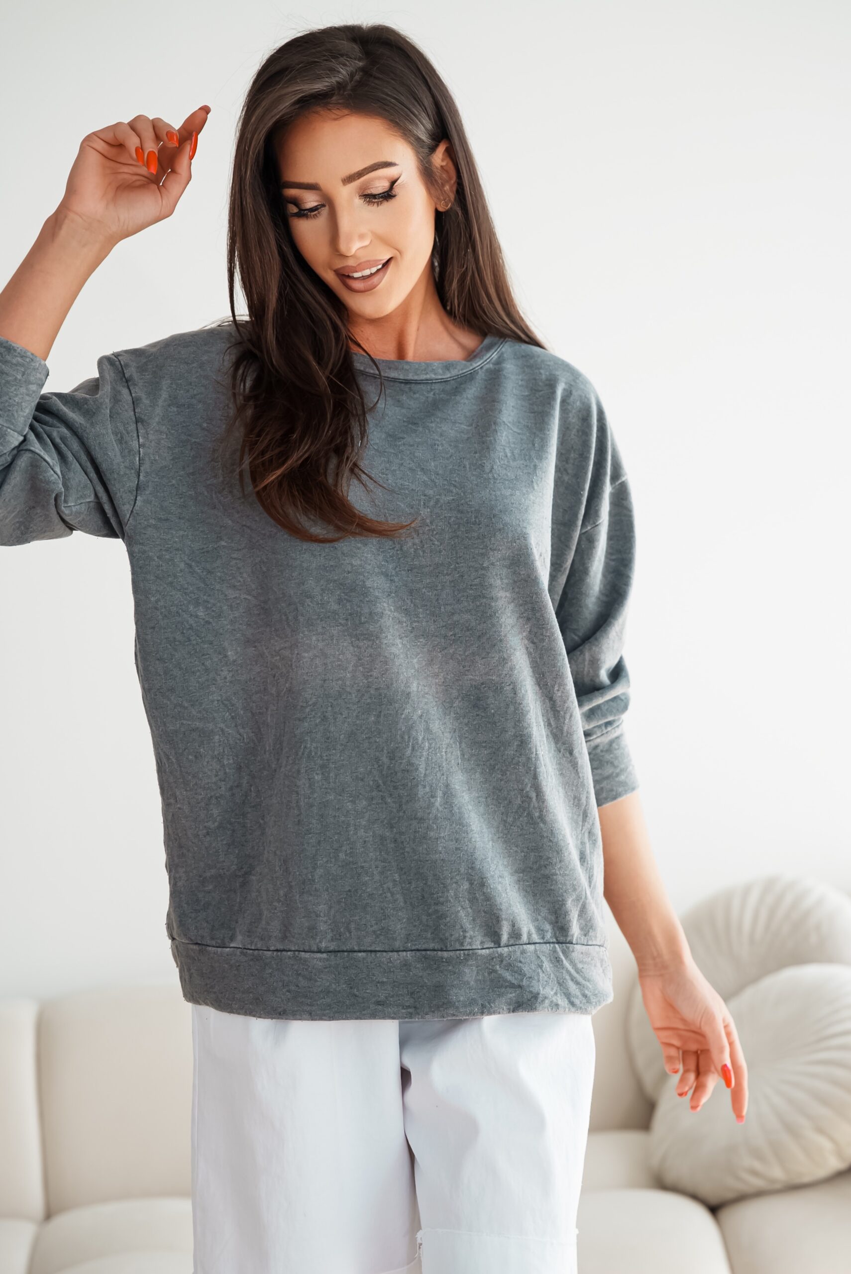 Lekka bluza dresowa wykonana z wysokiej jakości materiału kolorem imitująca jeans z przetarciami , doskonale sprawdzi się do stylizacji na nadchodzące dni.  Oversizowy fason.  Prosty obszerny krój wykończenia bluzy z tego samego materiału co całość bluzy.  Jakość PREMIUM!!!