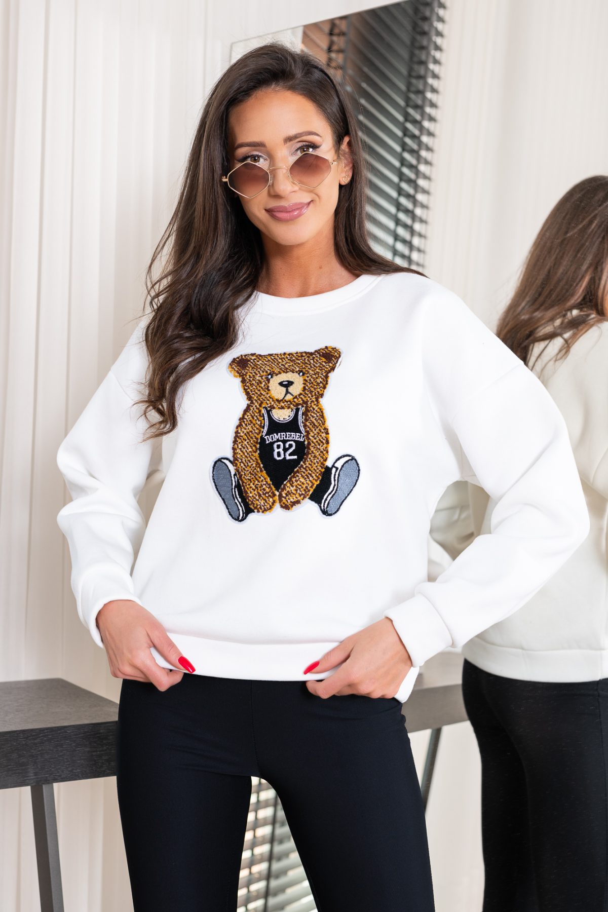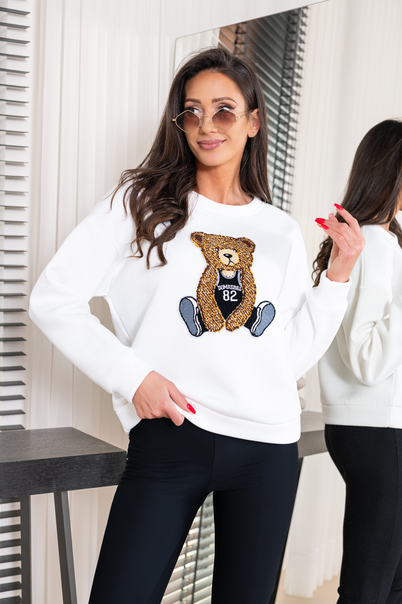 Krój oversize – modelka na zdjęciu nosi rozmiar “M” i ma 173cm wzrostu. Bluza mięsista i bardzo miła w dotyku – gruba bawełna z misiem pod spodem. Bluza pasuje na każdą figure i układa się rewelacyjnie do niej. Produkt PREMIUM!!! Pasuje do spódnic, spodni do wszystkiego 🙂