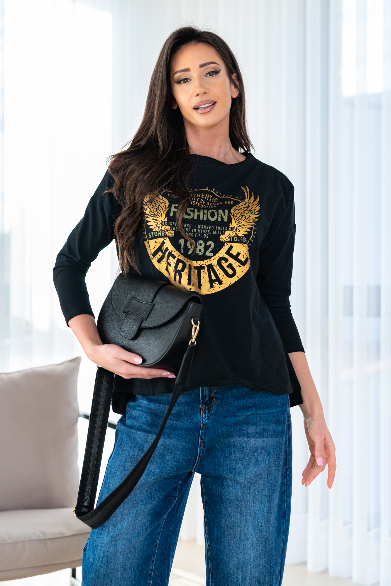 Klasyczny basic z dużym nadrukiem. To luźna koszulka z dzianiny bawełnianej, idealny model pod kardigany i żakiety.
