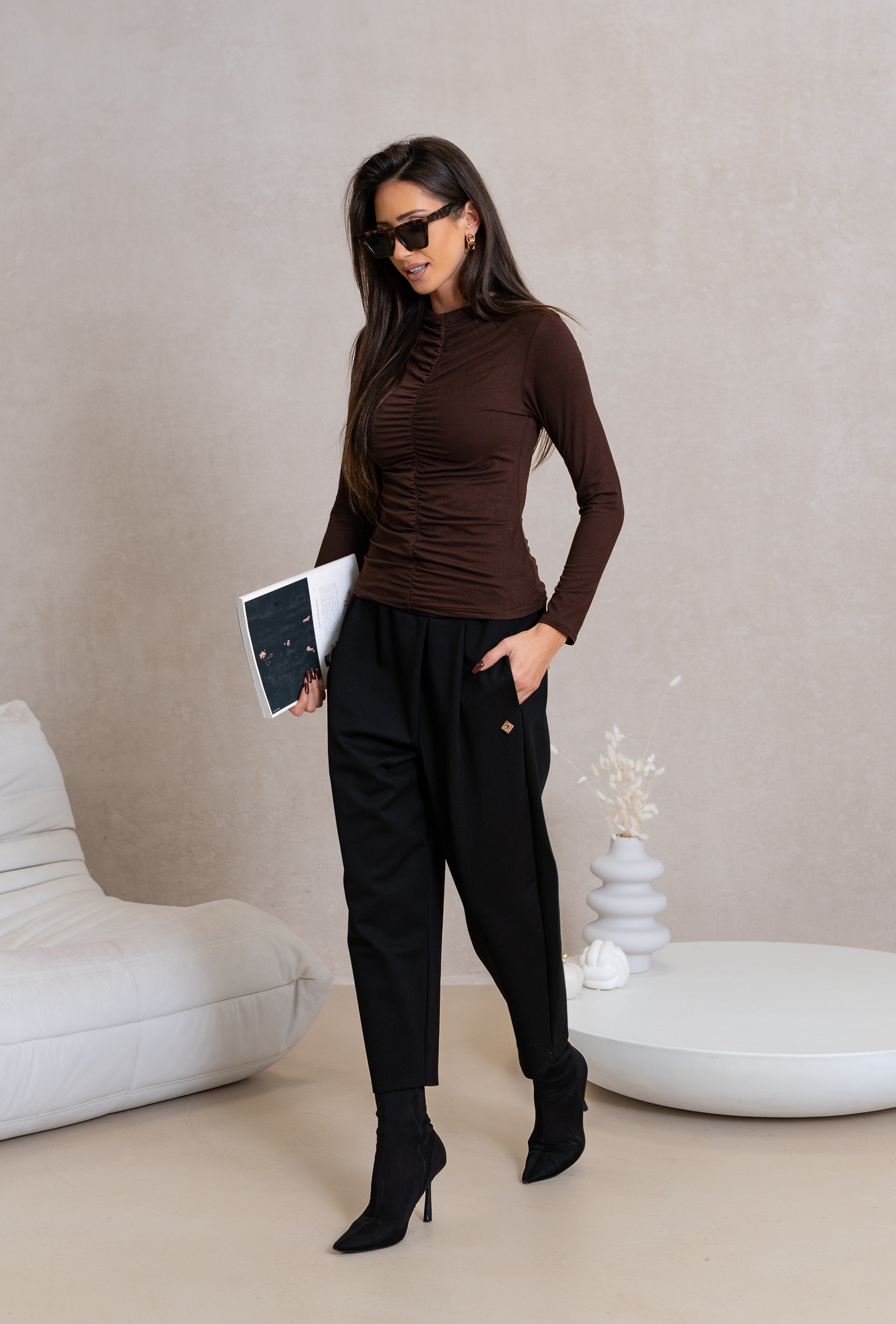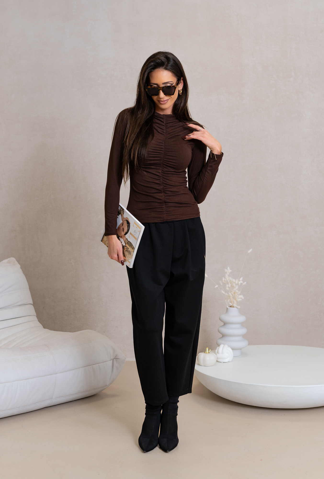 Jest kwintesencją elegancji i wygody, wykonana z wysokogatunkowej, miękkiej dzianiny, zapewnia komfort noszenia, idealna na nachodzące dni. Klasyczny fason z marszczeniem na przodzie (w komplecie broszka róża) idealna po żakiety lekkie marynarki. Doskonale komponuje się zarówno z jeansami, jak i eleganckimi spódnicami, pozwalając na tworzenie rozmaitych, stylowych zestawień. Swobodnie dopasuje się do różnych typów sylwetki, stając się nieodłącznym elementem każdej garderoby.