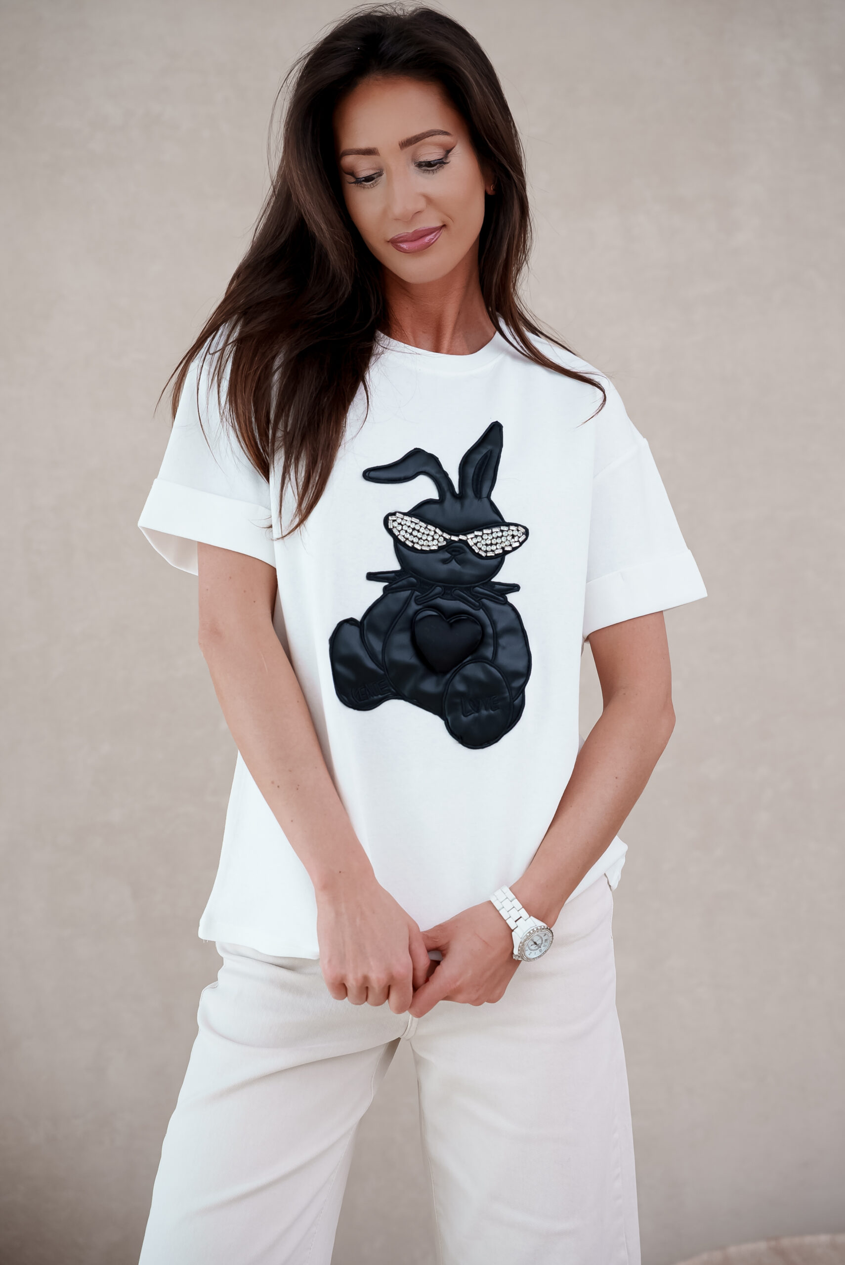 T-shirt z uroczym nadrukiem królika – oryginalna seria Disneya. Bluzka najbardziej przypadnie do gustu fankom luźnych, wygodnych stylizacji. Została wykonana z wysokogatunkowego, miłego w dotyku materiału, który szybko się nie zniszczy. T-shirt damski będzie się znakomicie prezentować razem z jeansami i kataną ale także z klasyczną spódnicą. Dodaj pazura do swojej stylizacji! Takiej bluzki nie będzie miał nikt!