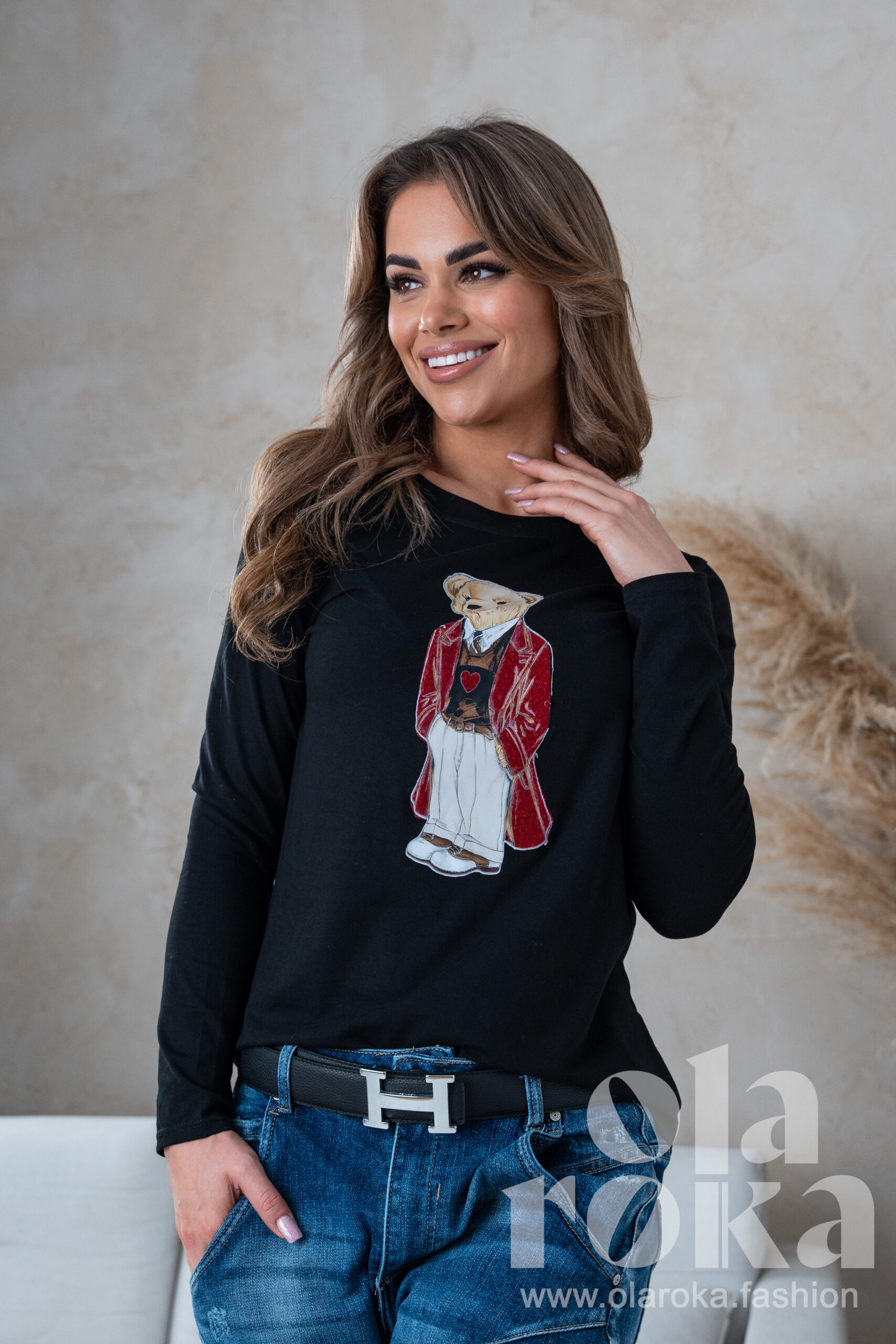 Wprowadź do swojej garderoby odrobinę stylu i radości z naszą uroczą bluzeczką. Jej wyjątkowy design przedstawia misia w stylowym ubranku co sprawia, że jest idealna dla kobiet ceniących sobie oryginalność i kreatywność. Bluzka wykonana jest z wysokiej jakości dzianiny, która gwarantuje wygodę przez cały dzień noszenia. Klasyczna kolorystyka doskonale kontrastuje z kolorowymi detalami, a jej uniwersalny krój sprawia, że świetnie pasuje do każdej stylizacji – zarówno do eleganckich spodni, jak i casualowych jeansów. Niezależnie od okazji, ta bluzka doda Twoim zestawom niepowtarzalnego uroku i stylu.