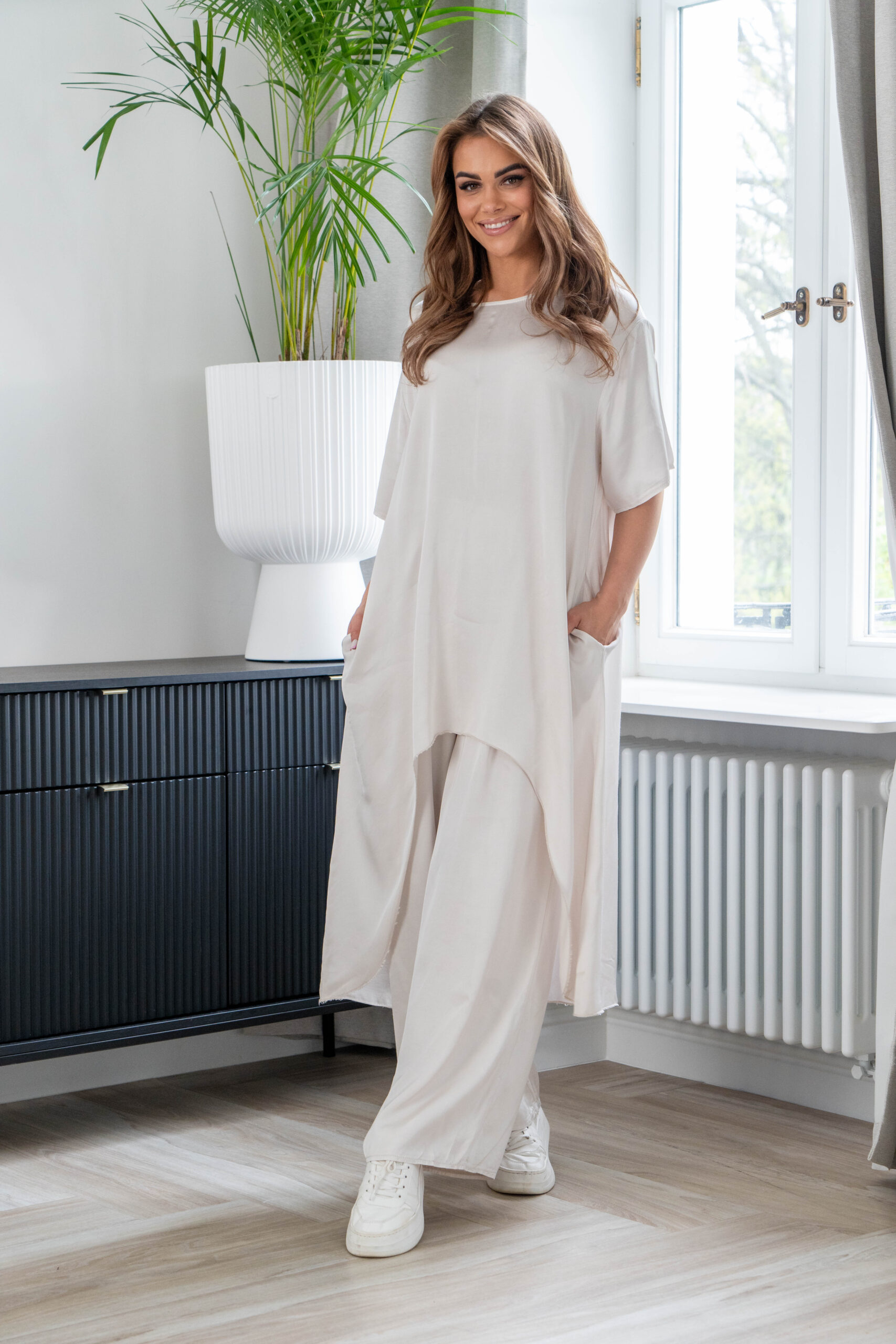 Klasyczna, casualowa bluzka/tunika typu basic wykonana z przyjemnej, niezwykle komfortowej przewiewnej dzianiny. Dekolt w łódkę i krótki rękaw. Idealna jako baza codziennych, jak i wyjściowych stylizacji w połączeniu zarówno ze spodniami, szortami jak i bez niczego będzie prezentować się idealnie! Jakość PREMIUM! Modelka nosi rozmiar S i ma 173cm wzrostu.