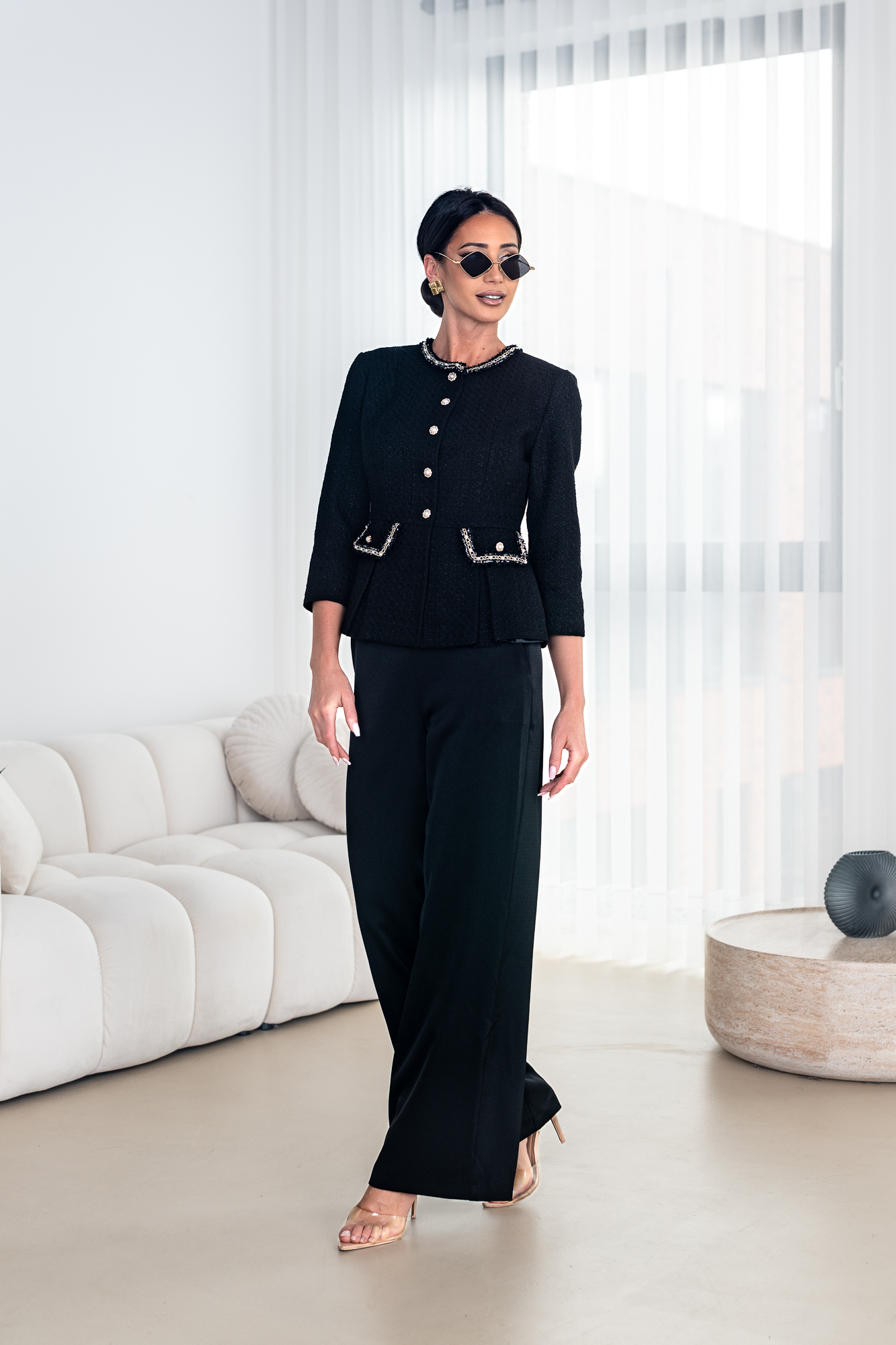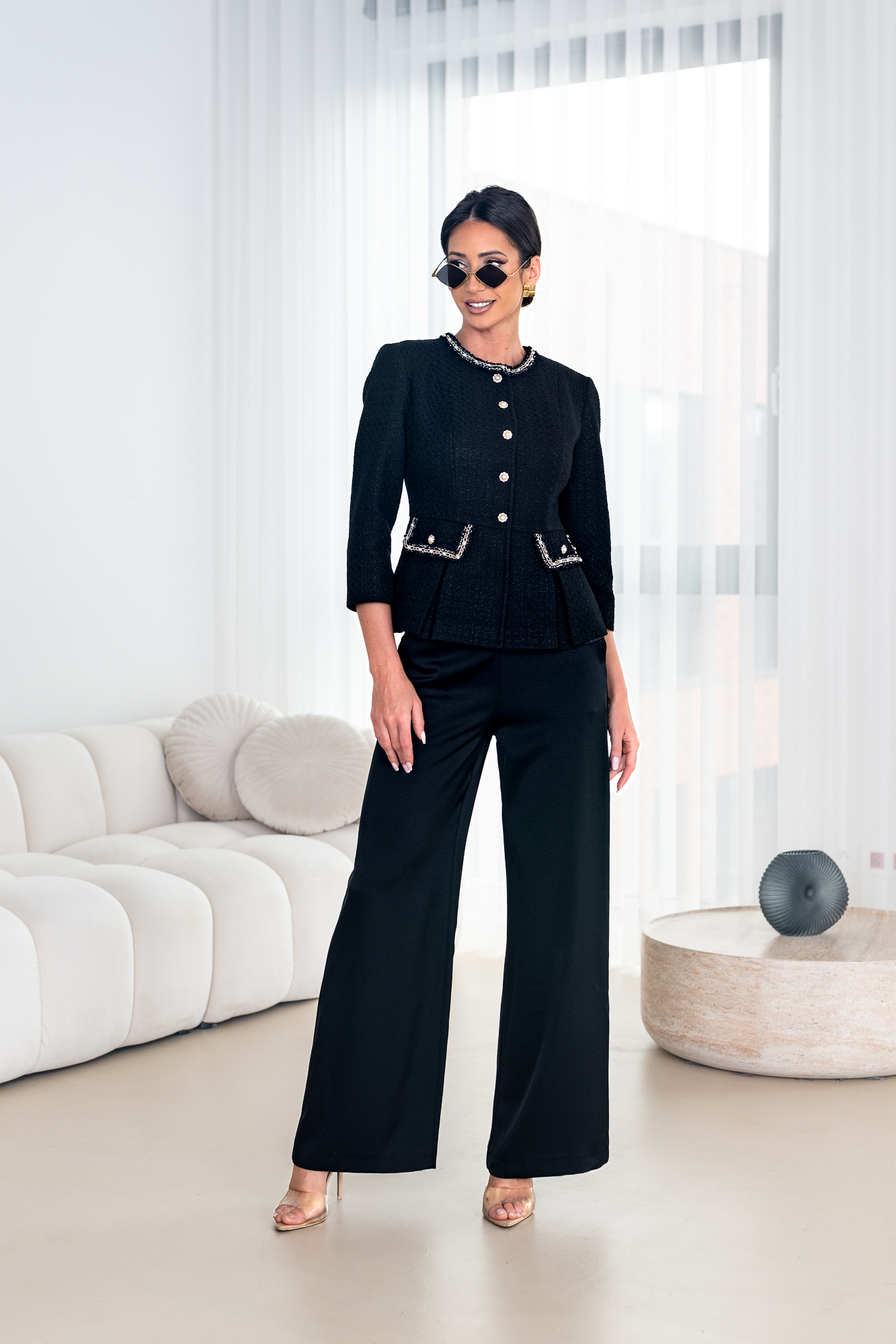 Elegancki garnitur w stylu tweedowym, z ozdobnymi guzikami i biżuteryjnymi wykończeniem przy kołnierzu oraz kieszeniach. Klasyczny, szykowny i idealny na wyjątkowe okazje, spotkania oraz eleganckie wyjścia.