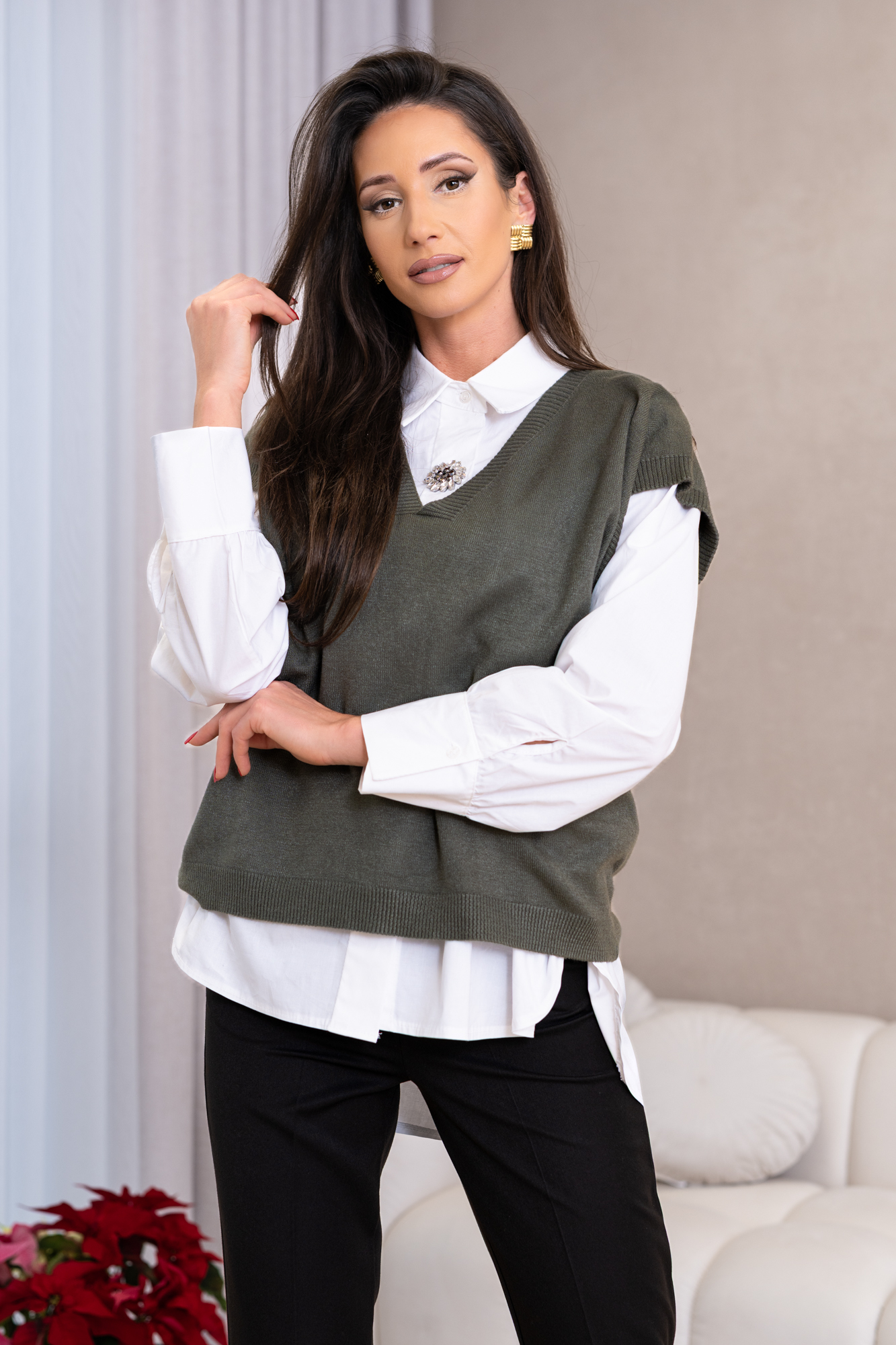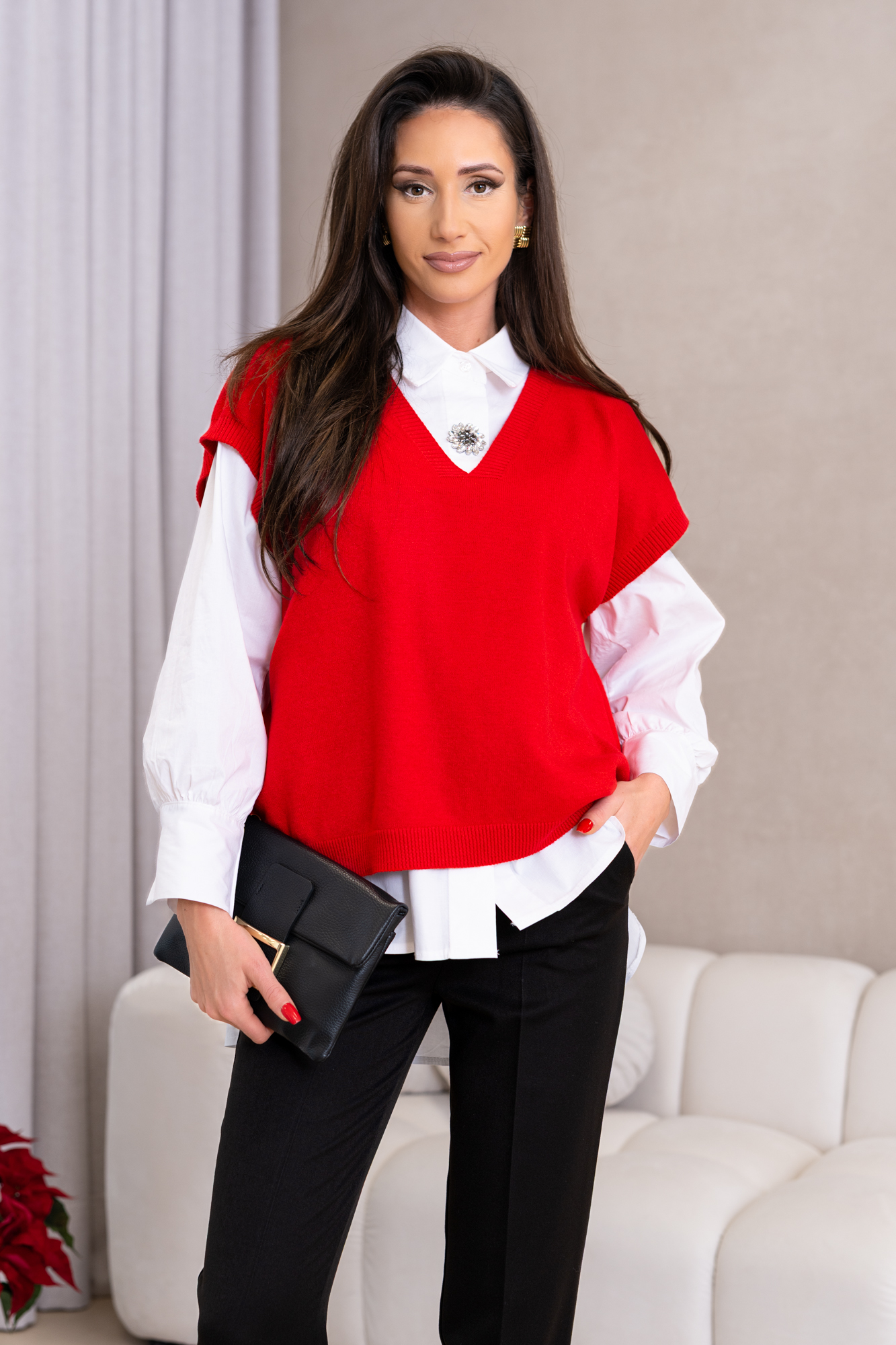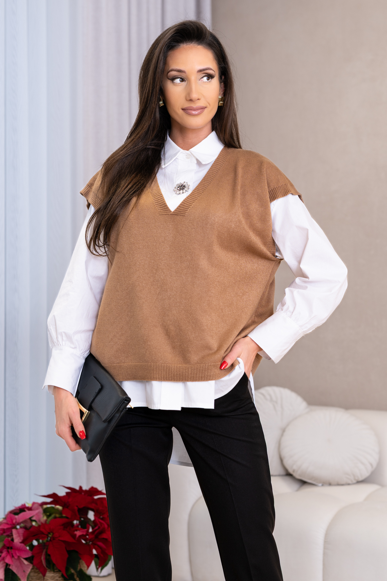Wskazane jest, aby połączyć tę kamizelkę z prostą koszulą, jak pokazano na zdjęciu modelki, a dzięki temu będziesz wyglądać delikatnie, wyrafinowanie, energicznie, stylowo – przyciągniesz uwagę.