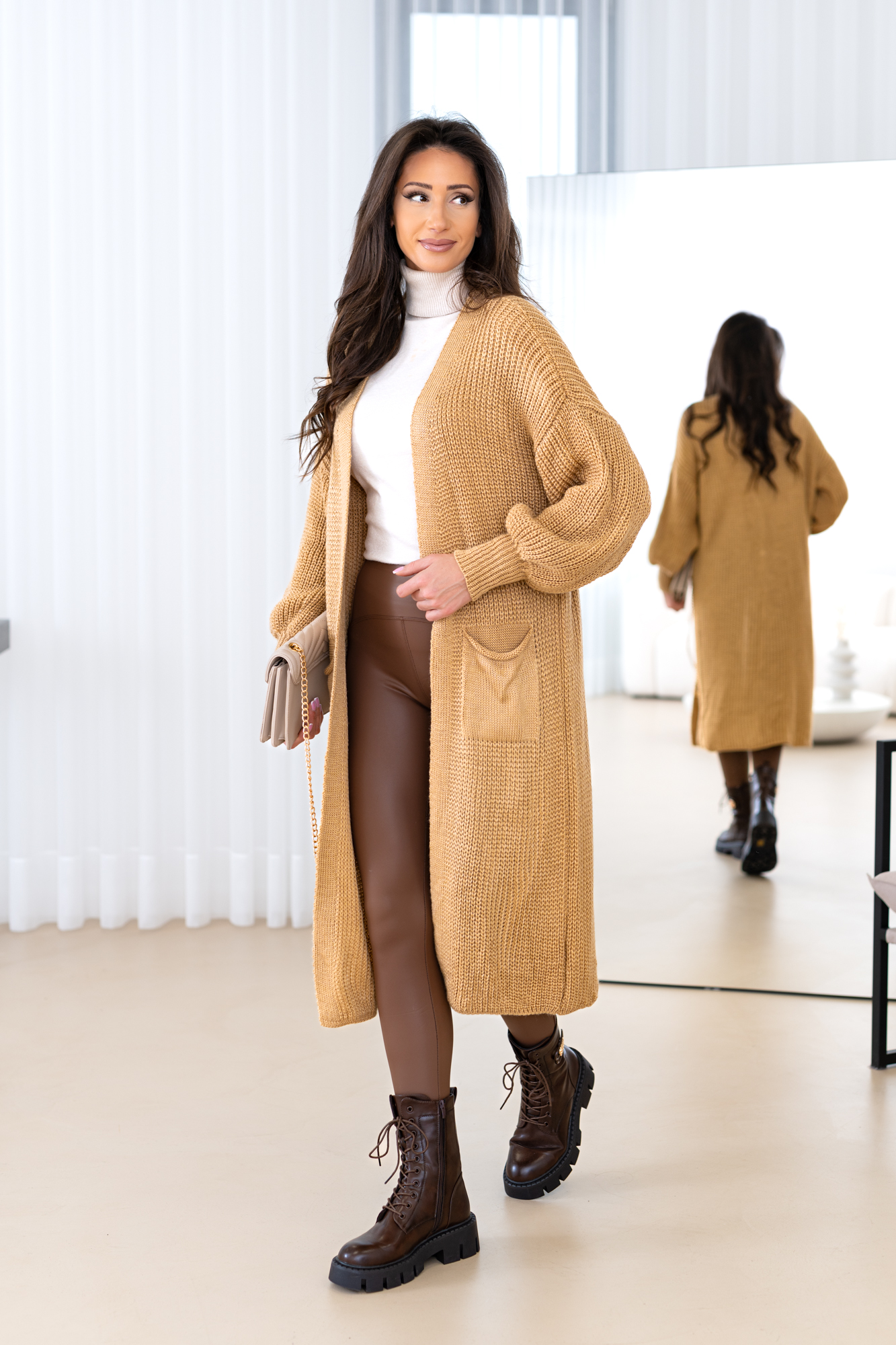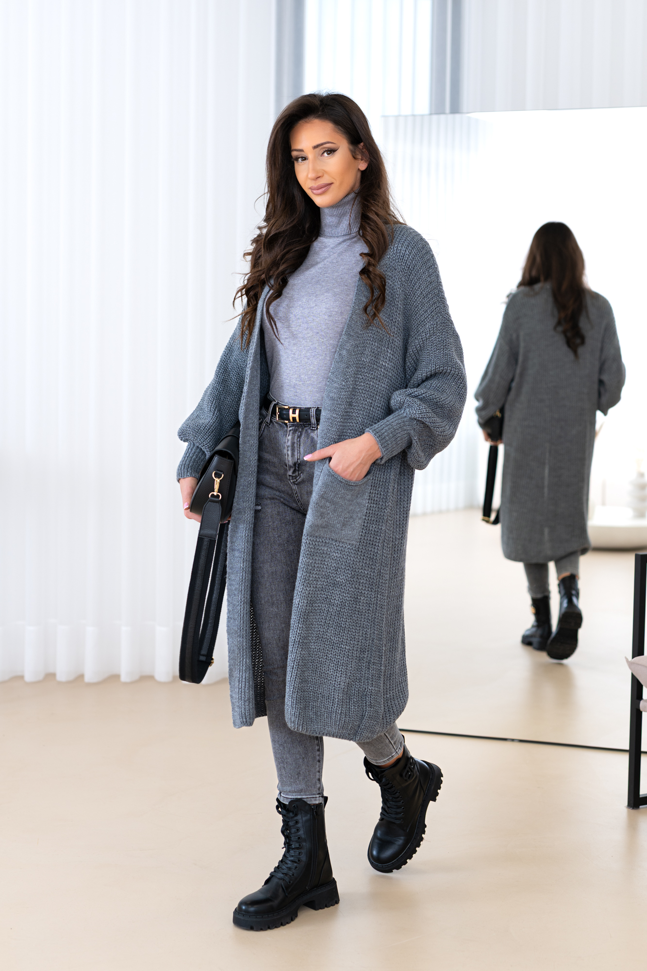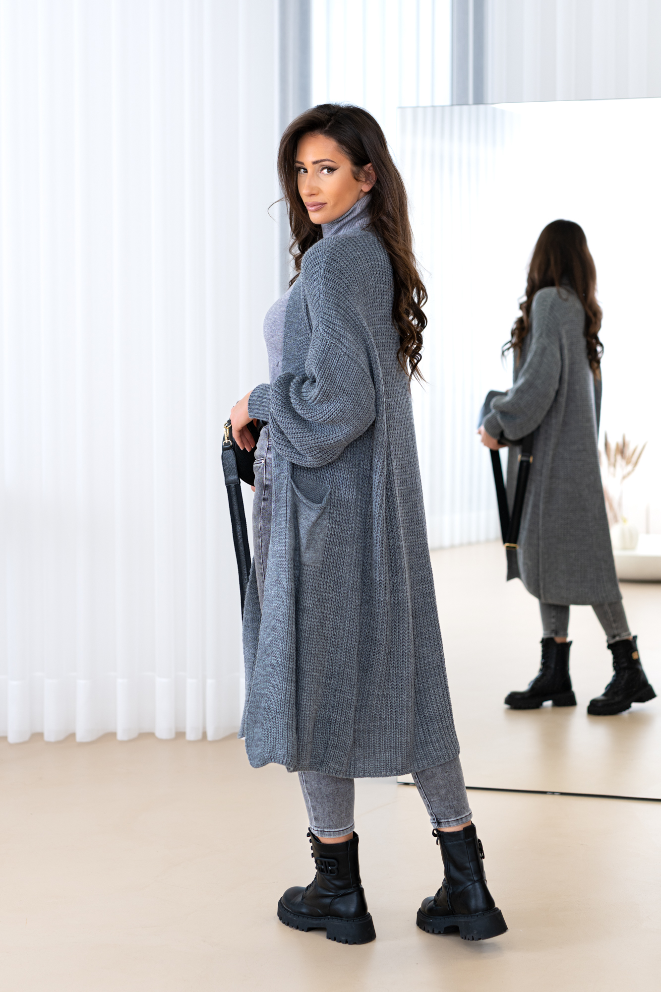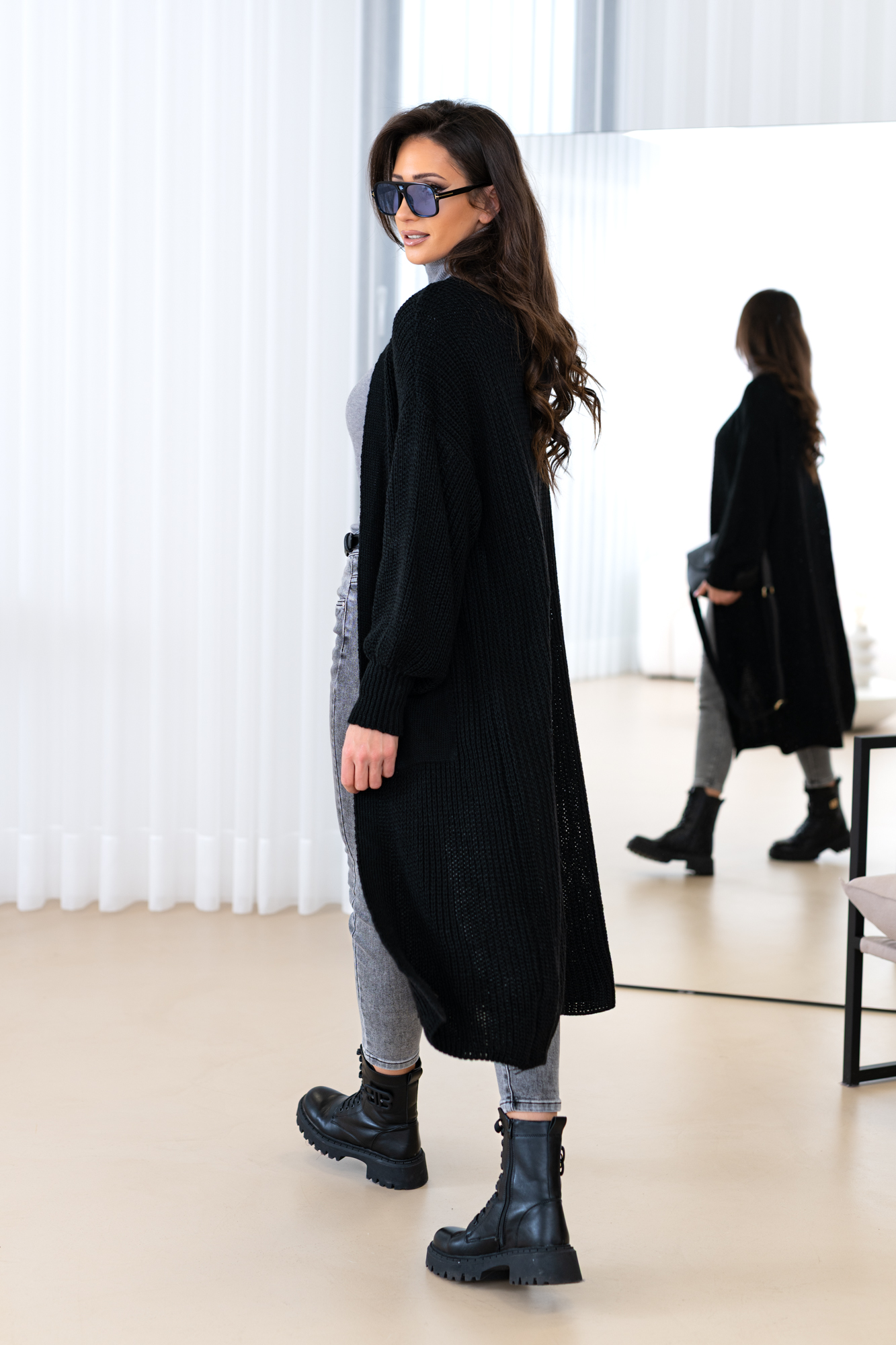 Model z obszernymi luźnymi rękawami, długi, prosty krój, który świetnie wydłuża sylwetkę oraz tuszuje ewentualne niedoskonałości 🙂 Kardigan doskonale będzie prezentował się zarówno w eleganckich, jak i codziennych stylizacjach.
