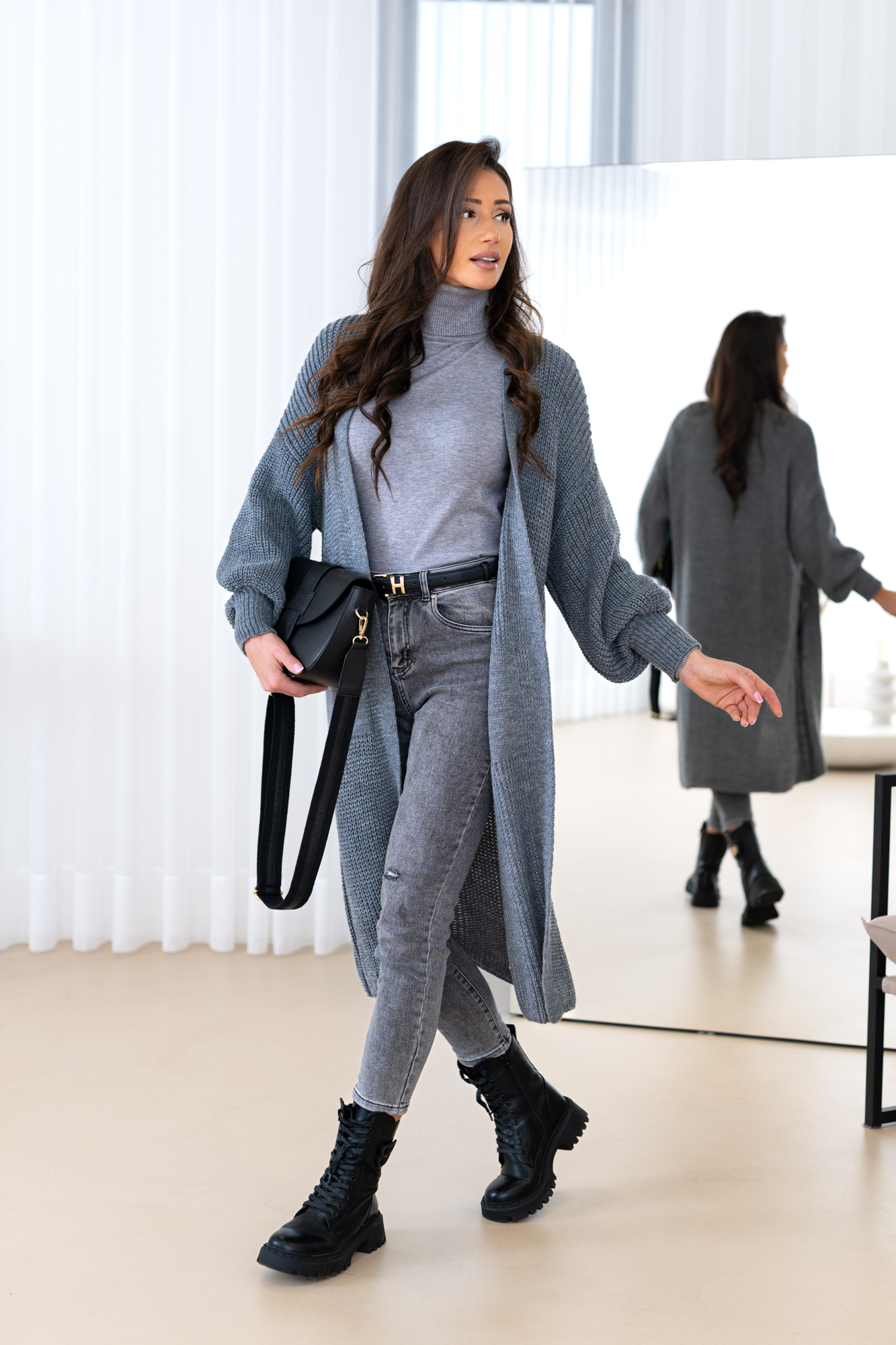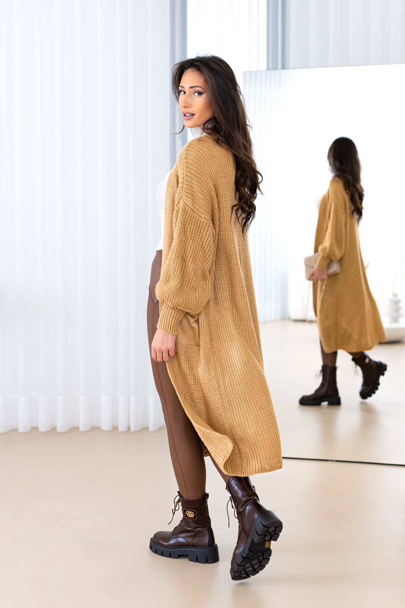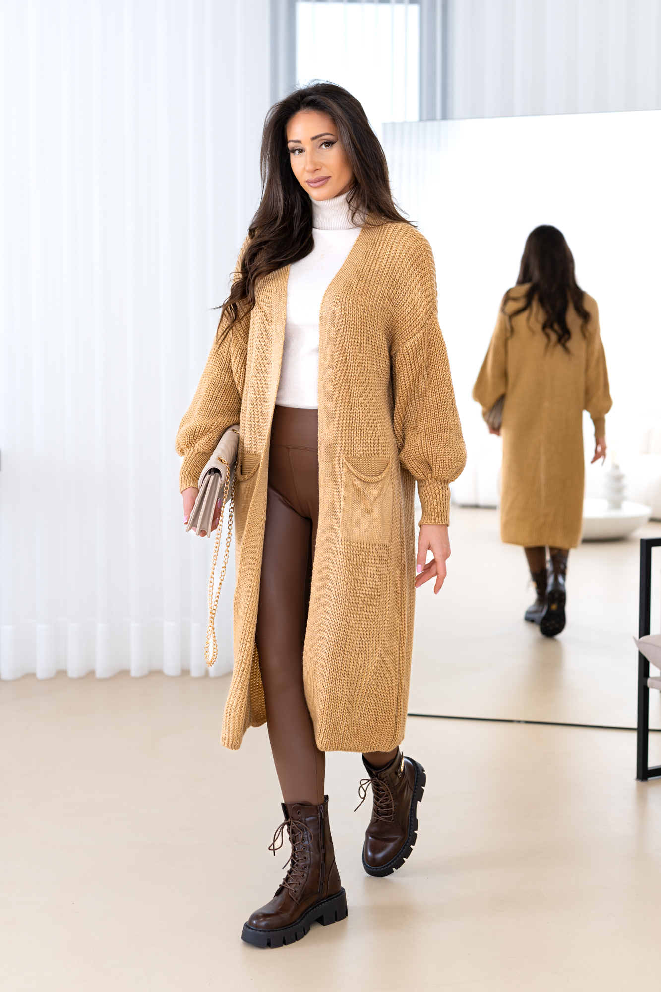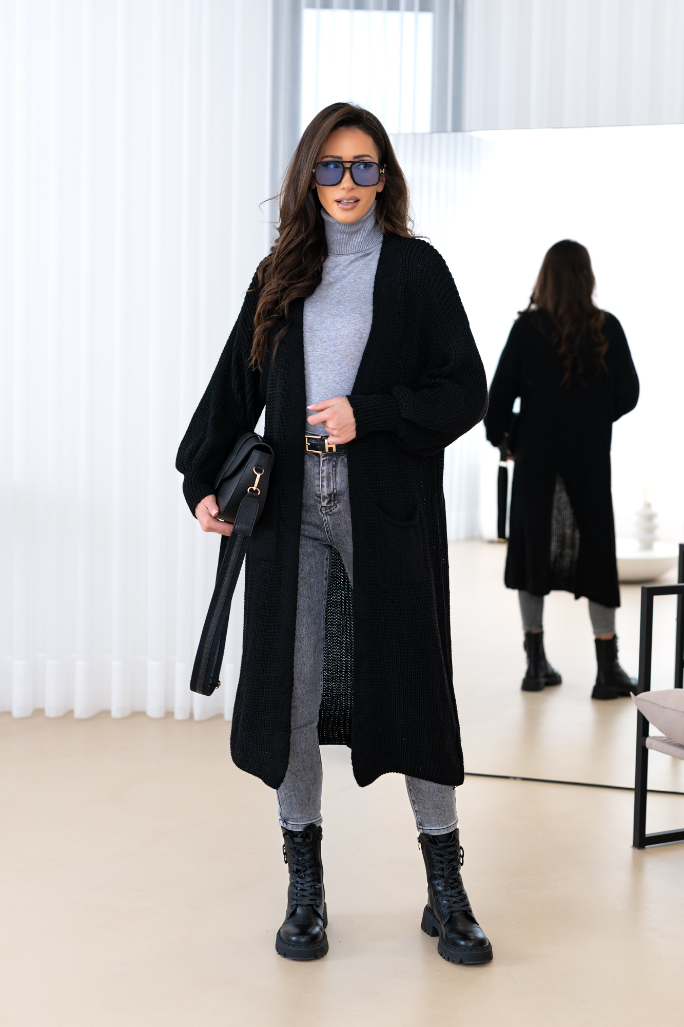 Model z obszernymi luźnymi rękawami, długi, prosty krój, który świetnie wydłuża sylwetkę oraz tuszuje ewentualne niedoskonałości 🙂 Kardigan doskonale będzie prezentował się zarówno w eleganckich, jak i codziennych stylizacjach.