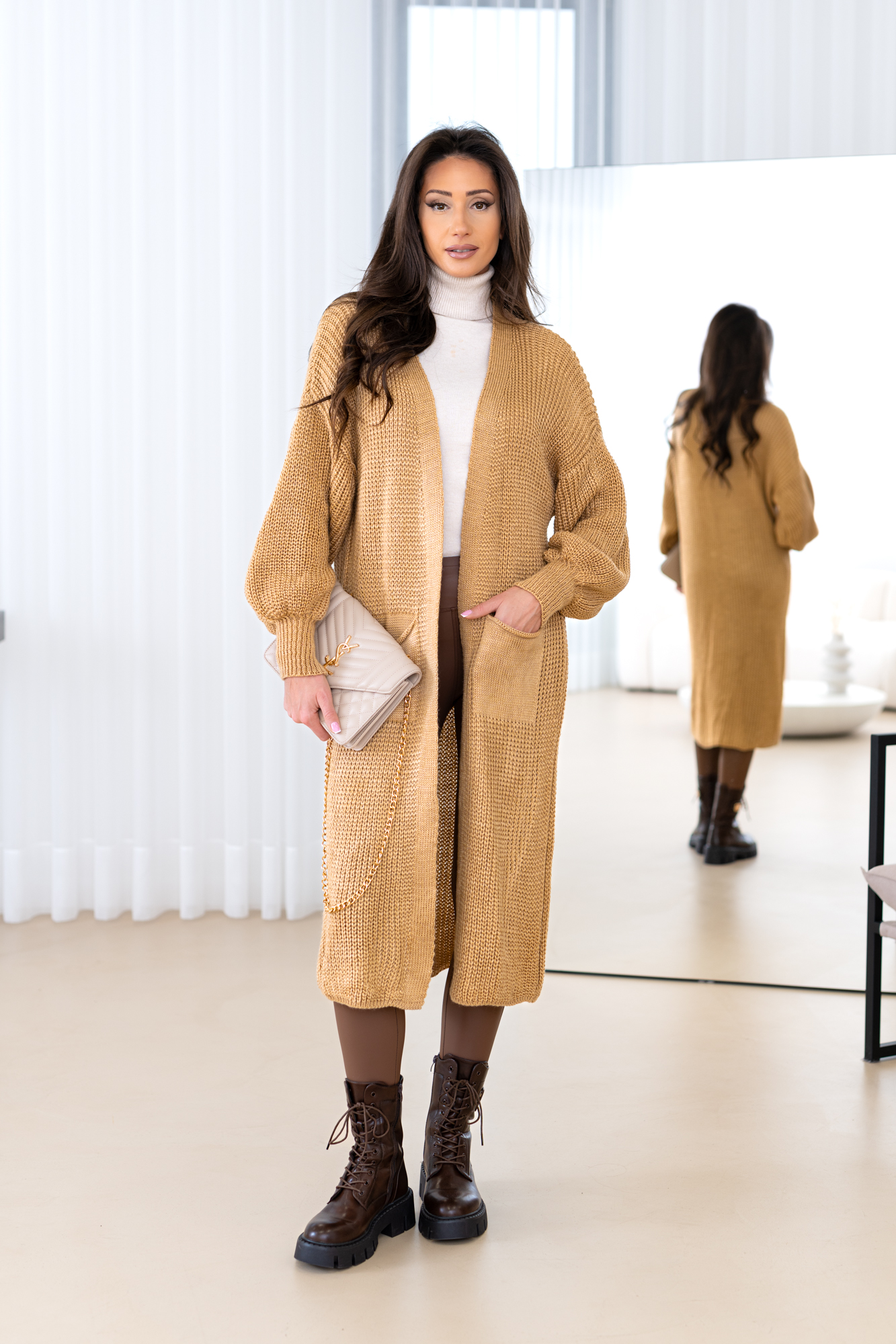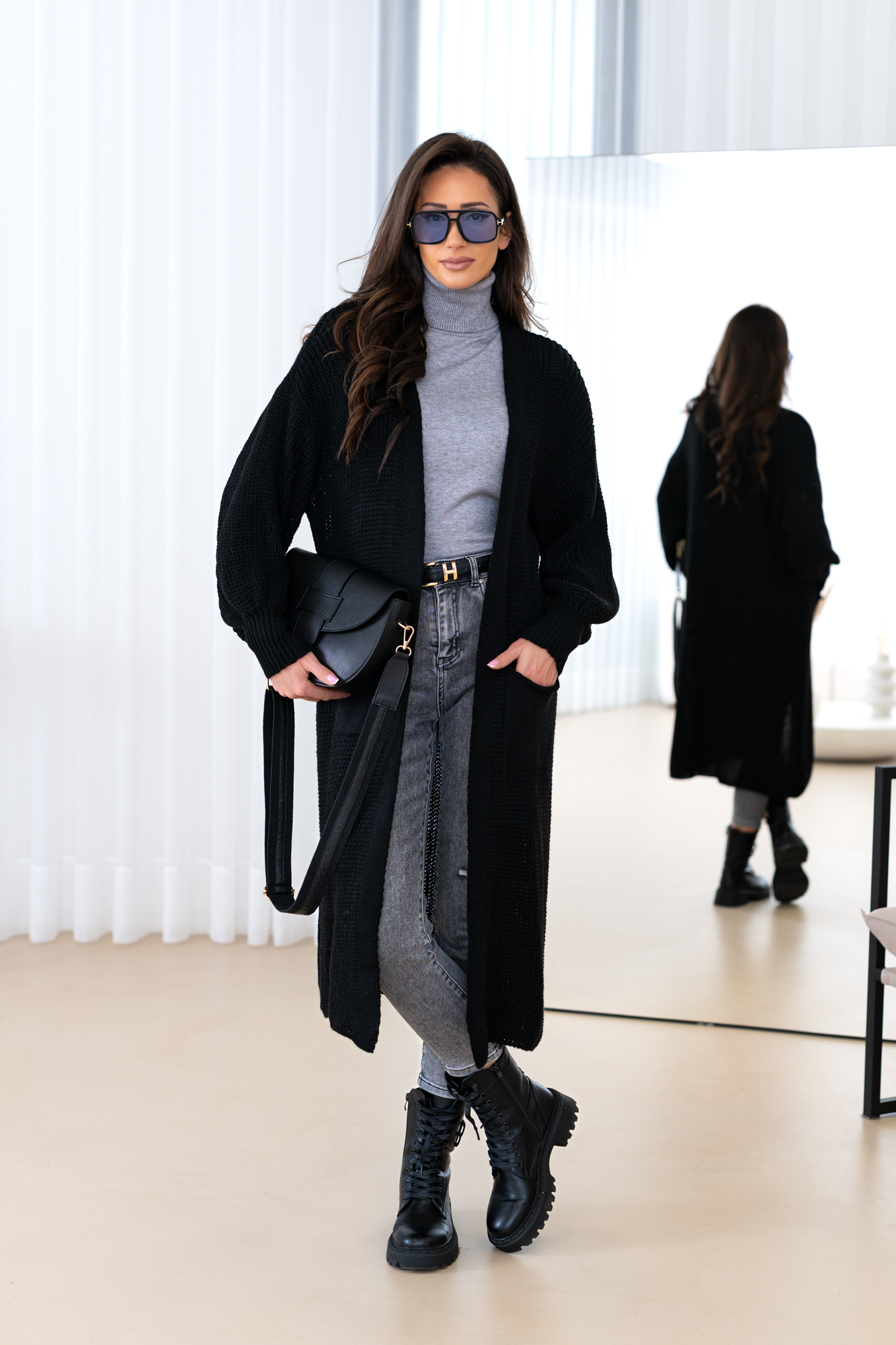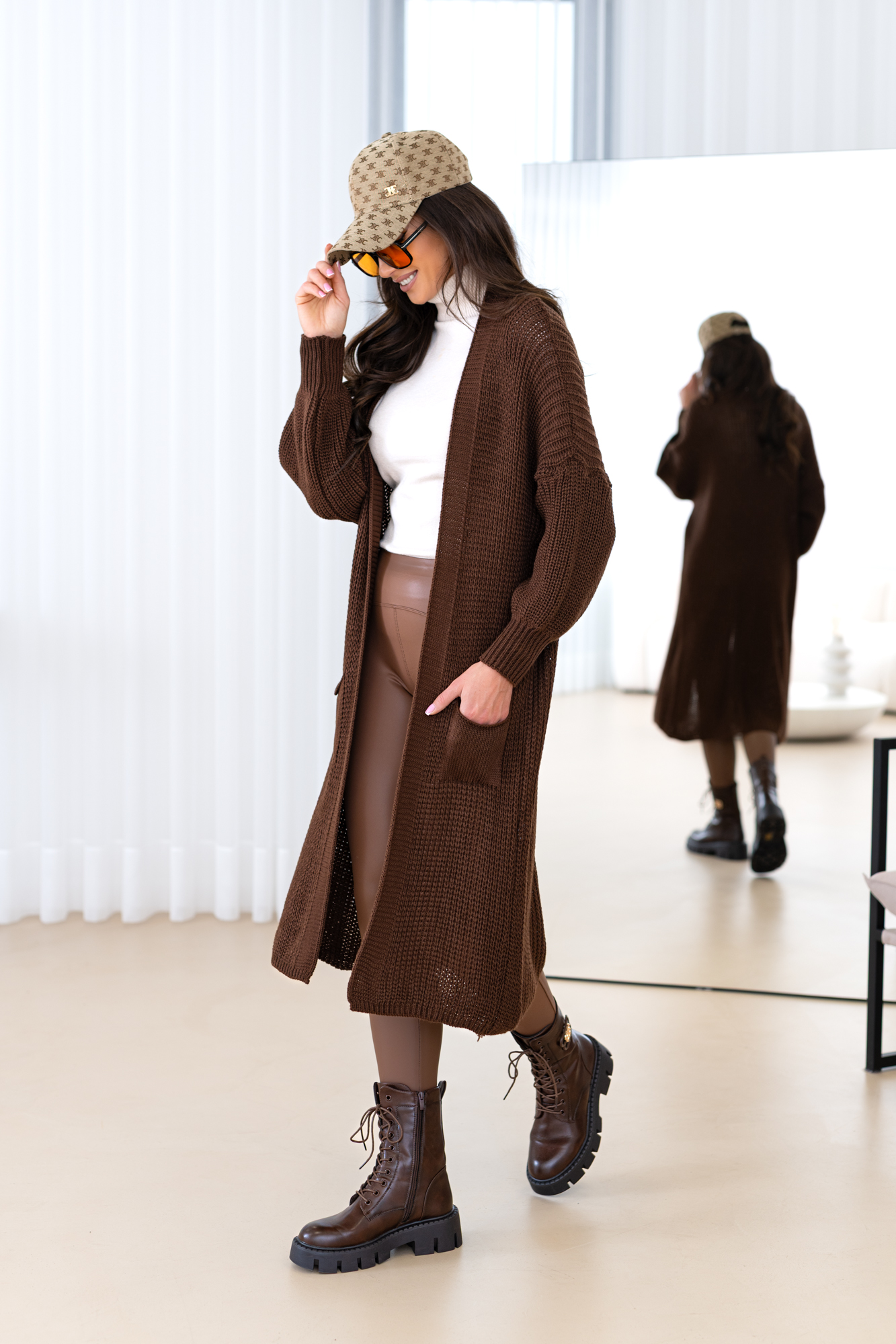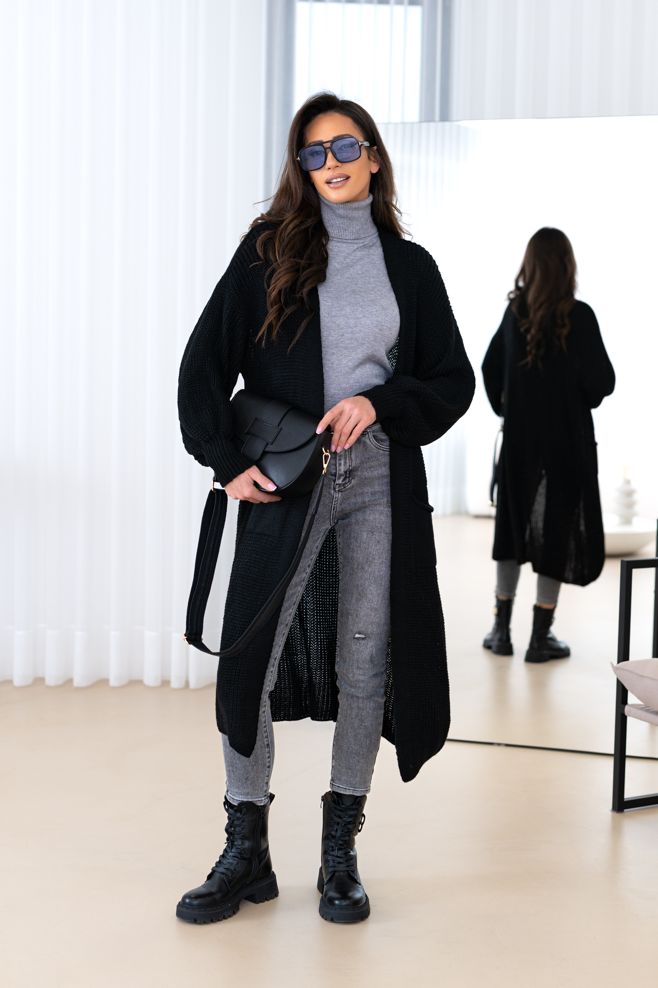 Model z obszernymi luźnymi rękawami, długi, prosty krój, który świetnie wydłuża sylwetkę oraz tuszuje ewentualne niedoskonałości 🙂 Kardigan doskonale będzie prezentował się zarówno w eleganckich, jak i codziennych stylizacjach.
