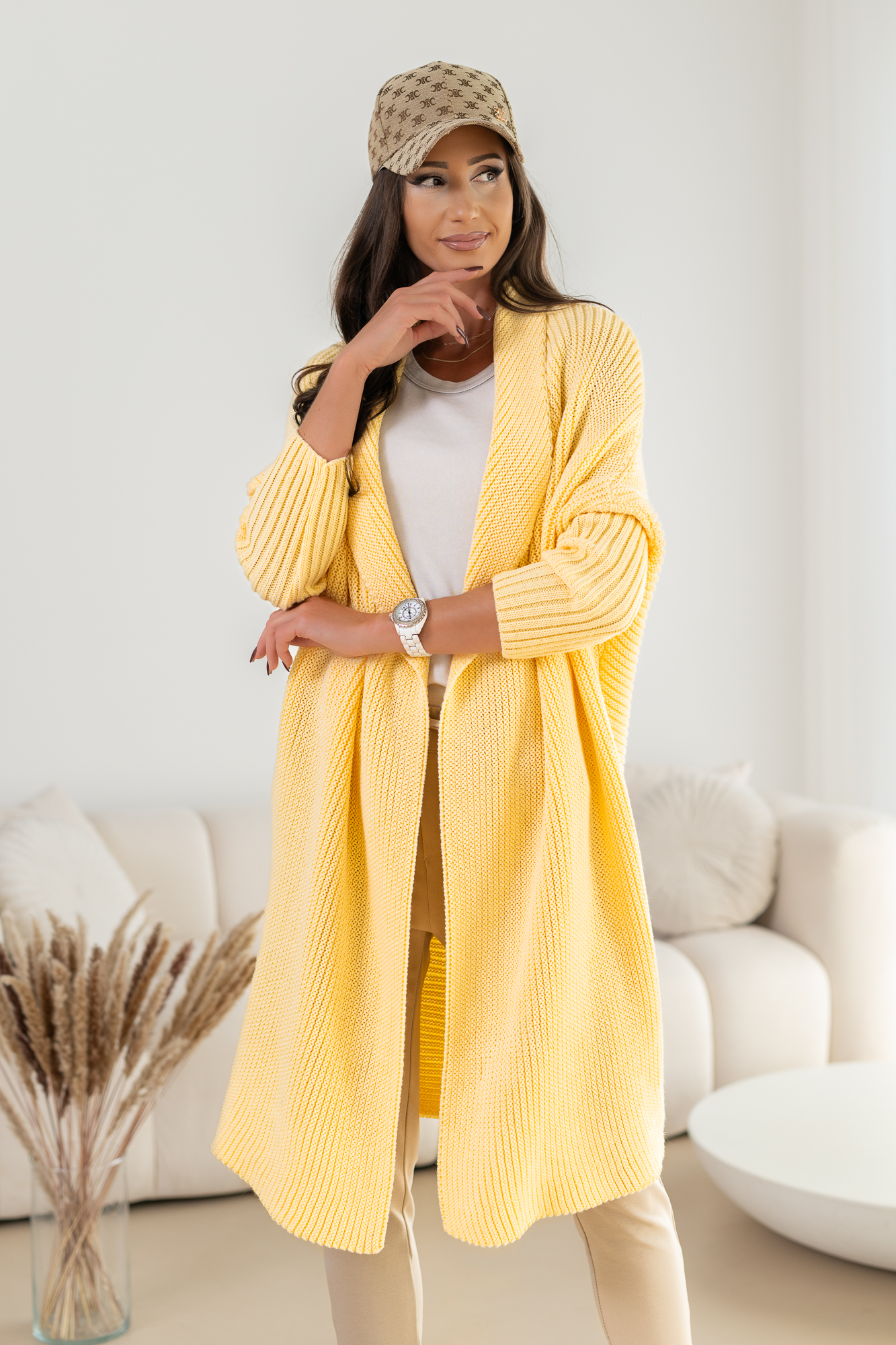 Klasyczny kardigan bez zapięcia.  Długi, prosty krój, który świetnie wydłuża sylwetkę oraz tuszuje ewentualne niedoskonałości:-)