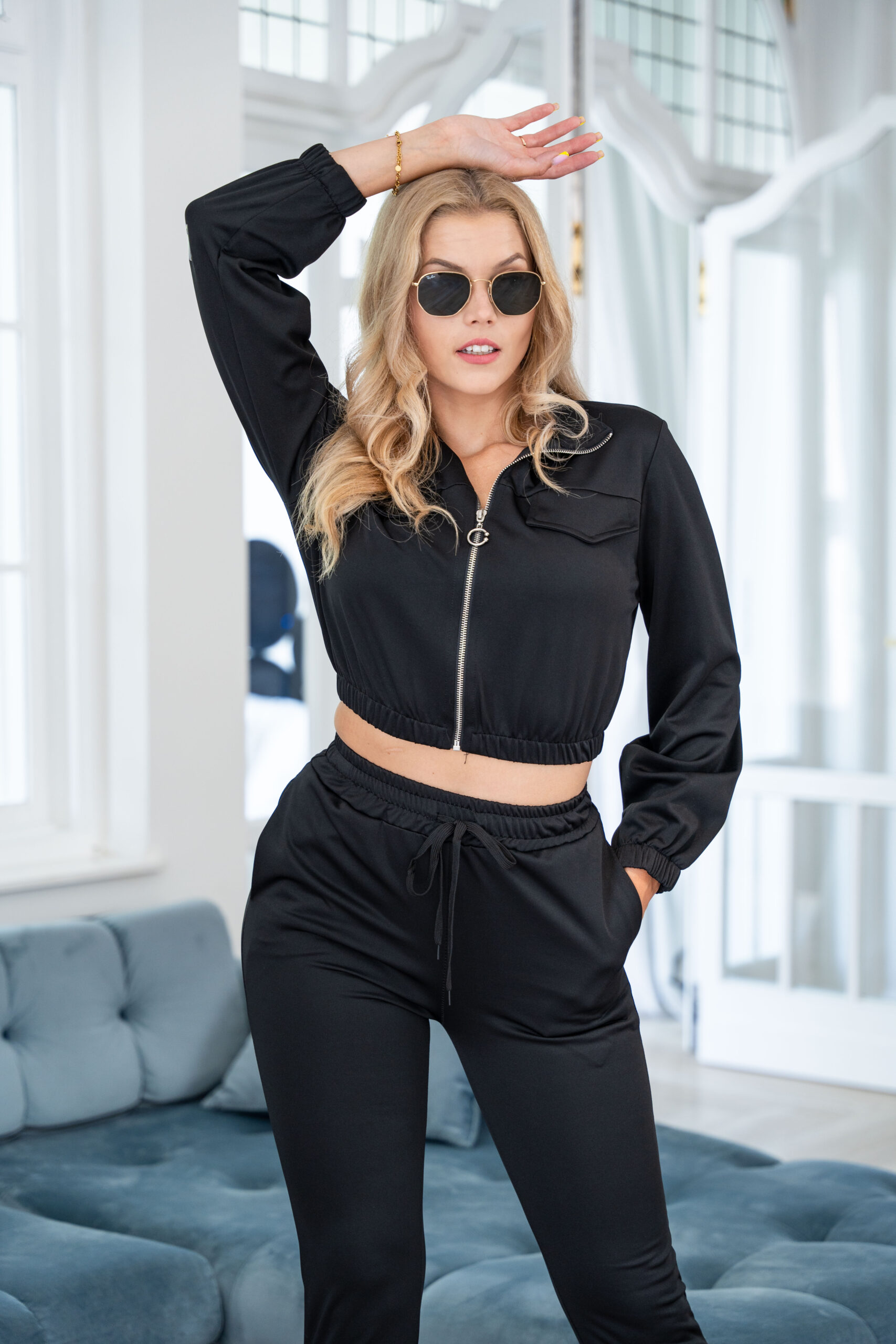 Komplet dla każdej Bad Girl! Wygodne spodnie z kieszeniami, idealnie eksponujące pośladki oraz crop bluza zapinana na suwak.