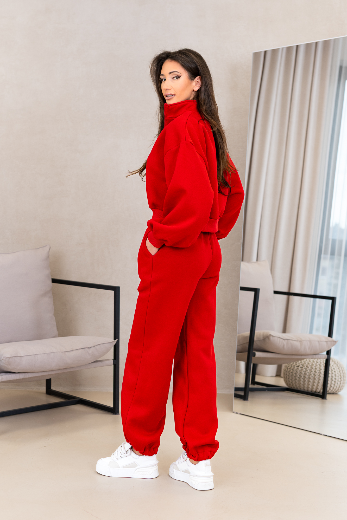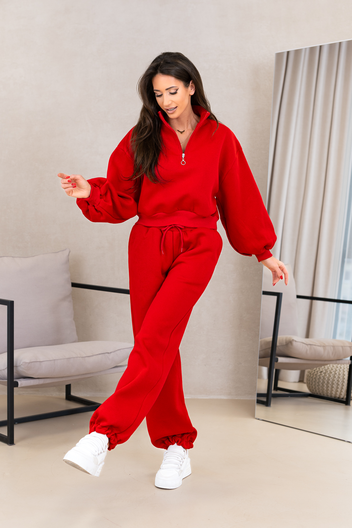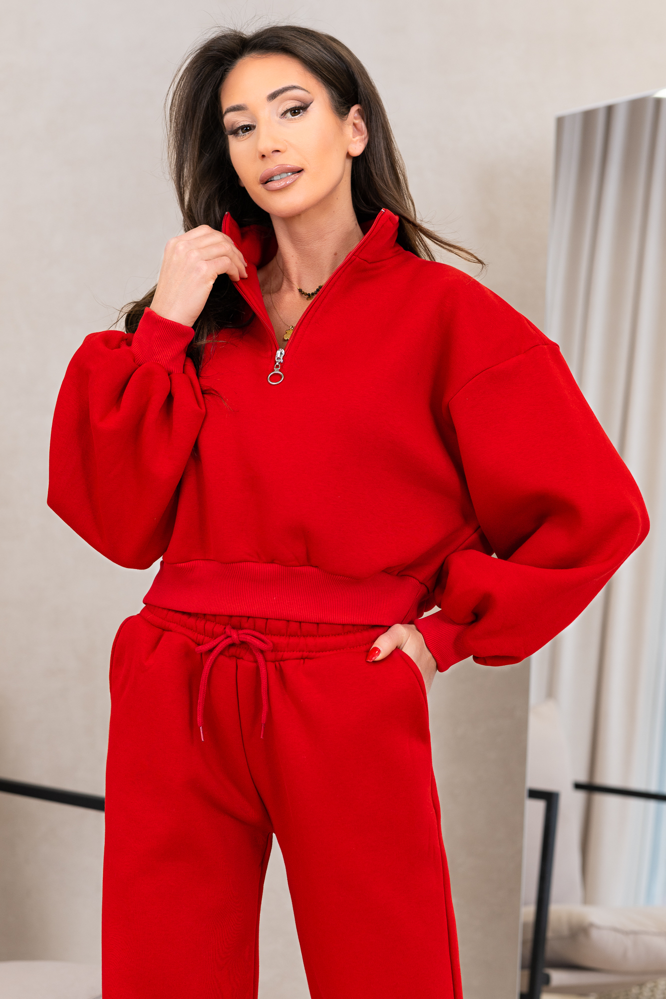Komplet dresowy „Urban Ease” to połączenie nowoczesnego stylu i maksymalnego komfortu. Bluza o skróconym kroju z zamkiem przy dekolcie i luÅ%nymi rękawami nadaje całości modnego, miejskiego charakteru. Spodnie z elastycznym pasem i troczkiem idealnie dopasowują się do sylwetki, zapewniając wygodę noszenia przez cały dzień. To dres stworzony do codziennych stylizacji – od miejskich spacerów po casualowe wyjścia.