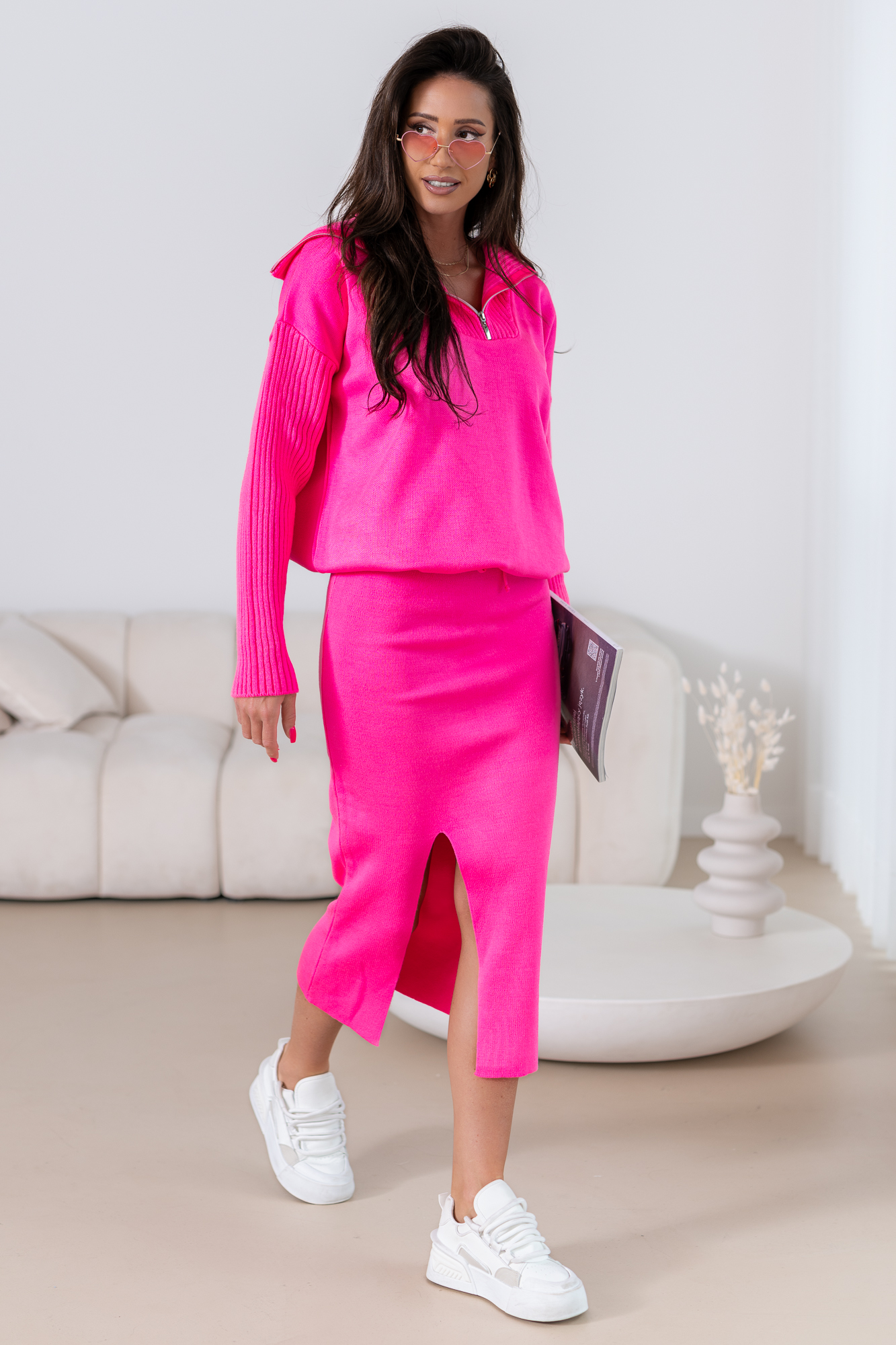 Wygodny i modny komplet damski z dzianiny idealnie dopasowujący się do sylwetki. Prosta, wąska spódnic z rozporkiem wykończona grubą gumą. Bluza obszerna, wiązana w pasie i wysoki kołnierz idealny na chłodniejsze dni, rękawy dopasowane.