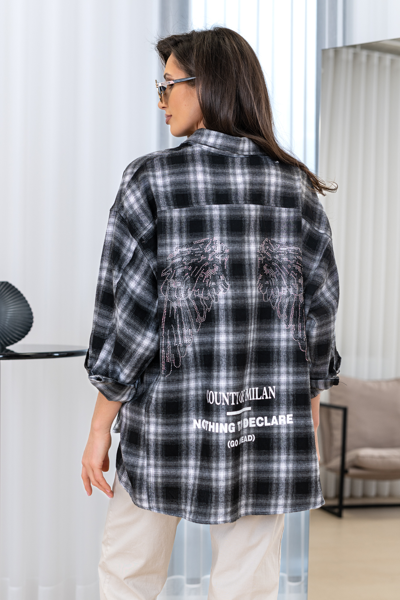 ŁAP OKAZJĘ!!! Oversize’owa, przedłużana koszula z bawełnianego materiału w kratę z dodatkiem elastanu. Rękaw długi. Unikatowa aplikacja na plecach w postaci skrzydeł z dżetów oraz napis!!! To klasyczna koszula z pazurem!!! Zapinana na małe guziki. Klasyka, moda i szyk z odrobiną nowoczesności i frywolności. KOSZULA FASON OVERSIZE!!!