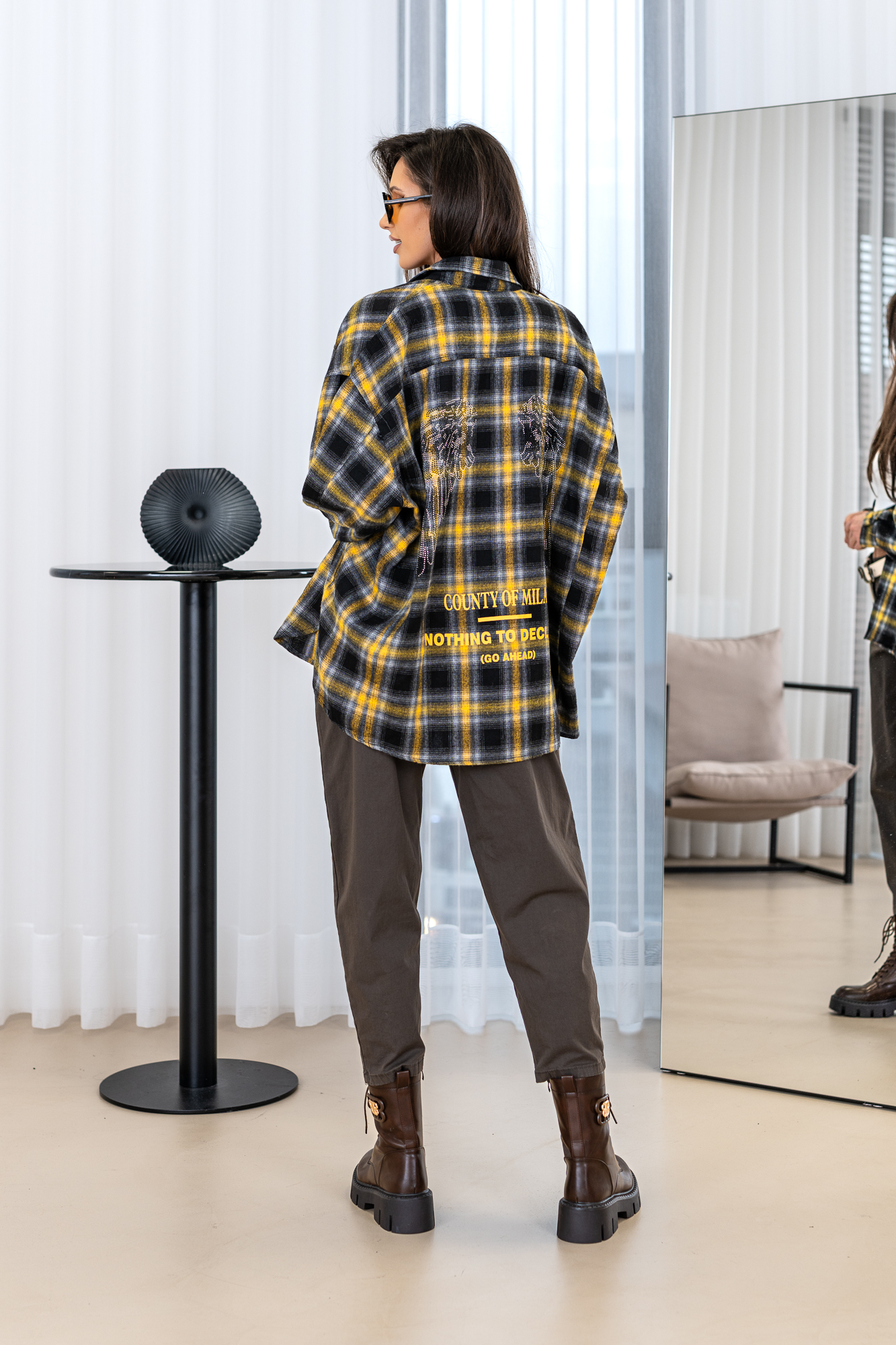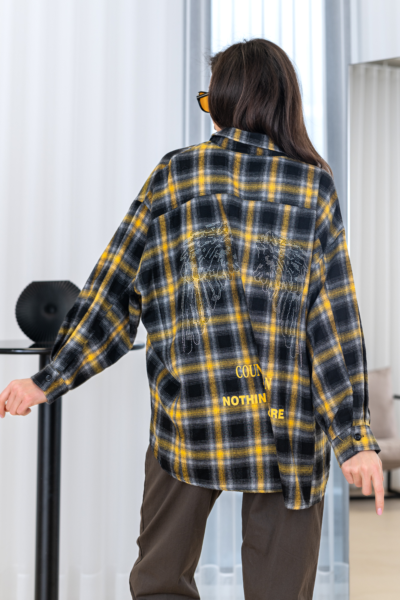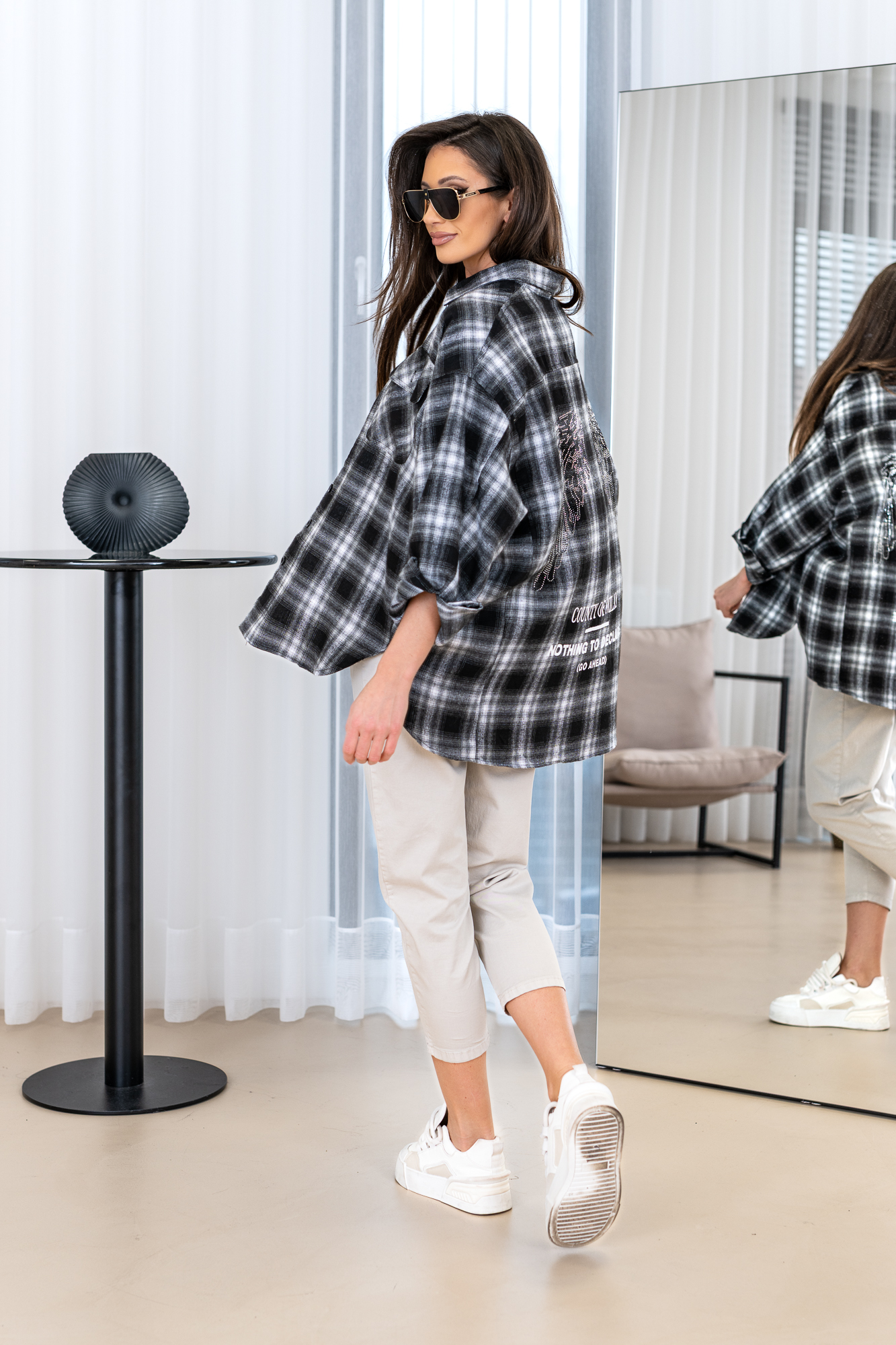 Oversize’owa, przedłużana koszula z bawełnianego materiału w kratę z dodatkiem elastanu. Rękaw długi. Unikatowa aplikacja na plecach w postaci skrzydeł z dżetów oraz napis!!! To klasyczna koszula z pazurem!!! Zapinana na małe guziki. Klasyka, moda i szyk z odrobiną nowoczesności i frywolności. KOSZULA FASON OVERSIZE!!!