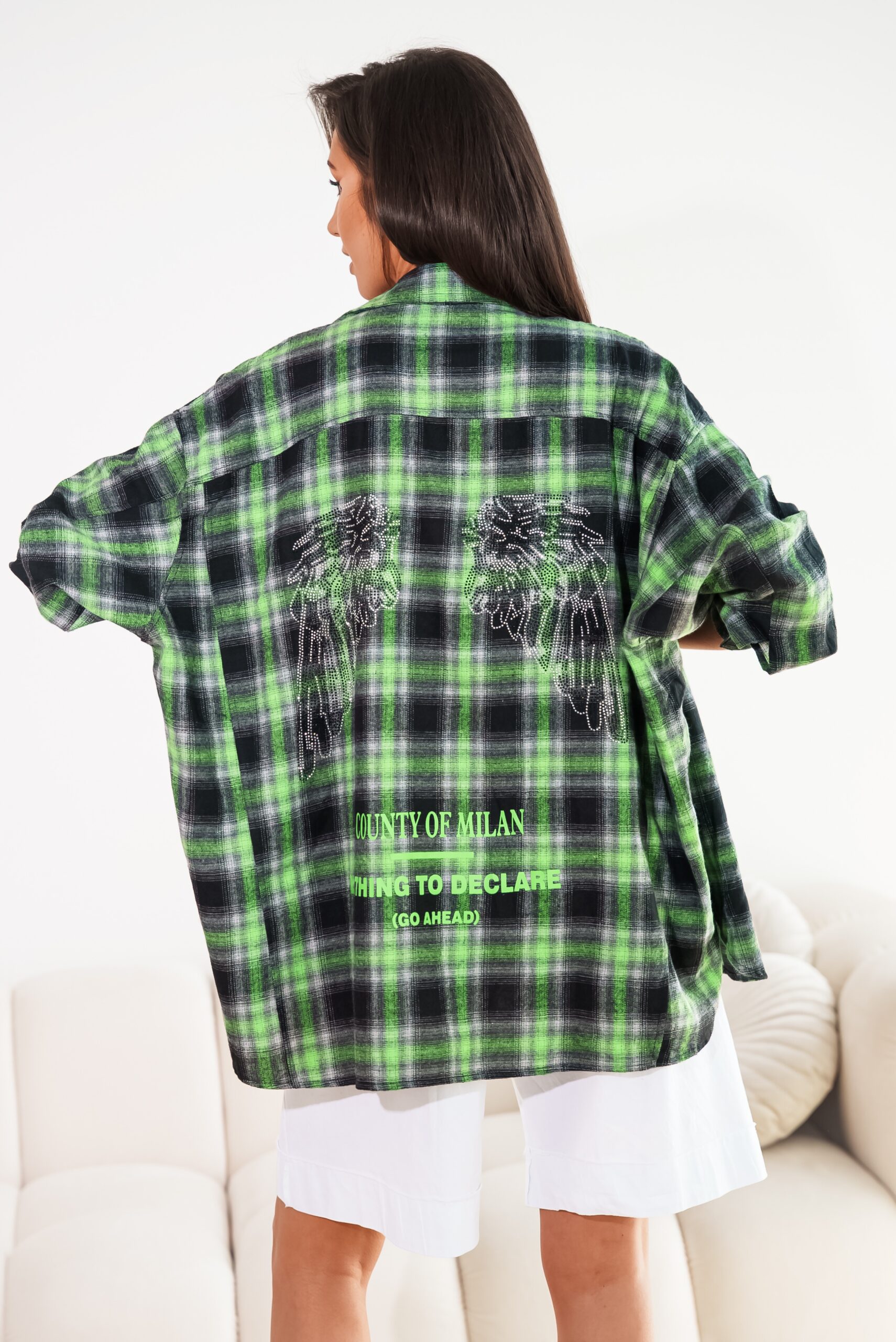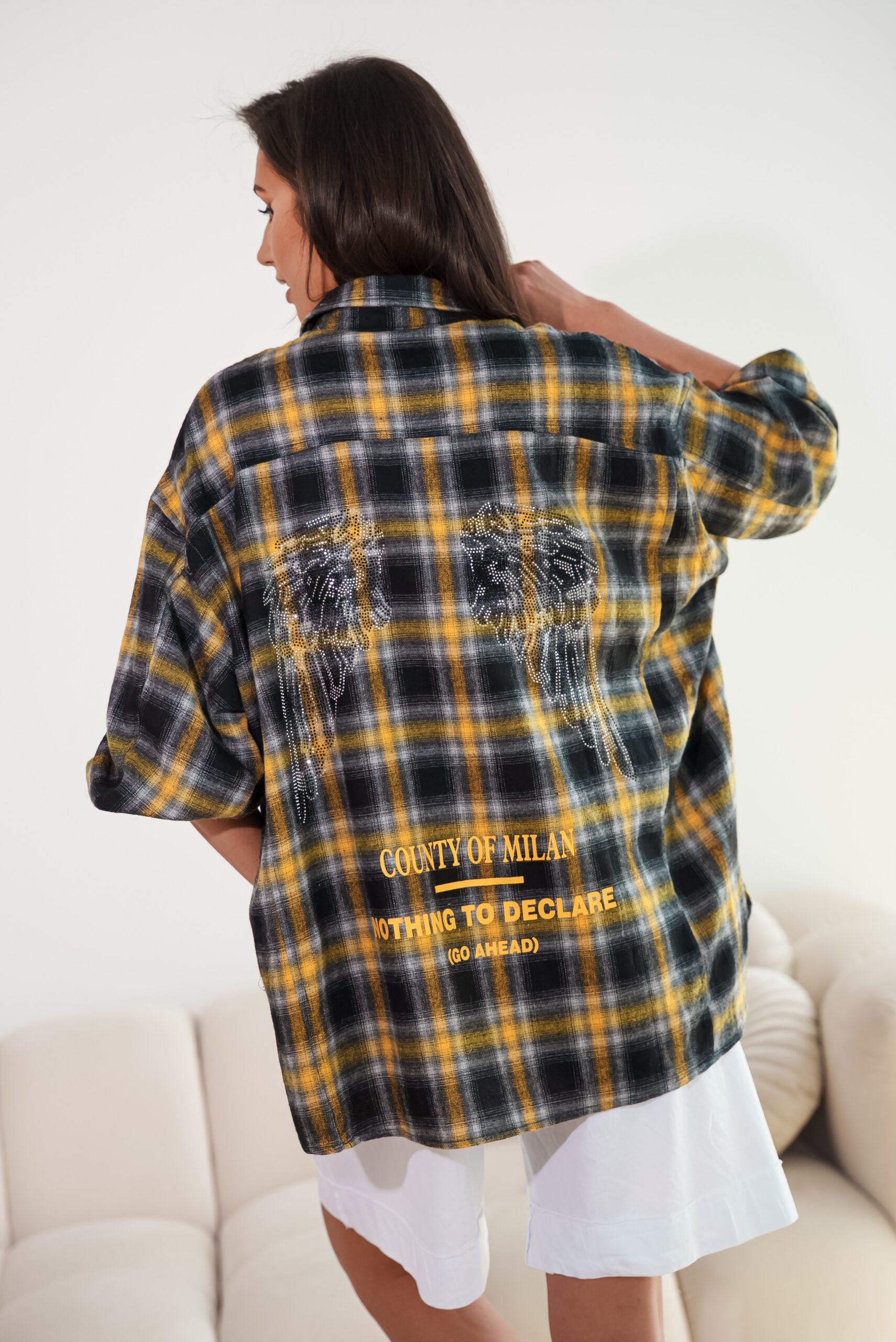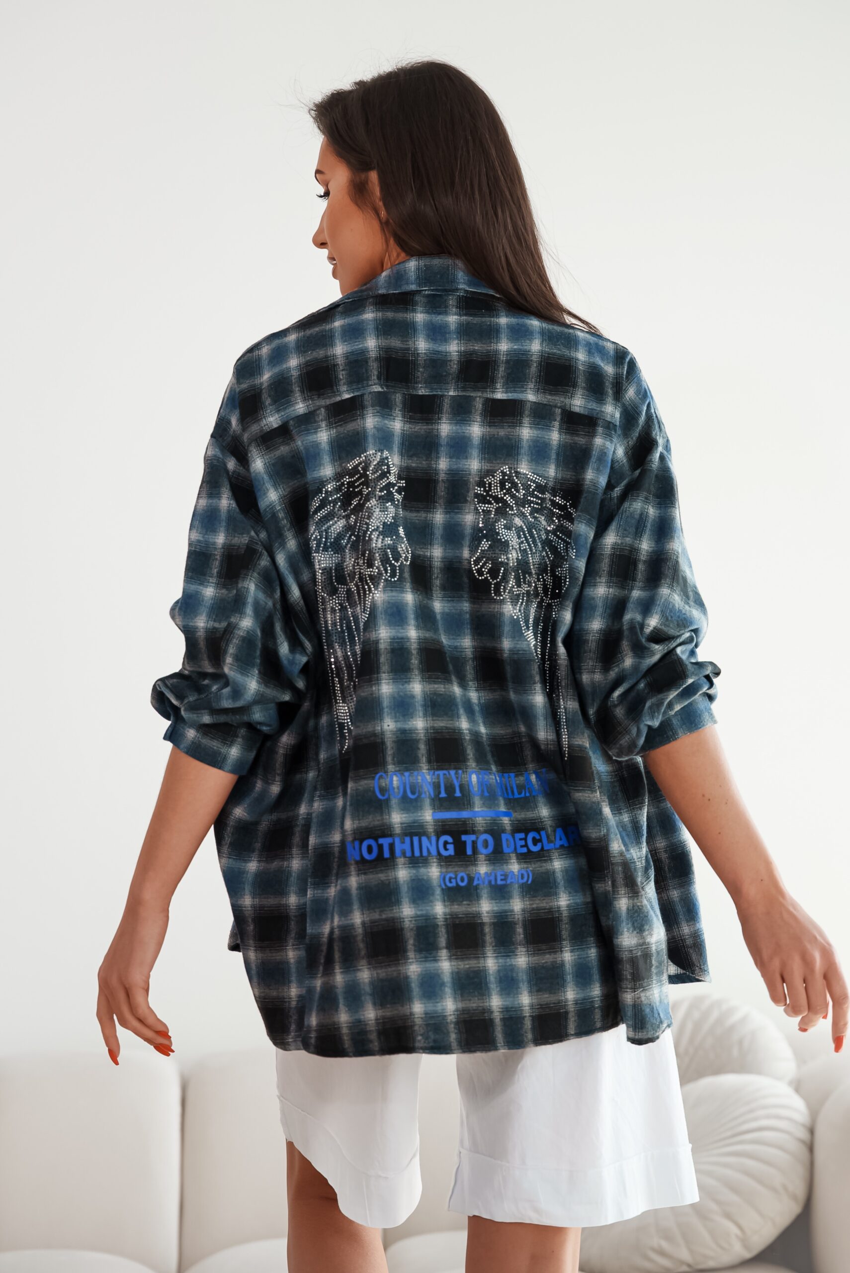 ŁAP OKAZJĘ!!! Oversize’owa, przedłużana koszula z bawełnianego materiału w kratę z dodatkiem elastanu. Rękaw długi. Unikatowa aplikacja na plecach w postaci skrzydeł z dżetów oraz napis!!! To klasyczna koszula z pazurem!!! Zapinana na małe guziki. Klasyka, moda i szyk z odrobiną nowoczesności i frywolności. KOSZULA FASON OVERSIZE!!!