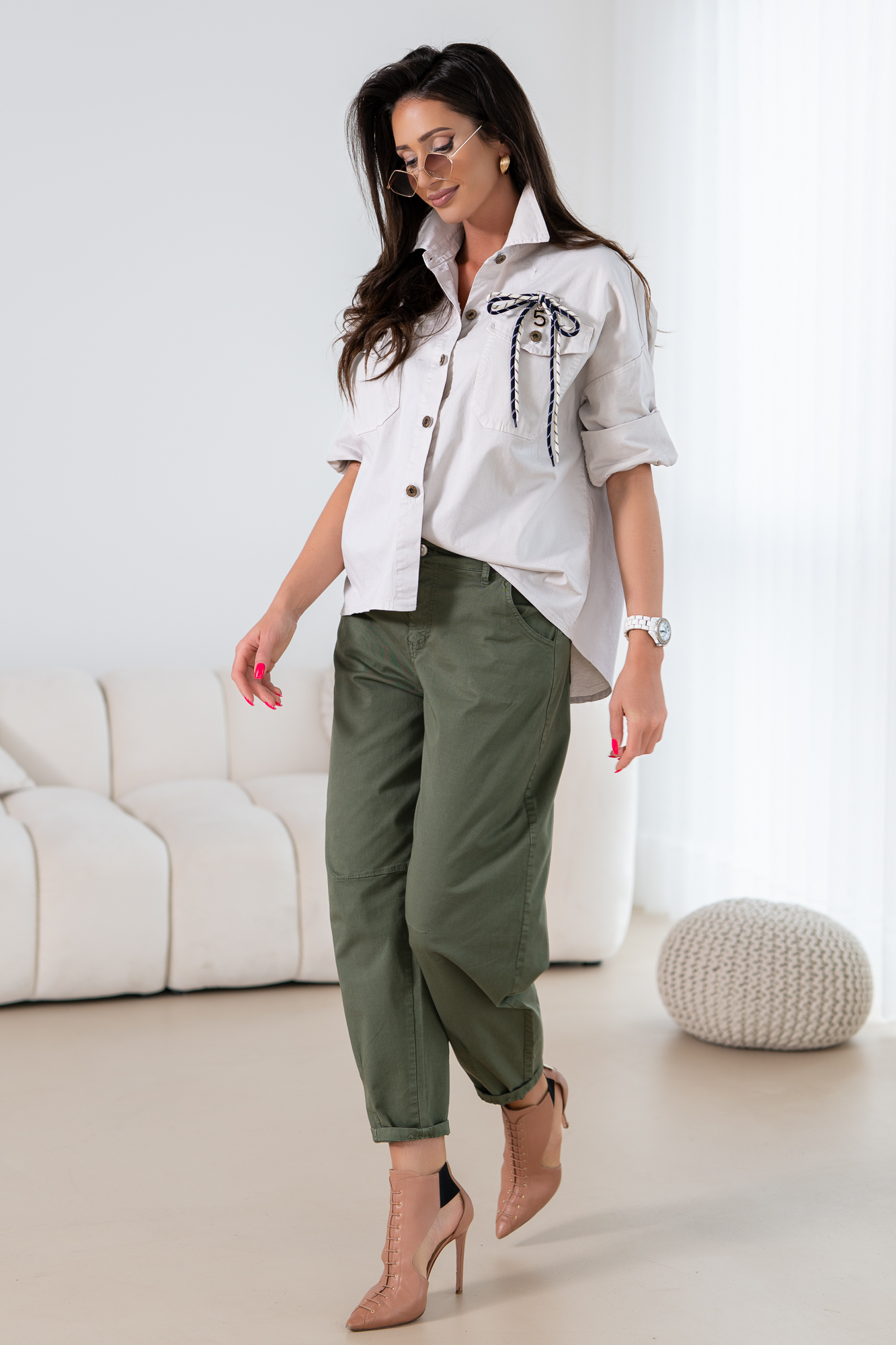 Wyjątkowa koszula oversize, która łączy w sobie niepowtarzalny styl i luksusowy komfort. Wykonana z najwyższej jakości materiału, koszula ta zapewnia swobodę ruchów i przyjemne uczucie przez cały dzień. Koszula pasuje do każdej sylwetki, sprawia, że jest to doskonały element garderoby, który musisz mieć. Stylowy fason podkreślą Twój unikalny styl. FASON OVERSIZE! Broszka w postaci kokardy odpinana.
