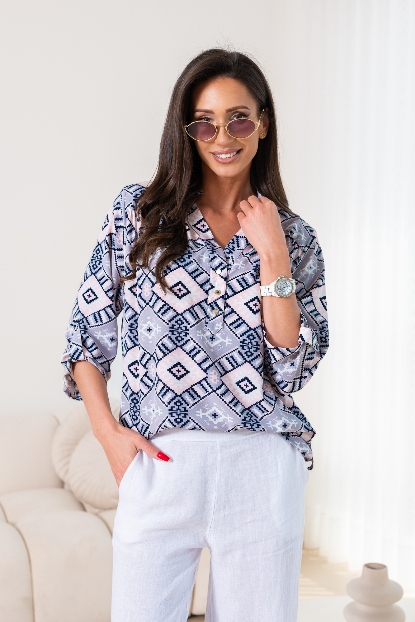 Bluzeczka z ciekawą kolorystyką. Rękaw średniej długości z możliwością skrócenia poprzez podpięcie na guzik, prosty krój. Wykonana z miłego w dotyku, wysokiej jakości materiału. Uniwersalny model i fason sprawdzi się na wiele okazji. Rozmiary od 38 do 48. Jakość PREMIUM – POLSKA PRODUKCJA! Pasuje do spodni , leginsów, spódniczek – na każdą okazję!