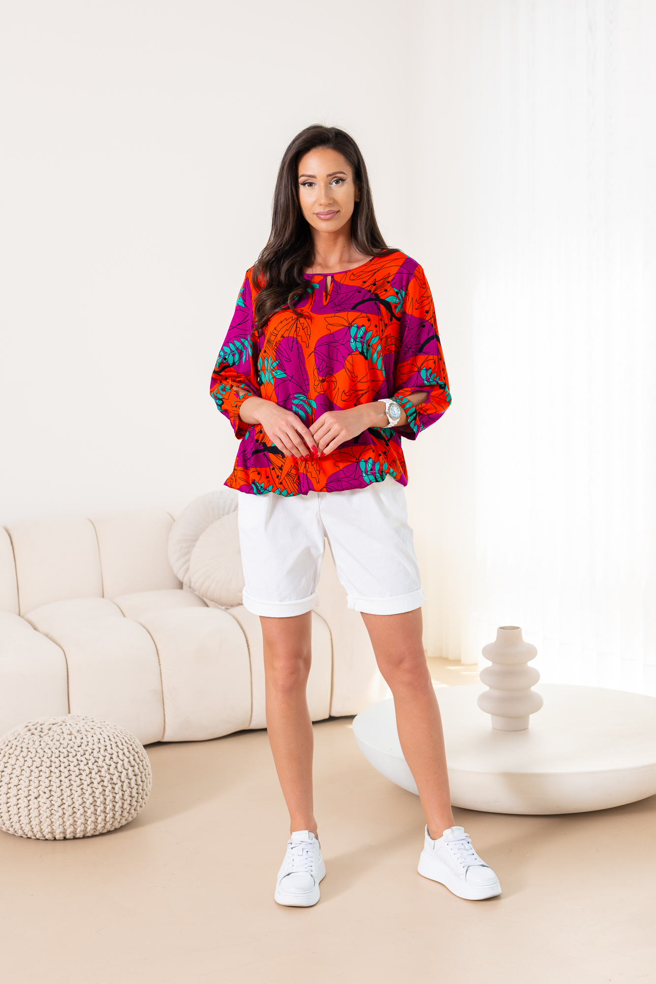 Bluzeczka z ciekawą kolorystyką. Rękaw średniej długości z możliwością skrócenia poprzez podpięcie na guzik, prosty krój. Wykonana z miłego w dotyku, wysokiej jakości materiału. Uniwersalny model i fason sprawdzi się na wiele okazji. Rozmiary od 38 do 48. Jakość PREMIUM – POLSKA PRODUKCJA! Pasuje do spodni , leginsów, spódniczek – na każdą okazję!