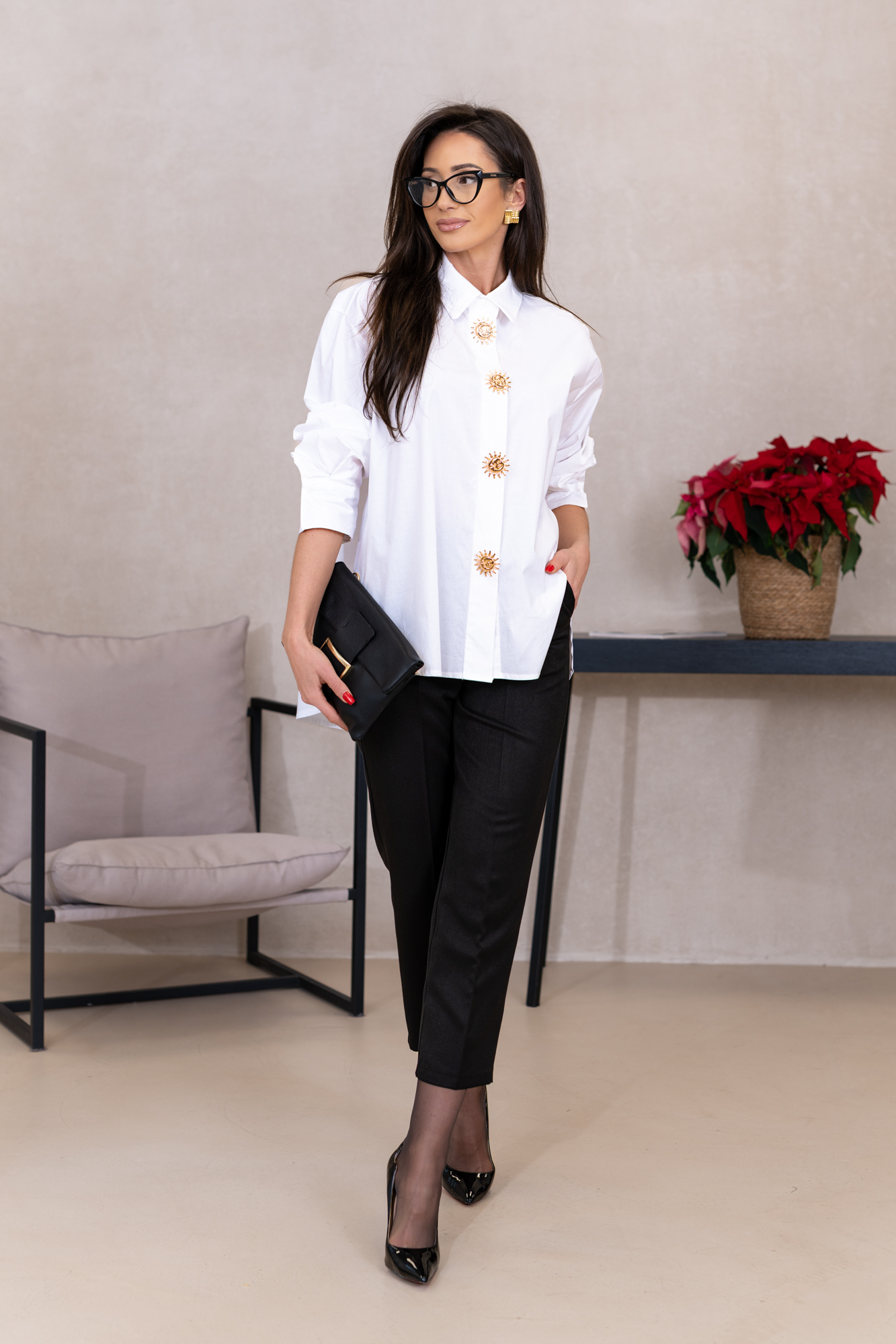Wyjątkowa koszula oversize, która łączy w sobie niepowtarzalny styl i luksusowy komfort. Wykonana z najwyższej jakości materiału, koszula ta zapewnia swobodę ruchów i przyjemne uczucie przez cały dzień. Koszula pasuje do każdej sylwetki, sprawia, że jest to doskonały element garderoby, który musisz mieć. Stylowy fason podkreślą Twój unikalny styl. FASON OVERSIZE! Broszki w postaci słońca są odpinane.