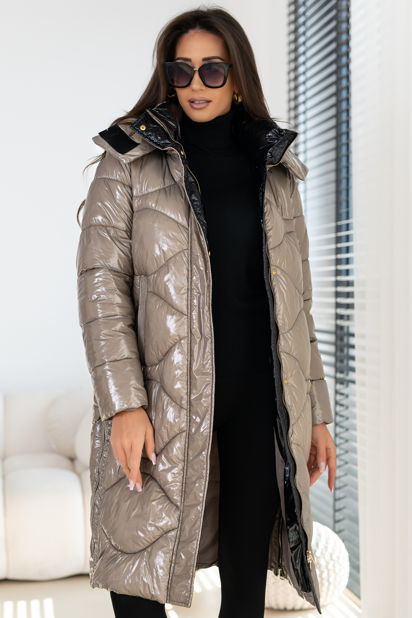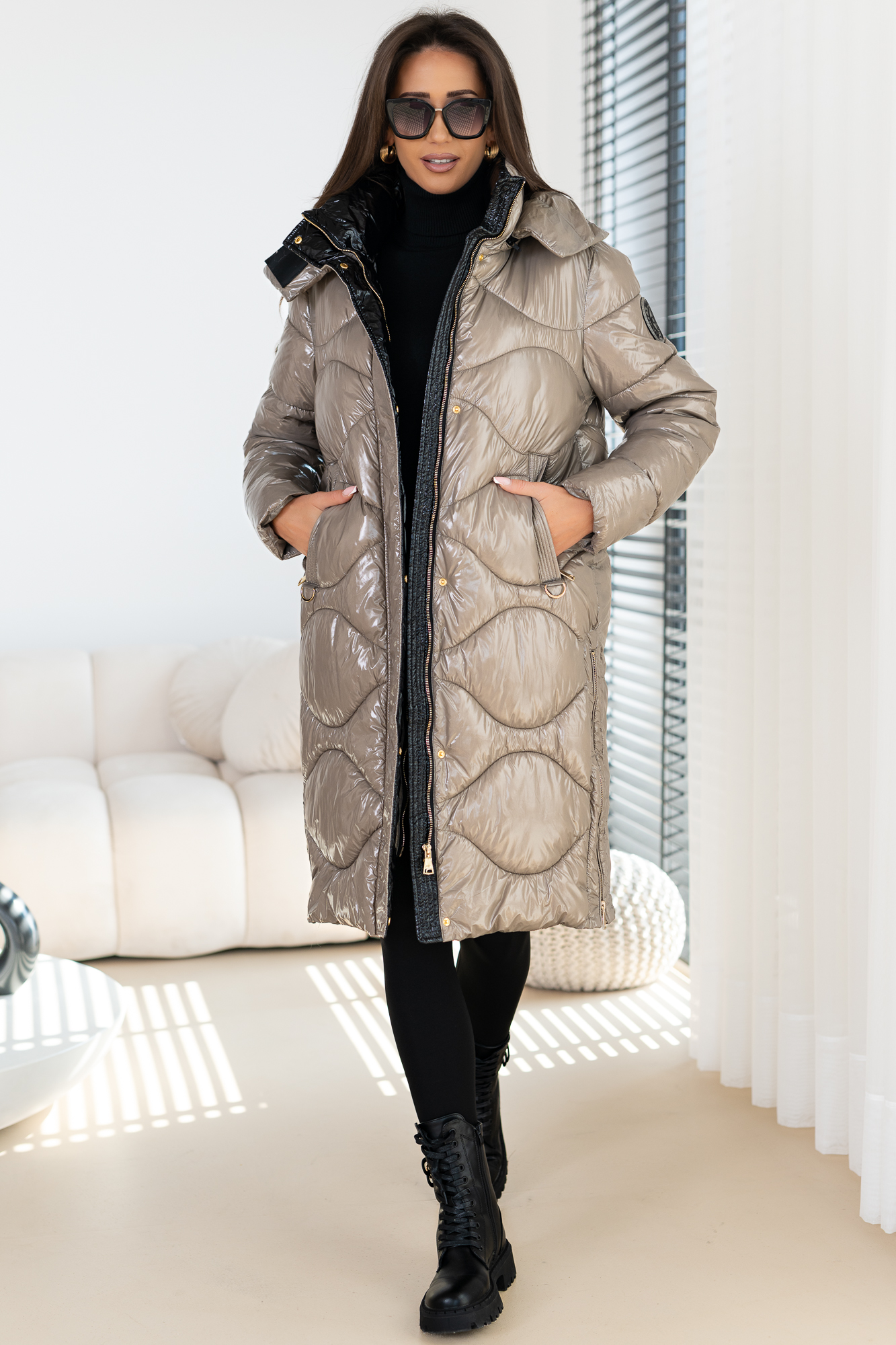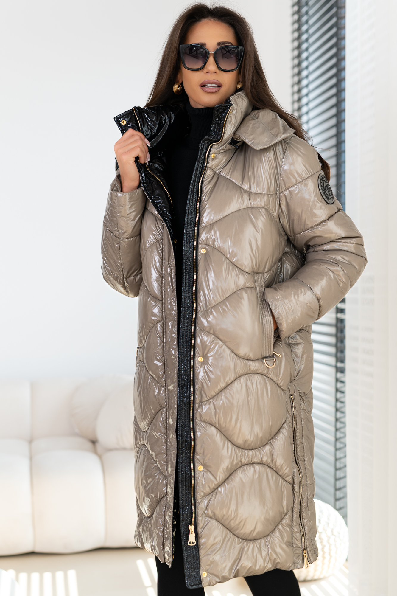 Zanurz się w luksusie i otul ciepłem w tej wyjątkowej, długiej kurtce puchowej! Jej niepowtarzalny, delikatny odcień fango i kolor czarny harmonijnie łączy się z błyszczącymi detalami, tworząc zachwycającą całość. Wykonana z najwyższej jakości materiałów, ta kurtka nie tylko wspaniale wygląda, ale również zapewnia niezrównany komfort i ochronę przed zimnem, nawet w najmroźniejsze dni.