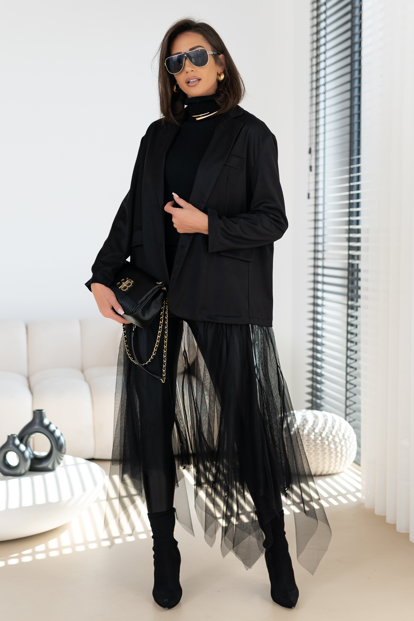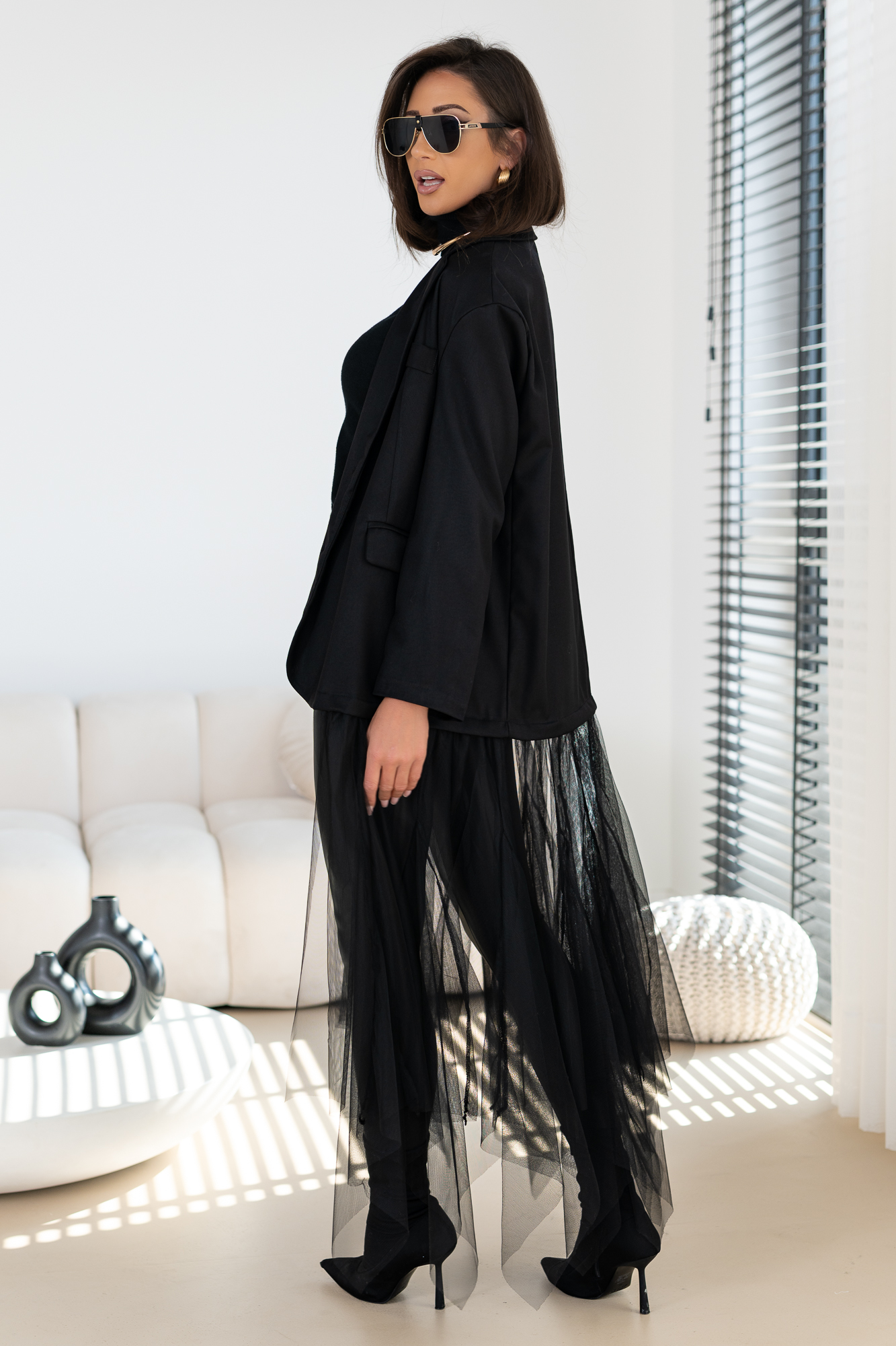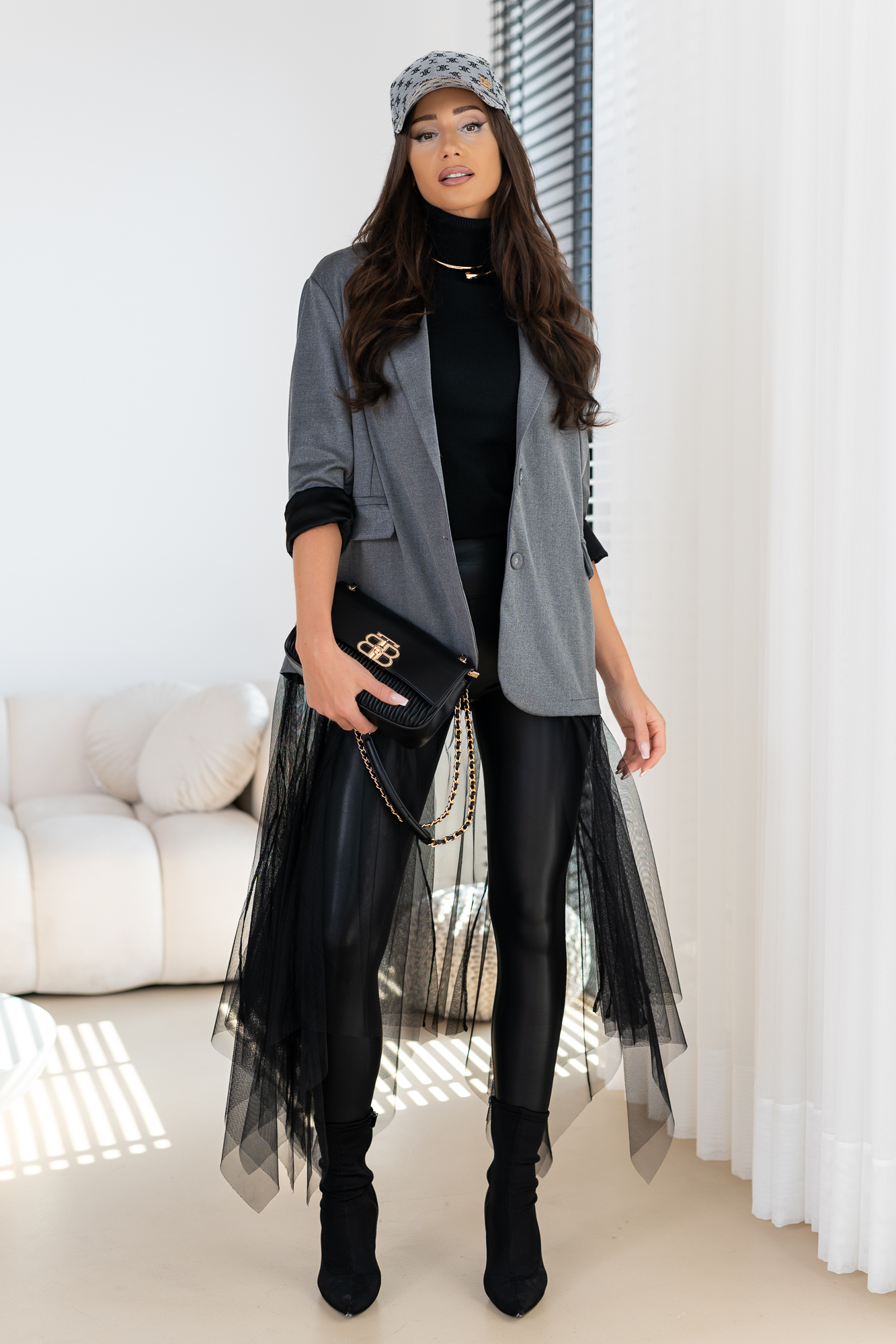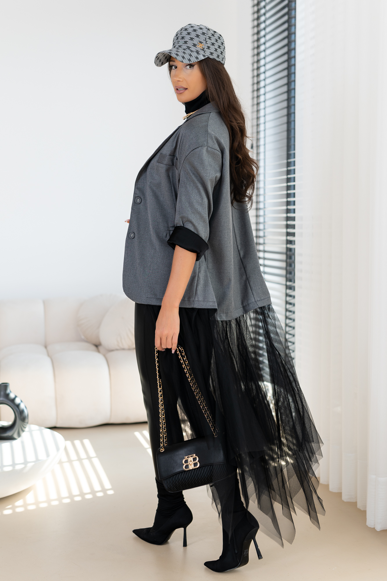 Genialna Marynarka w kolorze szarym i czarnym  – WTRÓŻNIJ SIE Z TŁUMU, POKAŻ SWOJĄ OSOBOWOŚĆ. Marynarka posiada podszewkę oraz poduszeczki na ramionach. a jej dół to frywolna tiulowa spódnica. Ten typ marynarki to totalny Must Have  tego sezonu! Duży obszerny oversize – casualowy fason!