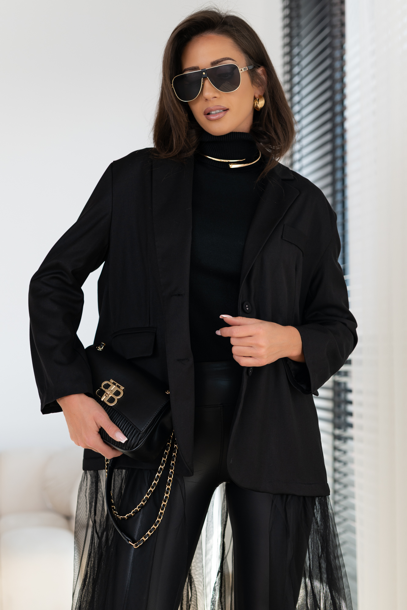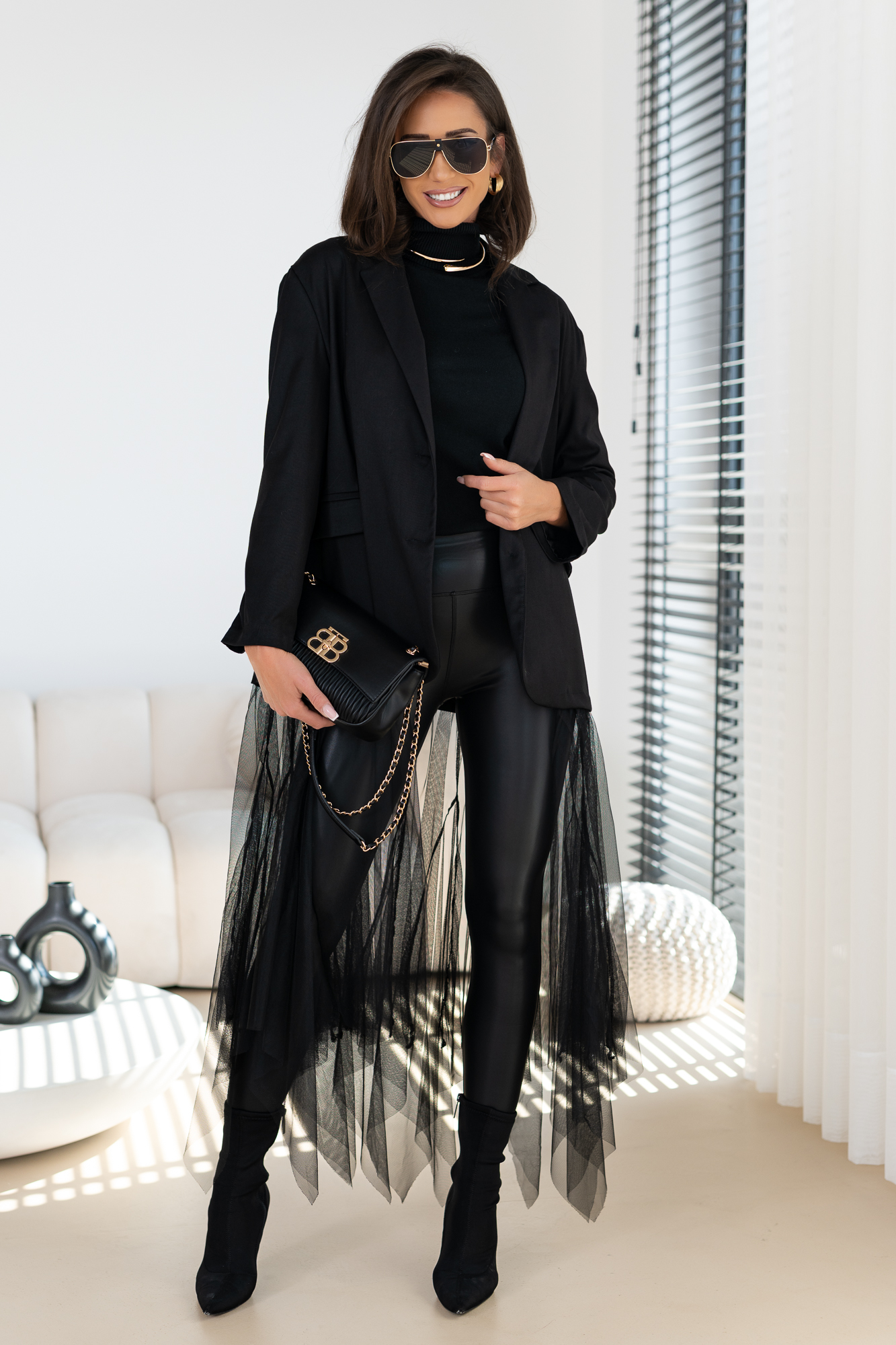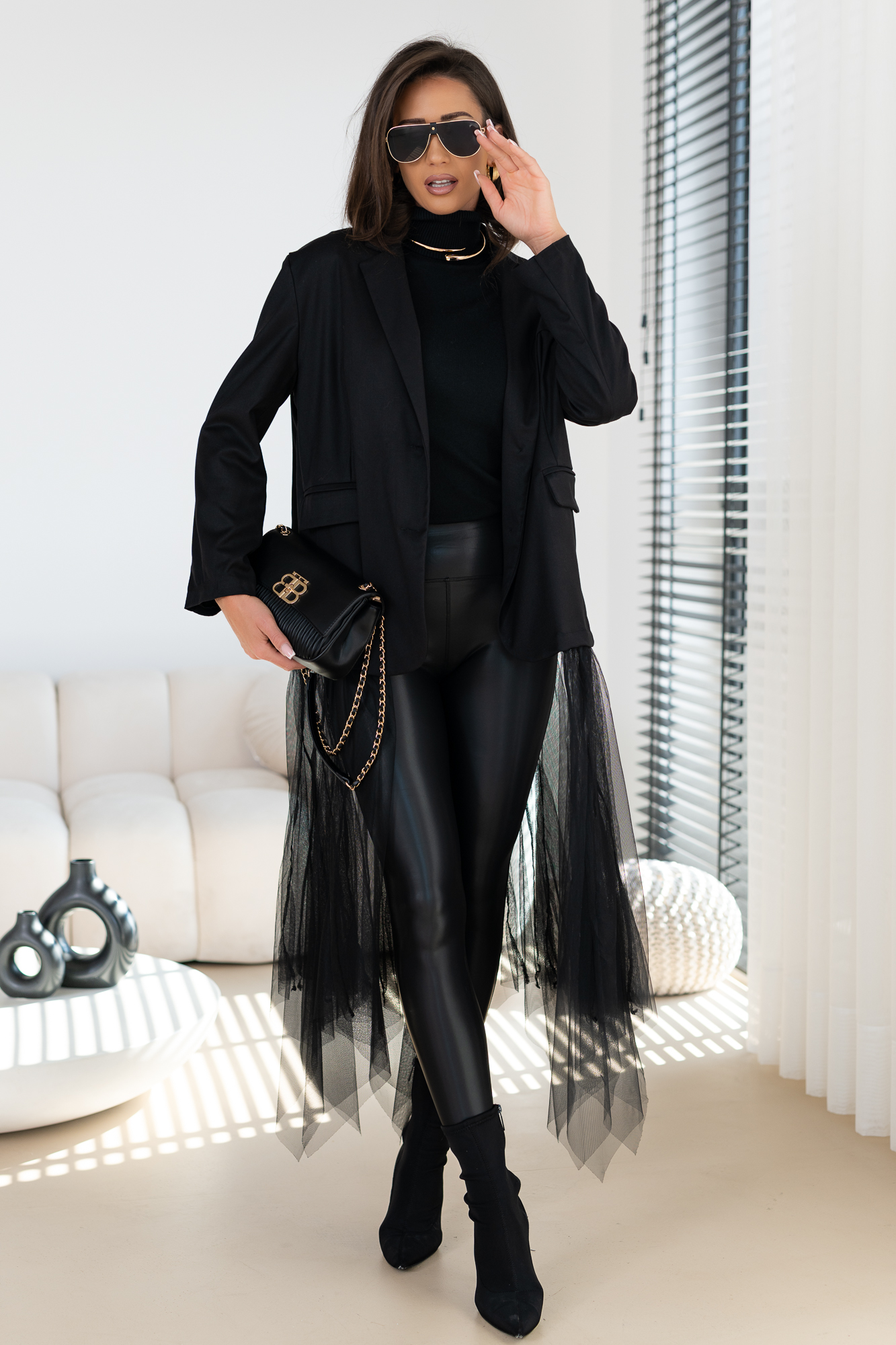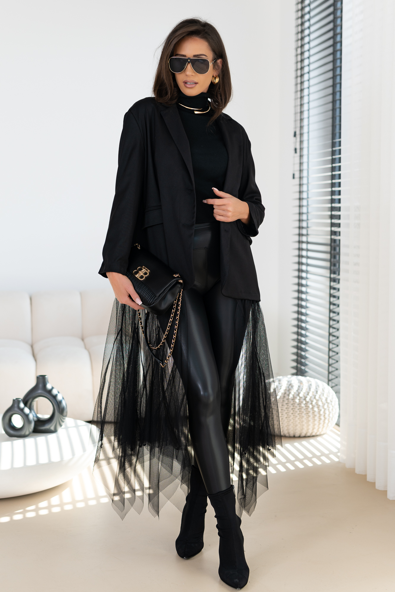 Genialna Marynarka w kolorze szarym i czarnym  – WTRÓŻNIJ SIE Z TŁUMU, POKAŻ SWOJĄ OSOBOWOŚĆ. Marynarka posiada podszewkę oraz poduszeczki na ramionach. a jej dół to frywolna tiulowa spódnica. Ten typ marynarki to totalny Must Have  tego sezonu! Duży obszerny oversize – casualowy fason!
