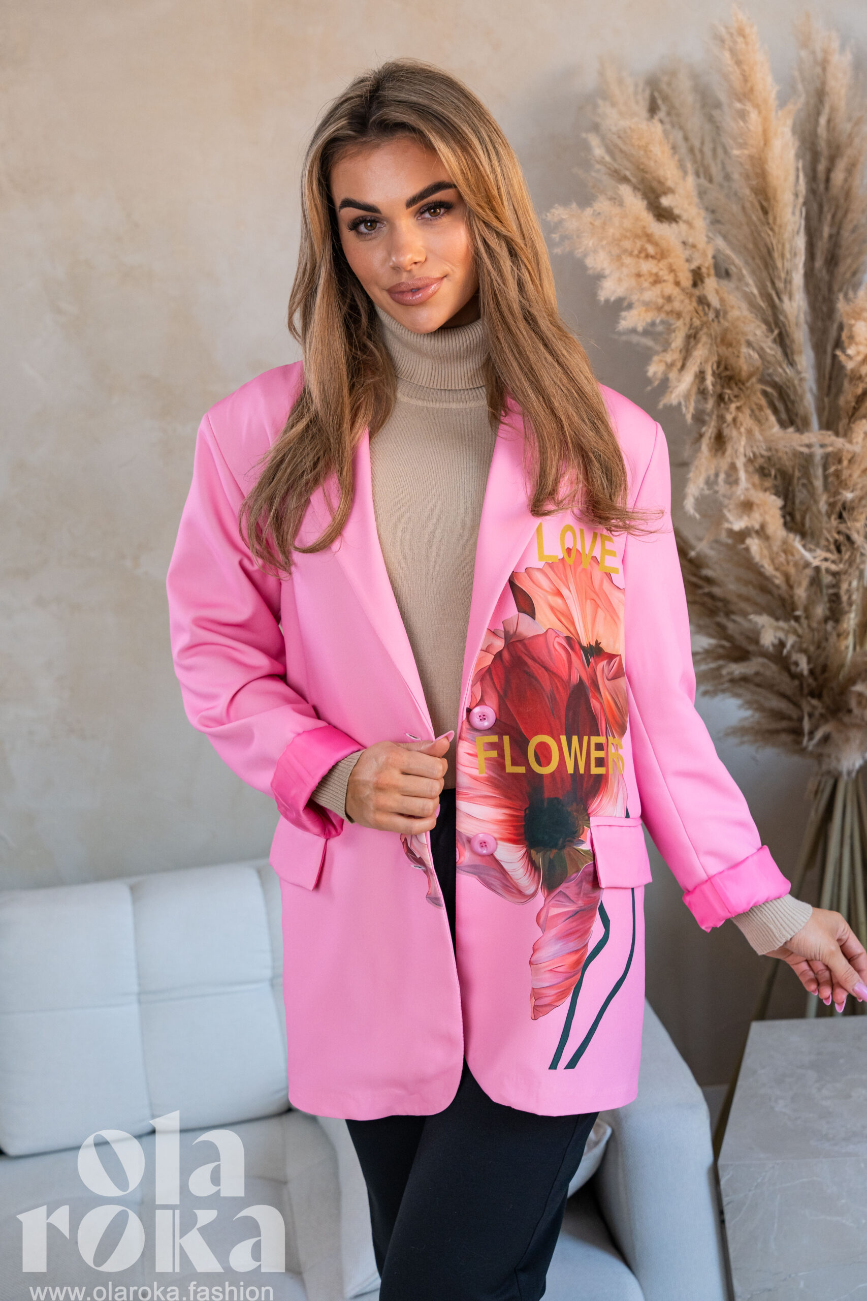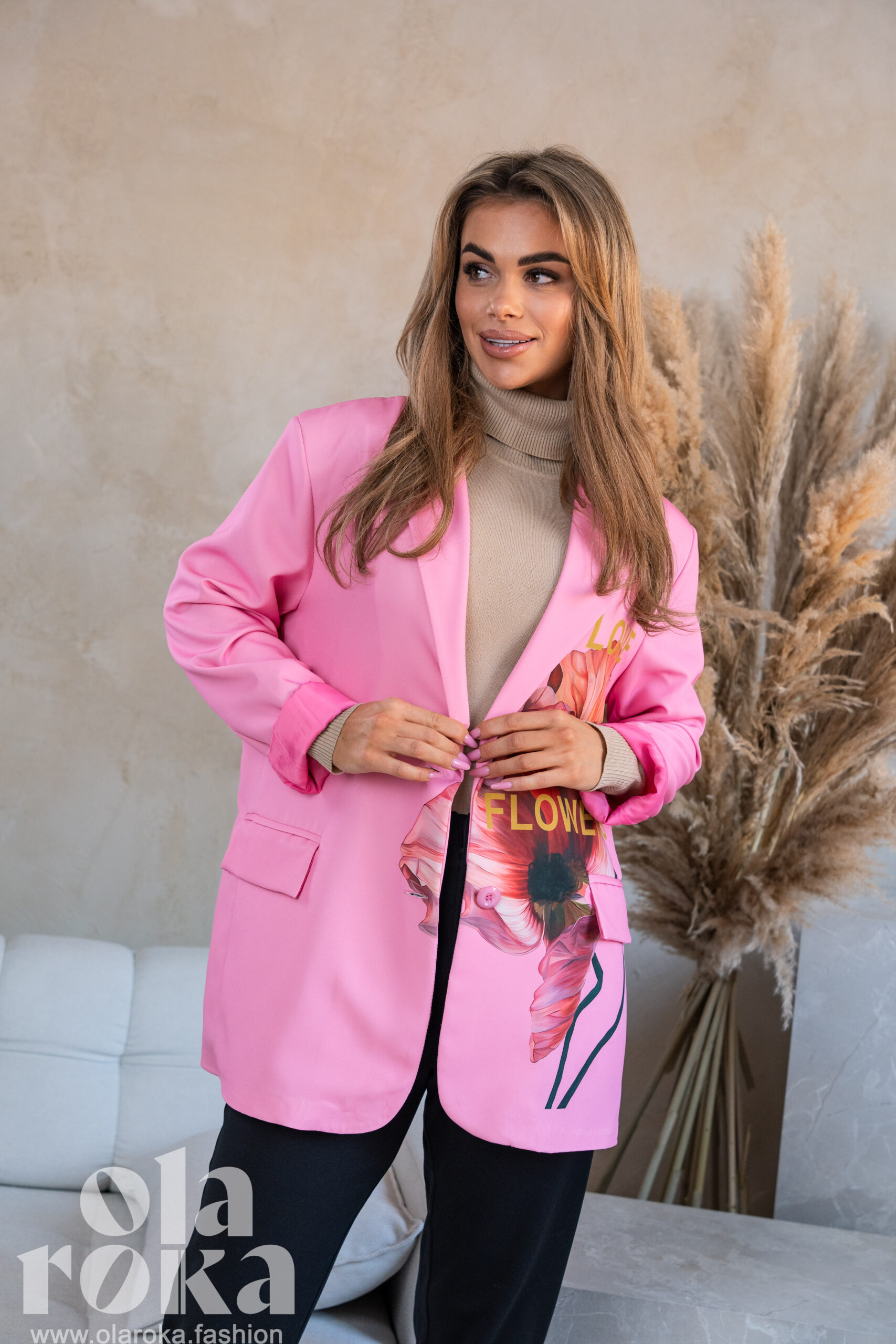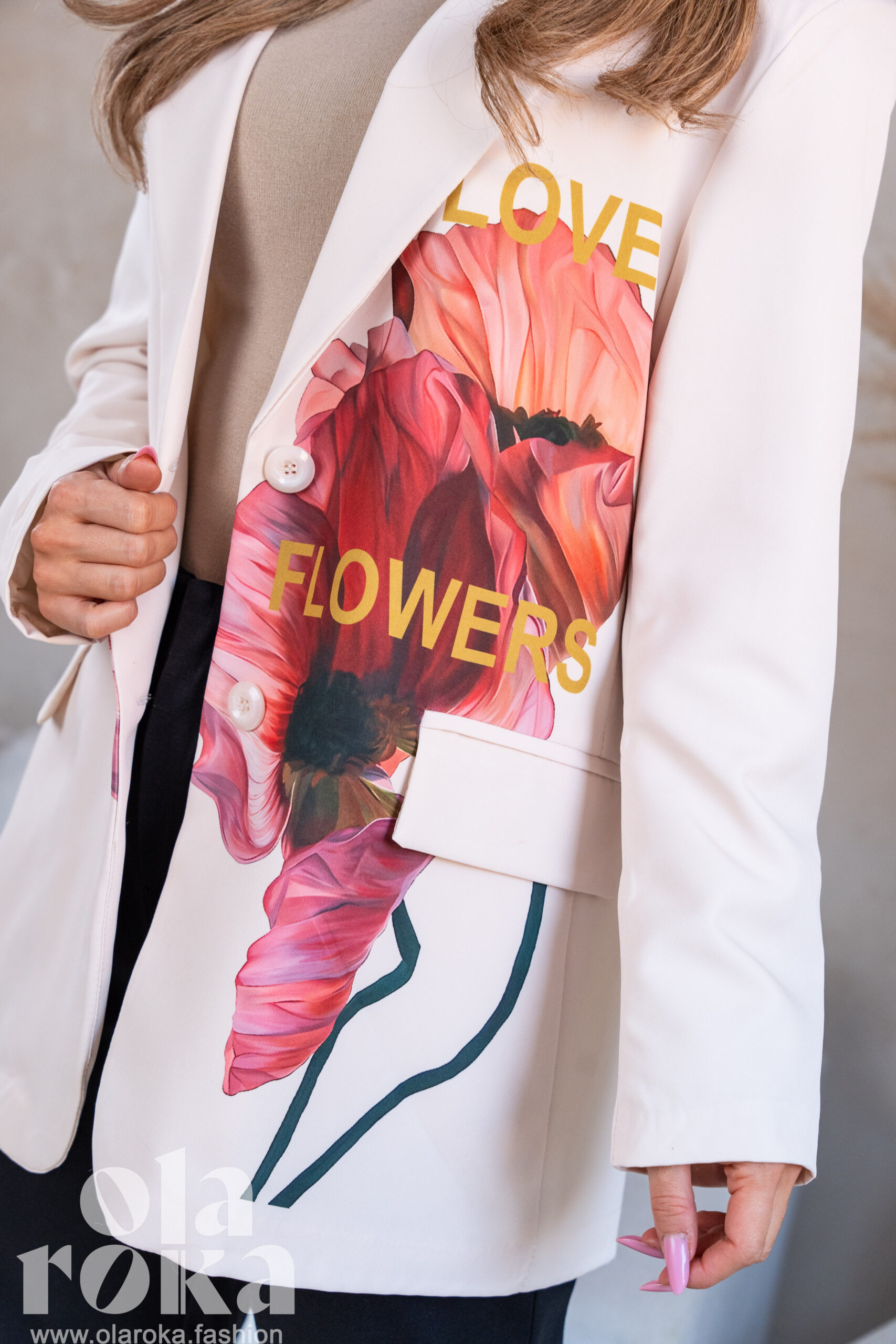 Marynarka z artystycznymi nadrukami kwiatowymi, które dodają wyjątkowego charakteru każdej stylizacji.