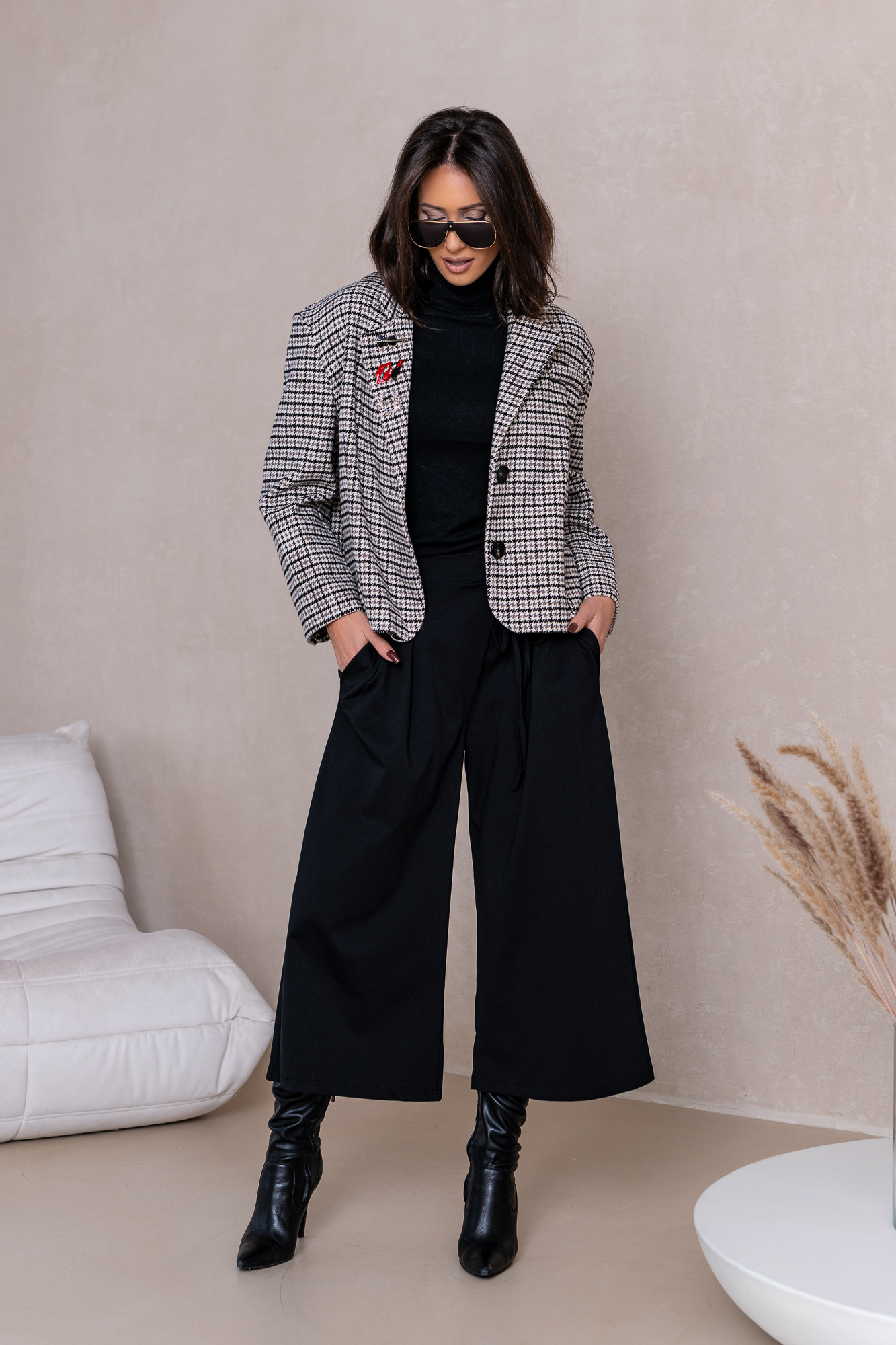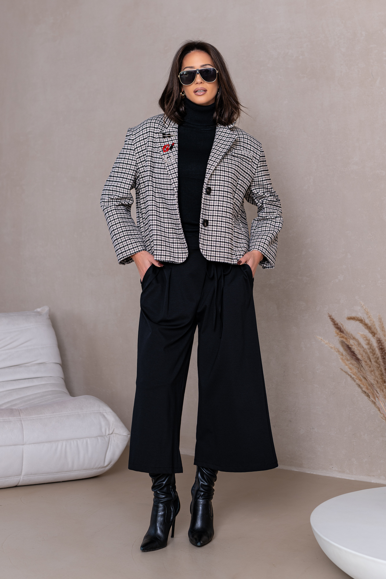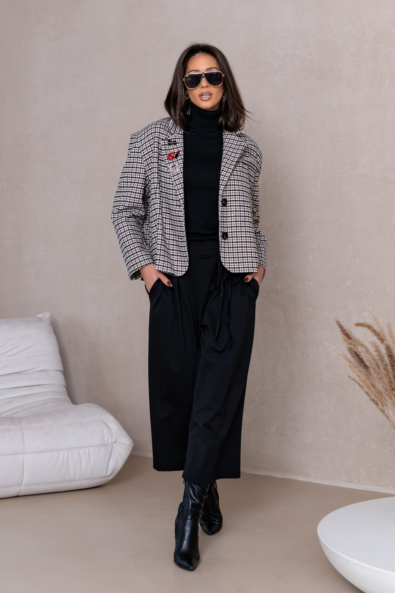 Genialna Marynarka w czarną delikatną kratę.  Marynarka posiada podszewkę oraz poduszeczki na ramionach a ozdoby na niej to broszki. Ten typ marynarki to totalny Must Have  tego sezonu! Duży obszerny oversize – casualowy fason! Marynarka sprzedawana jest w komplecie z zestawem broszek.