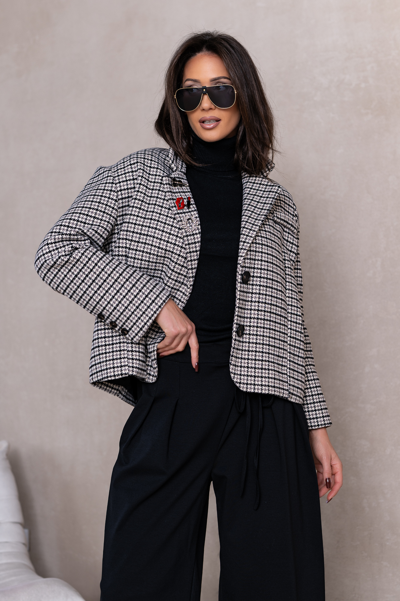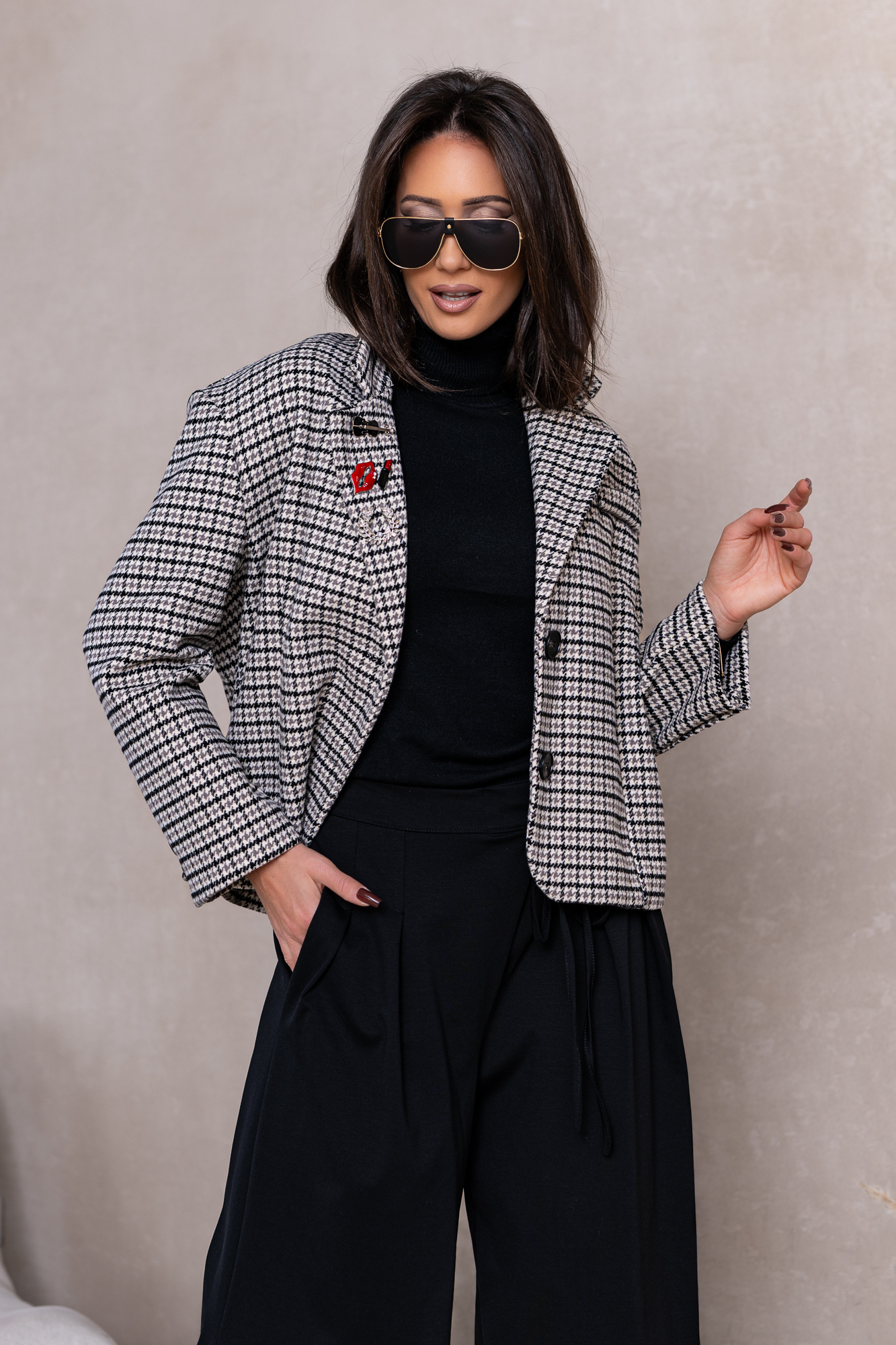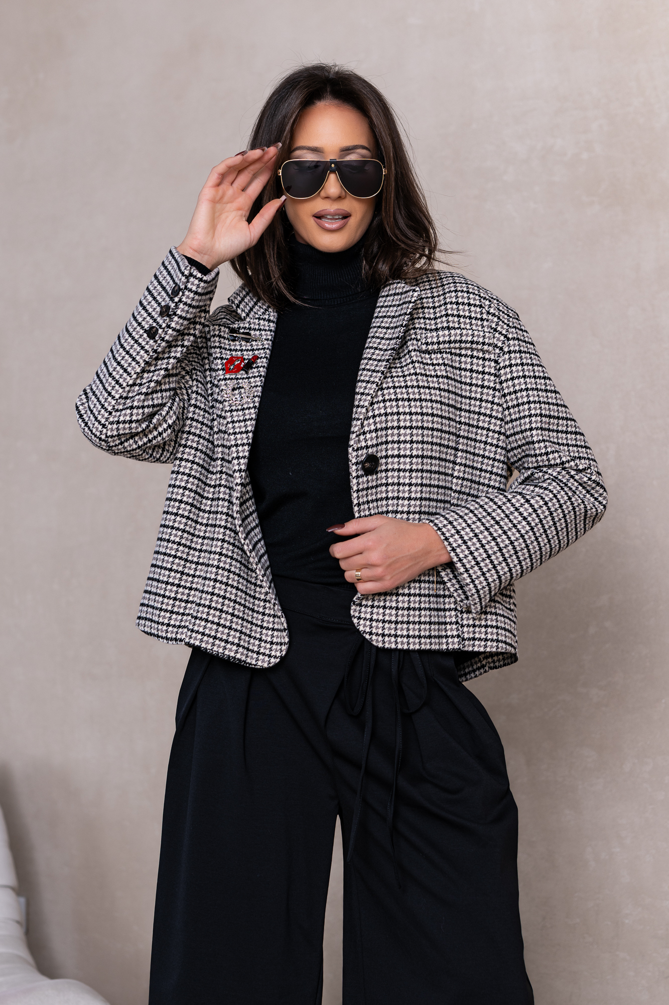 Genialna Marynarka w czarną delikatną kratę i niebanalne ozdoby w formie broszek.