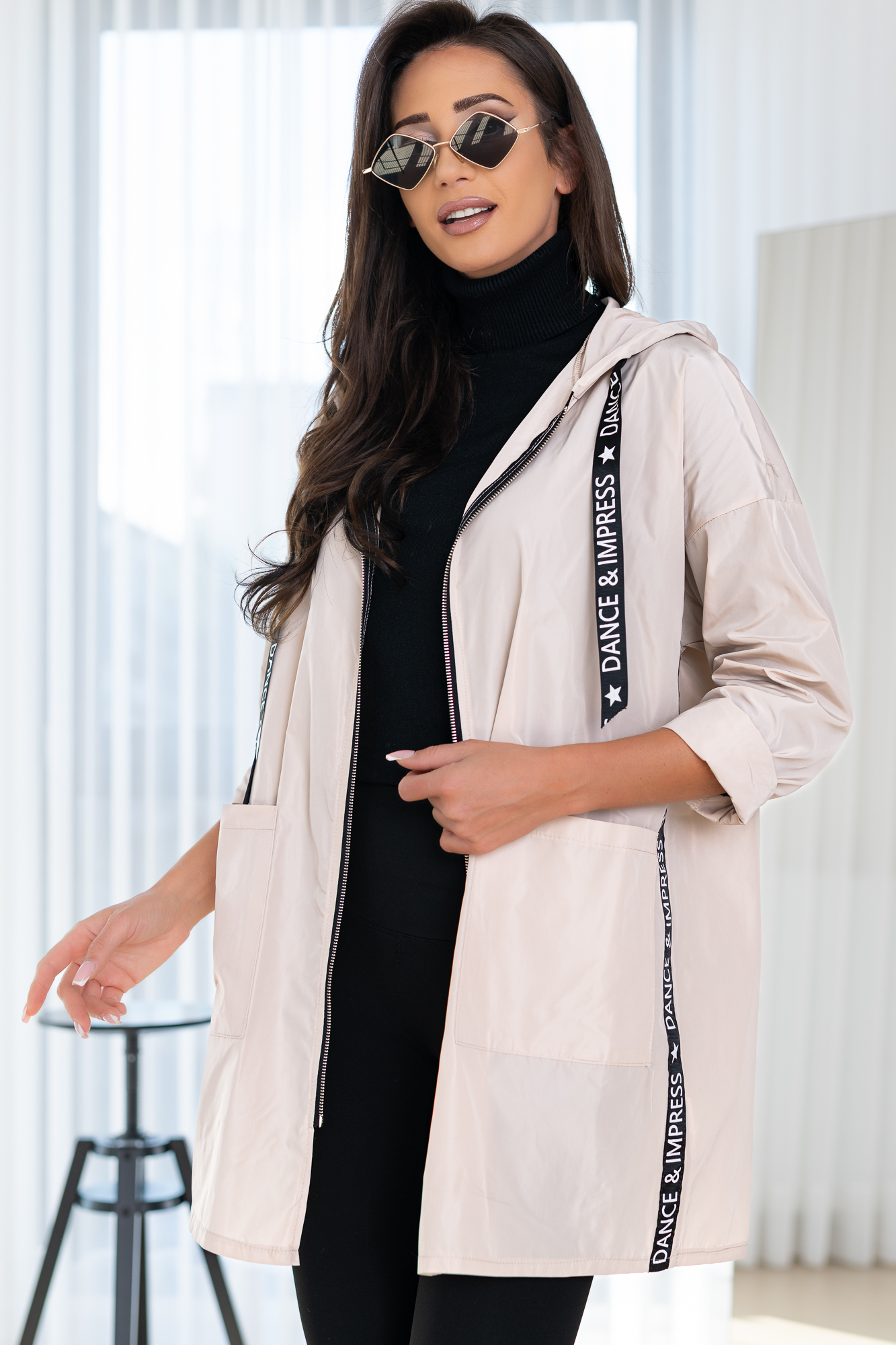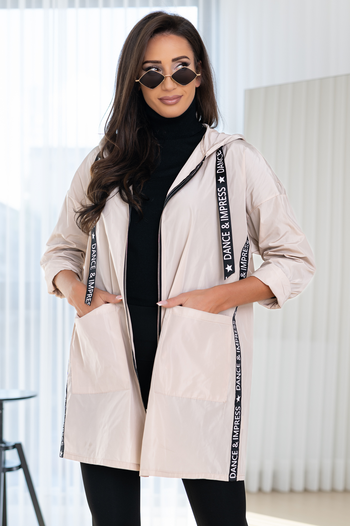 Lekka, parka zapinana na suwak, obszerny kaptur, dwie kieszenie po bokach.