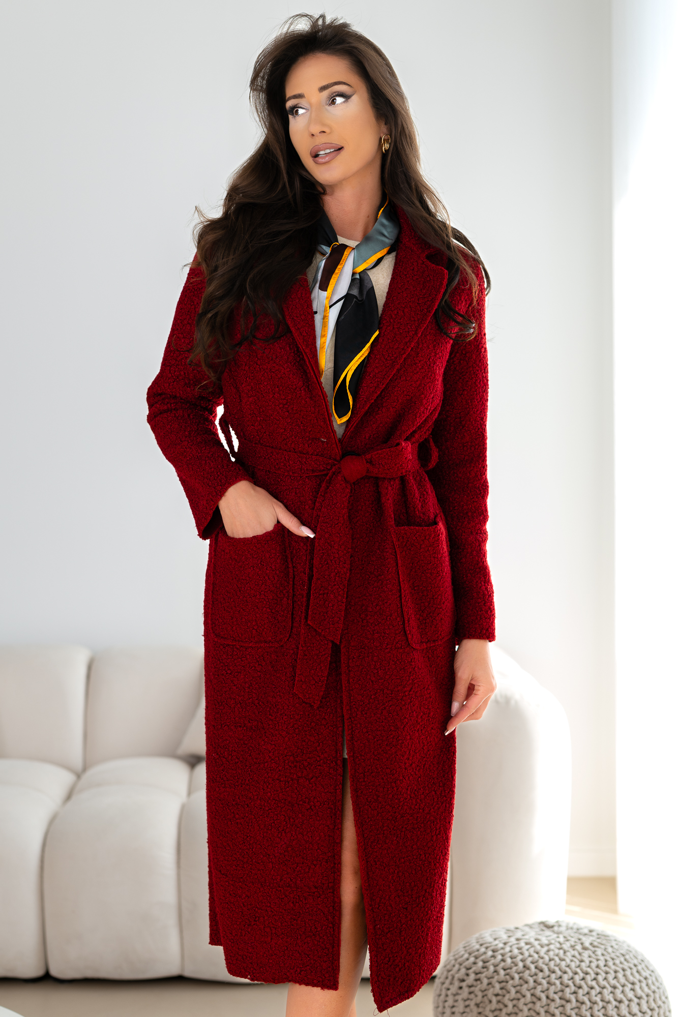 Wyraź swoją wyjątkową elegancję dzięki naszemu płaszczowi w głębokim bordowym kolorze, który stanie się Twoim ulubionym elementem garderoby na chłodniejsze jesienne dni.