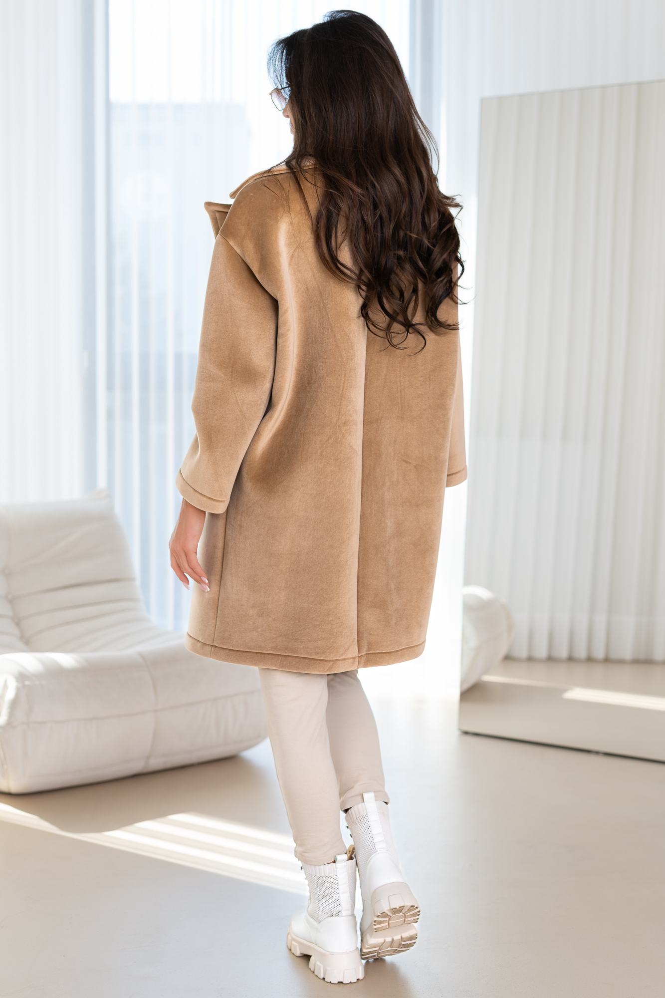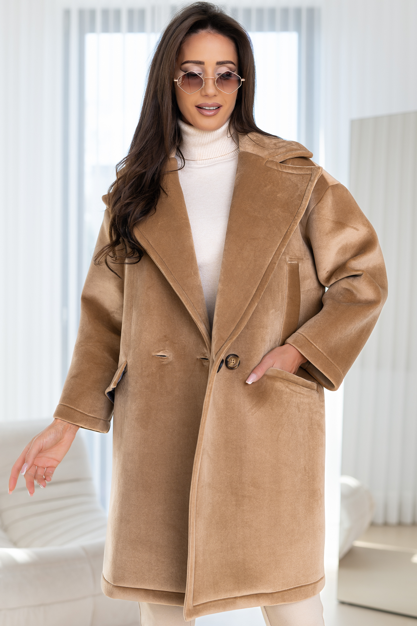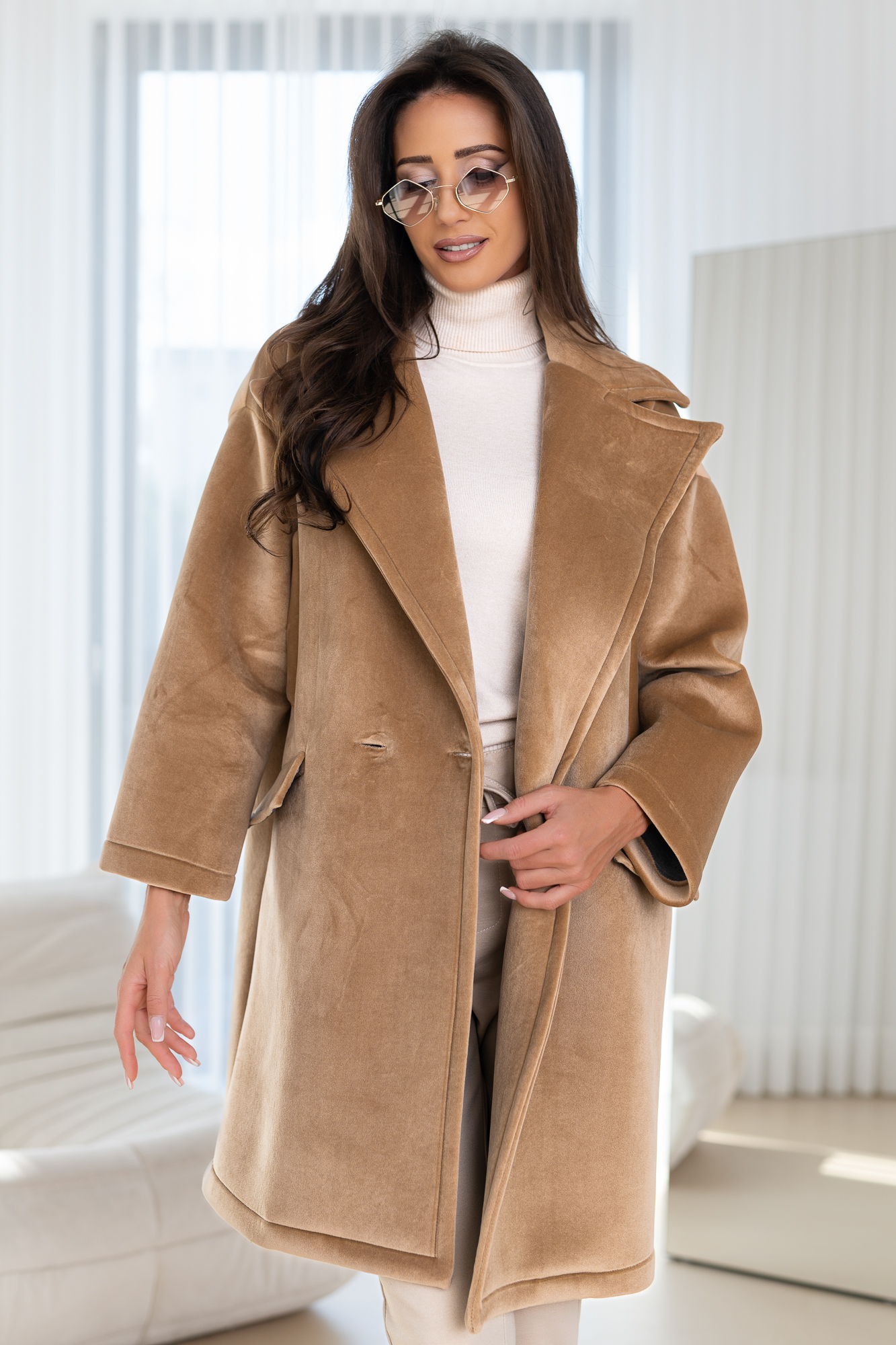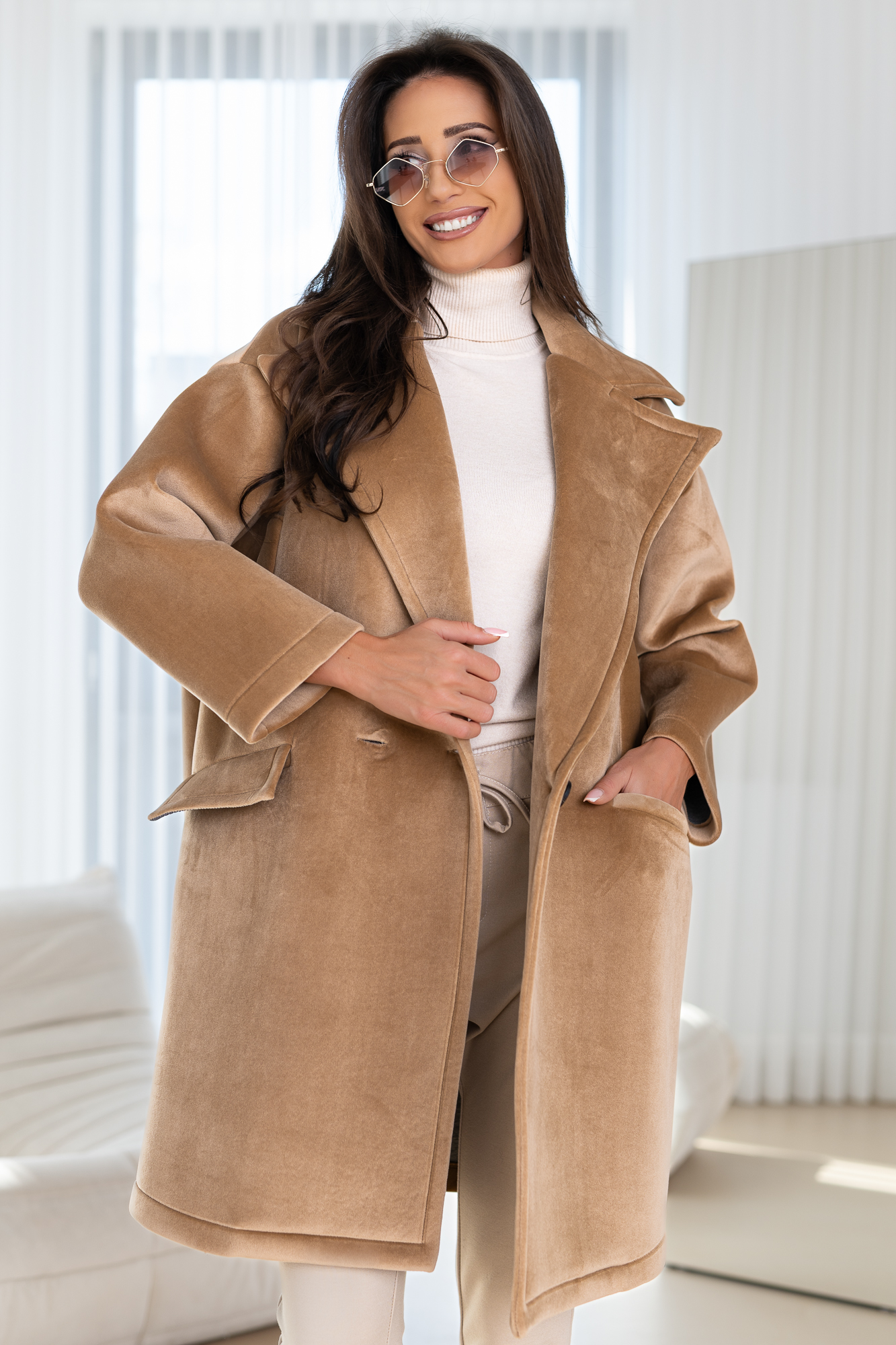 Niezwykle kobiecy, minimalistyczny oraz elegancki model. Jest to propozycja dla kobiet ceniących sobie elegancje oraz wygodę. Prosty krój sprawi że Twoja sylwetka zostanie wysmuklona. Ponadczasowy fason tego modelu sprawi, że będzie Ci służył przez wiele lat. Duży oversize. Oversizowy, elegancki i nowoczesny krój.