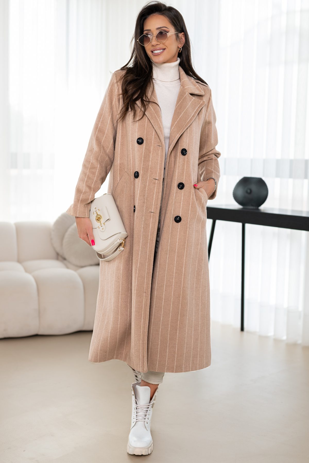 Długi płaszcz z domieszką wełny zapinany na guziki. Model – cudownie otulający ciało w zimne nawet mroźne dni! Płacz w całości na podszewce.