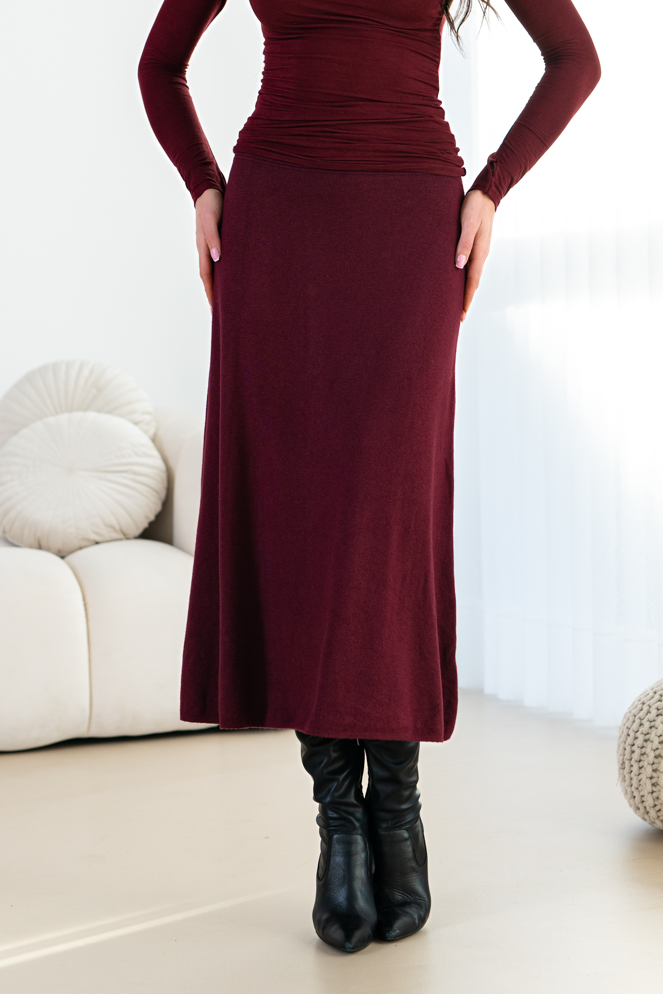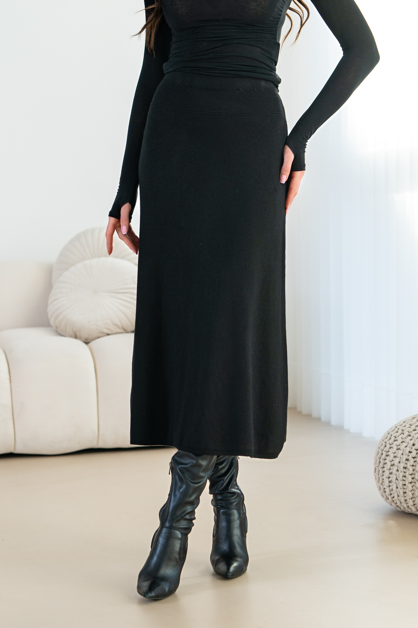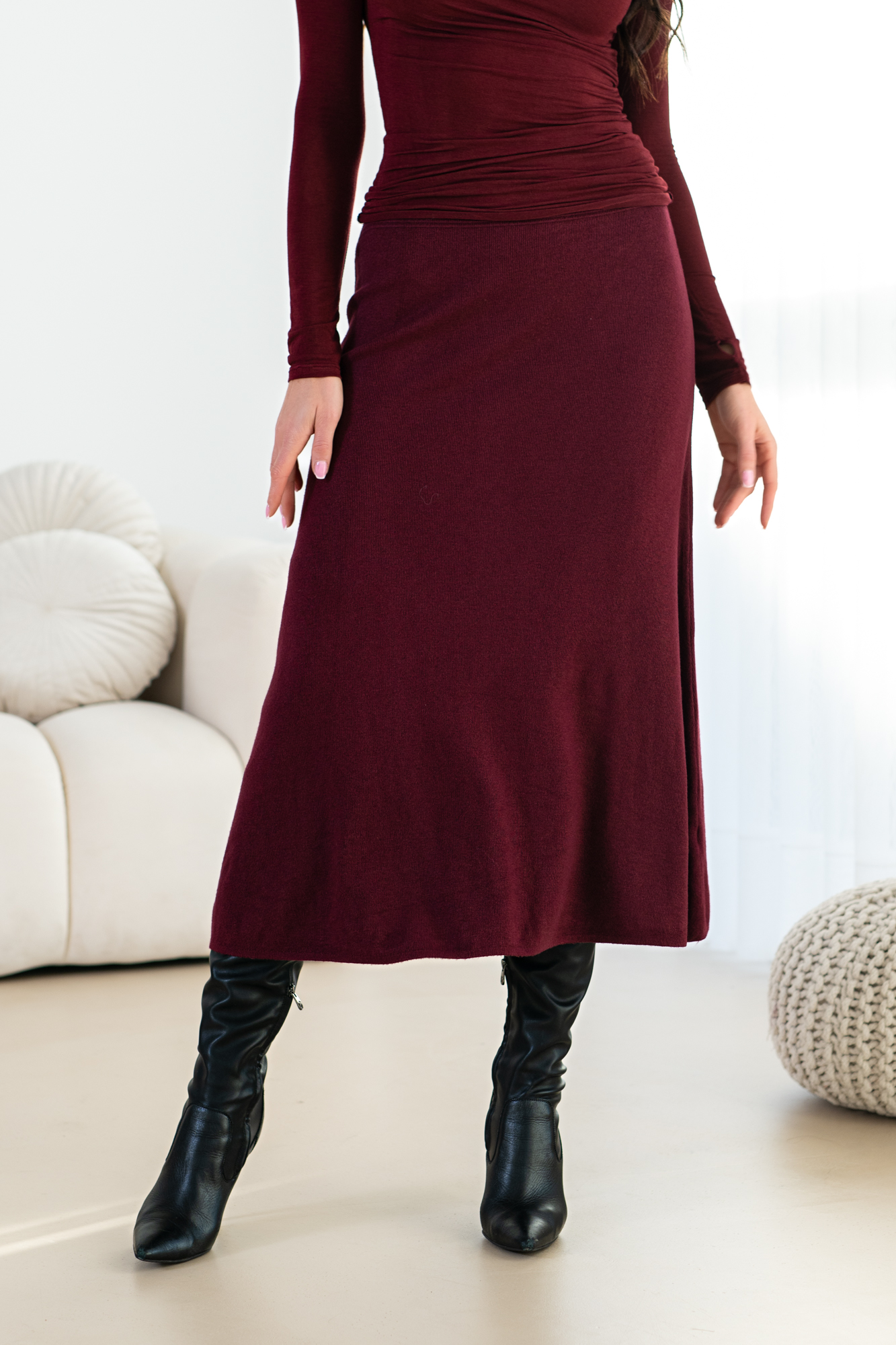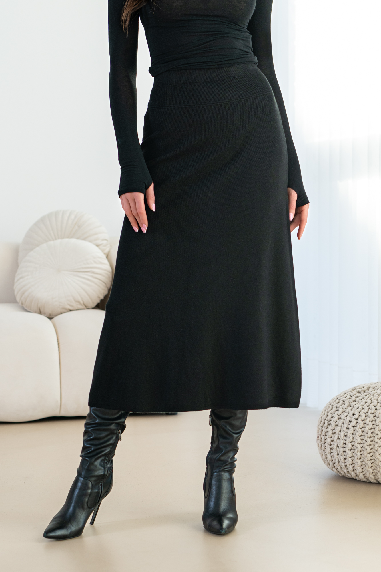 Spódnica średniej długości pięknie otulająca i pracująca na sylwetce. Elastyczna talia z gumką wewnątrz, lekko rozszerzany dół.