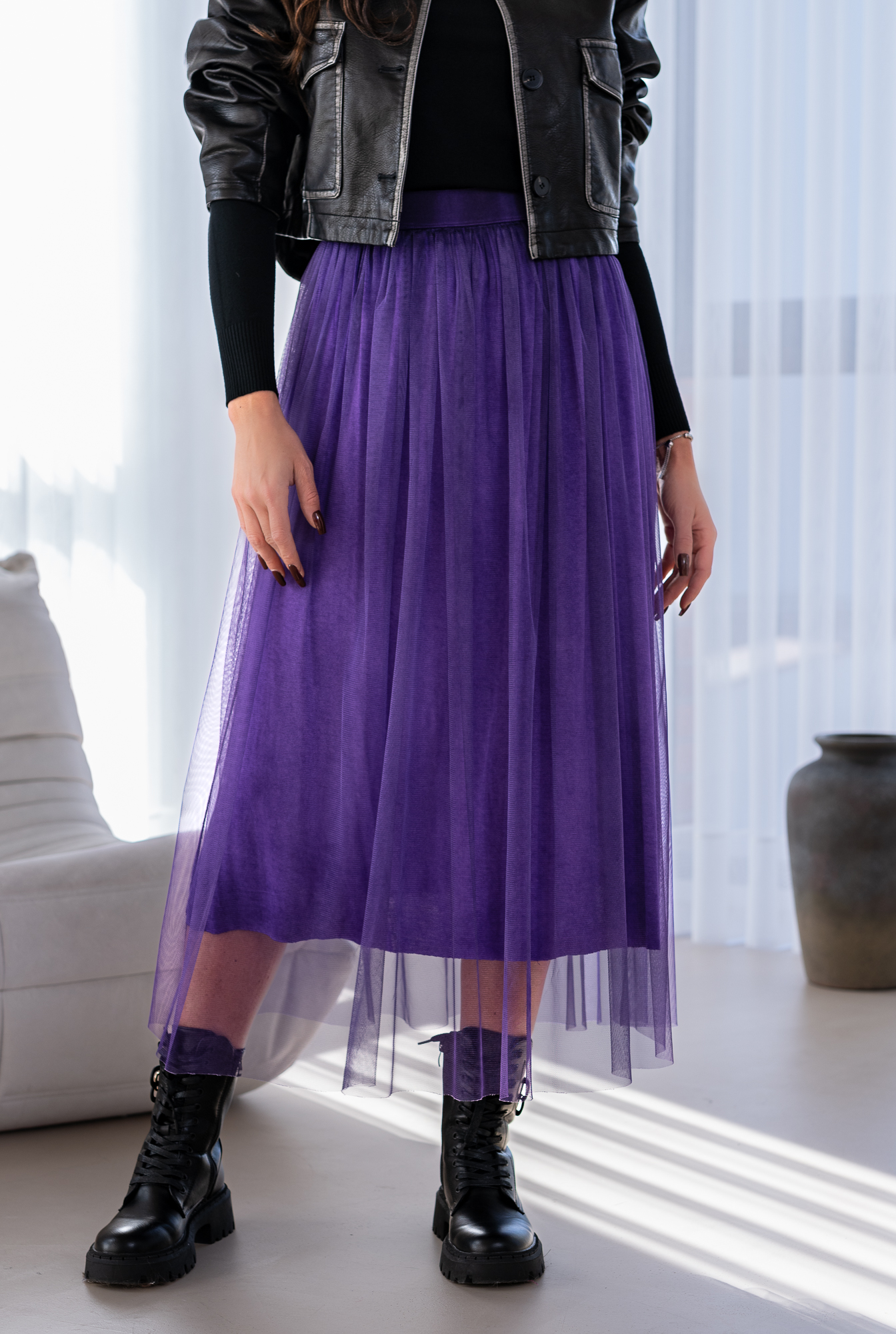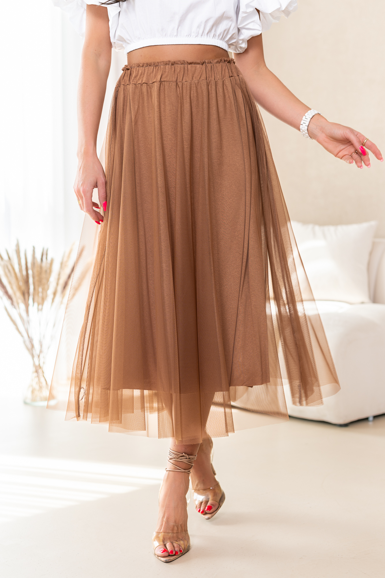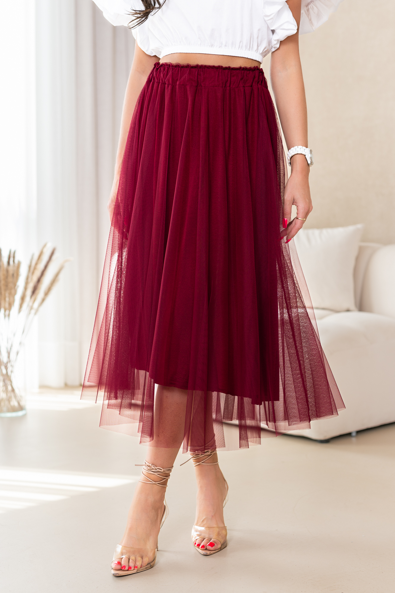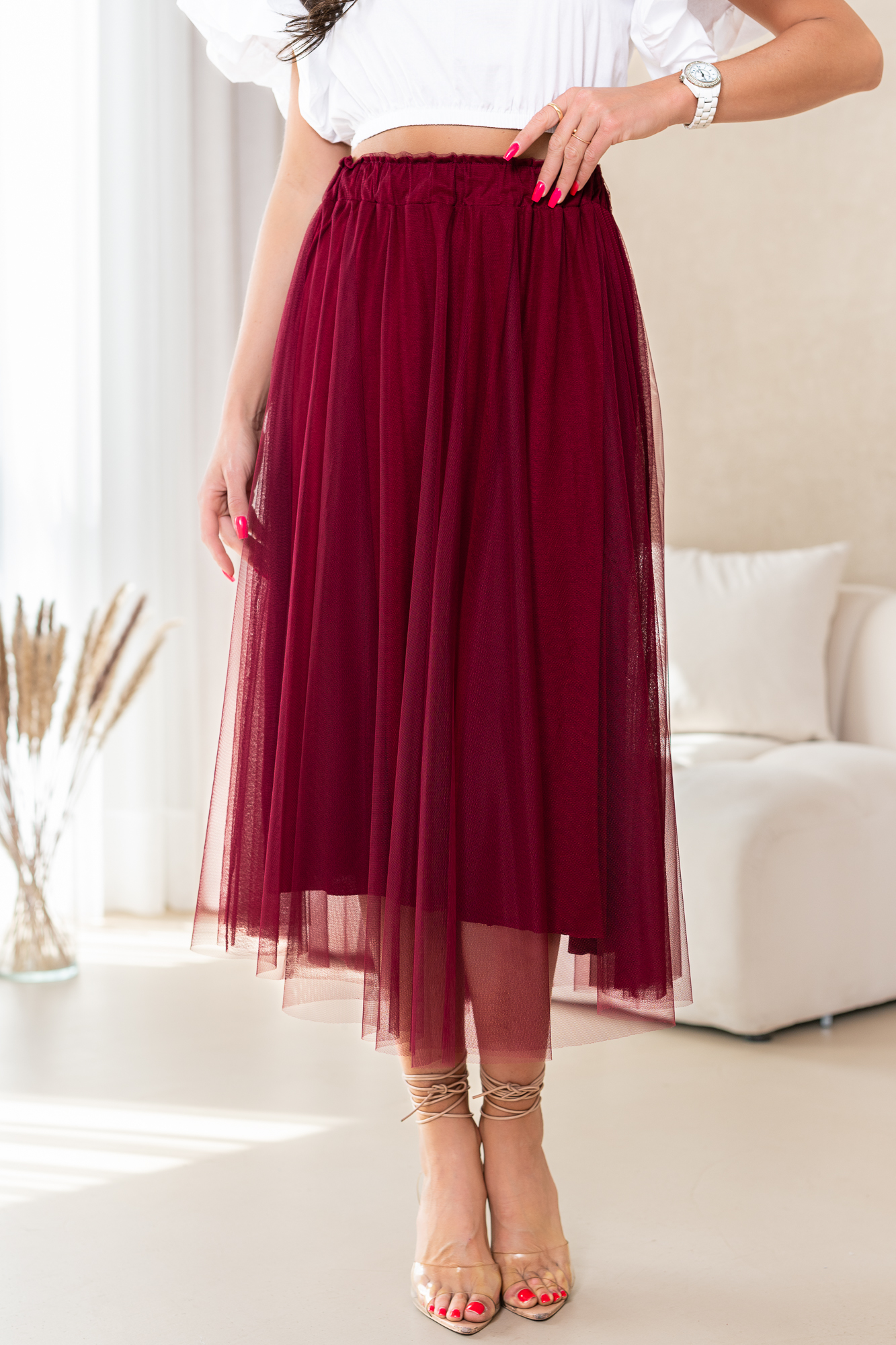 Spódnica tiulowa midi z szeroką gumką w pasie dla wygody noszenia. Uszyta jest z miękkiego tiulu, abyś czuła się w niej bardzo komfortowo, wygodnie i kobieco.