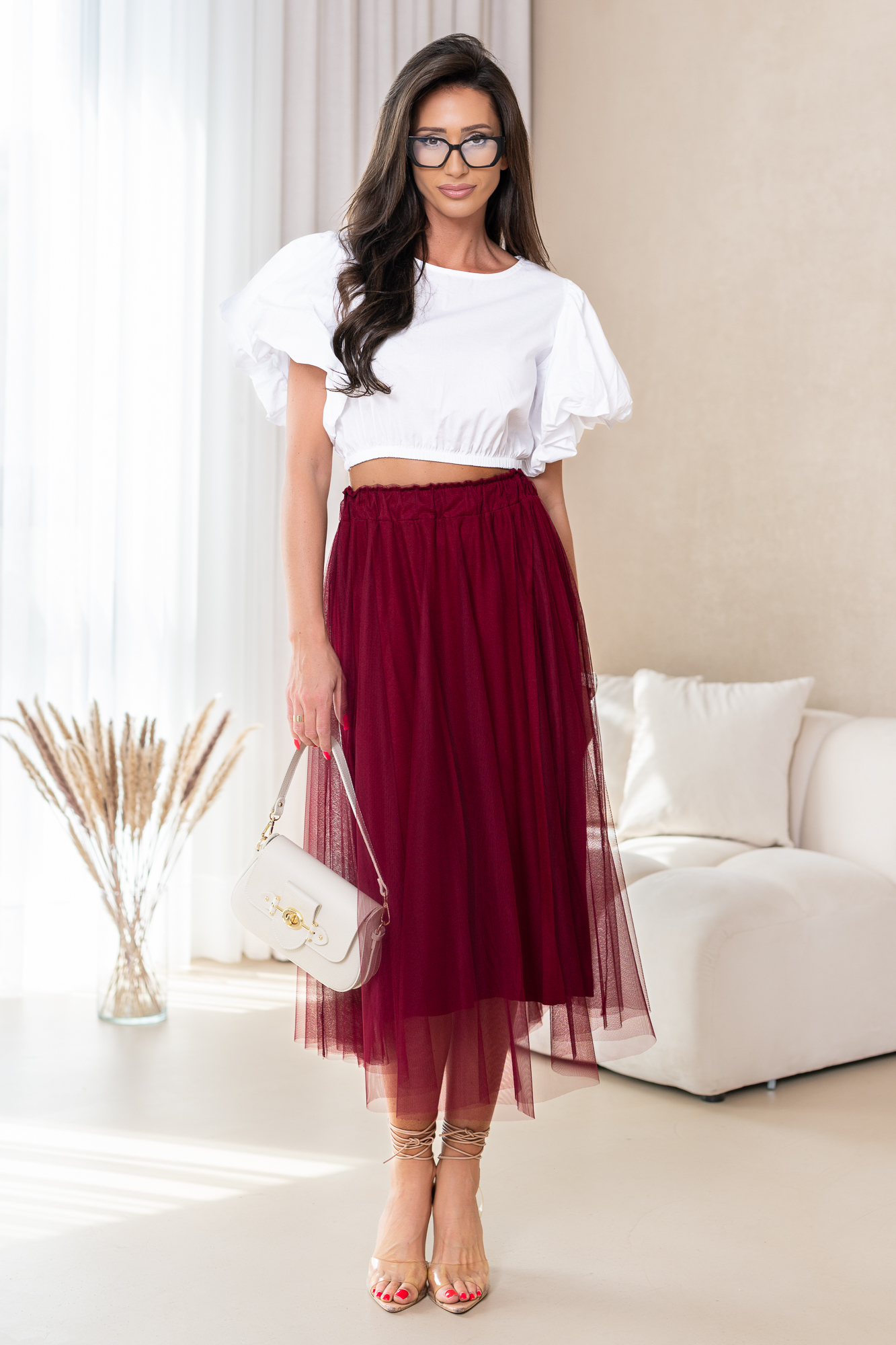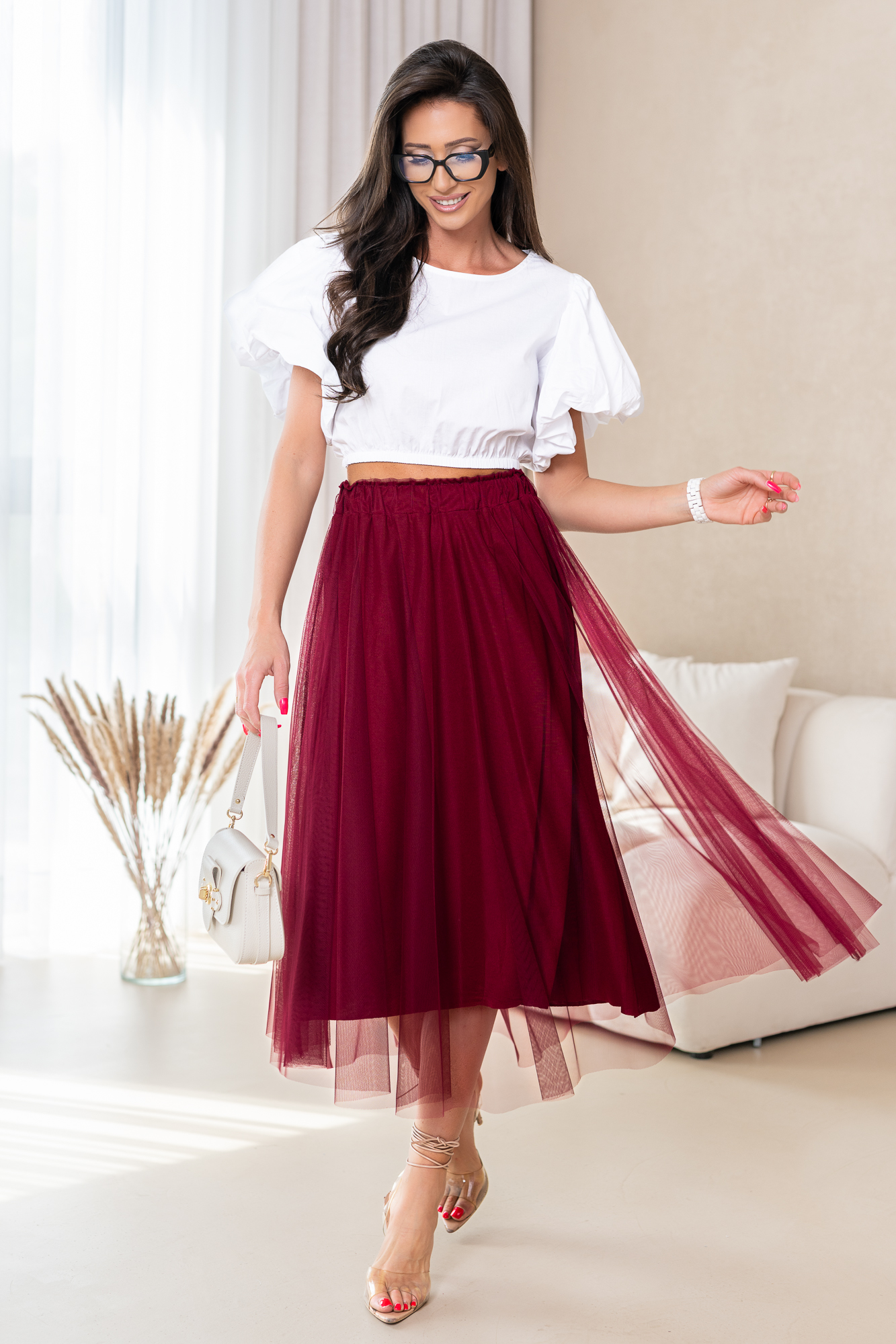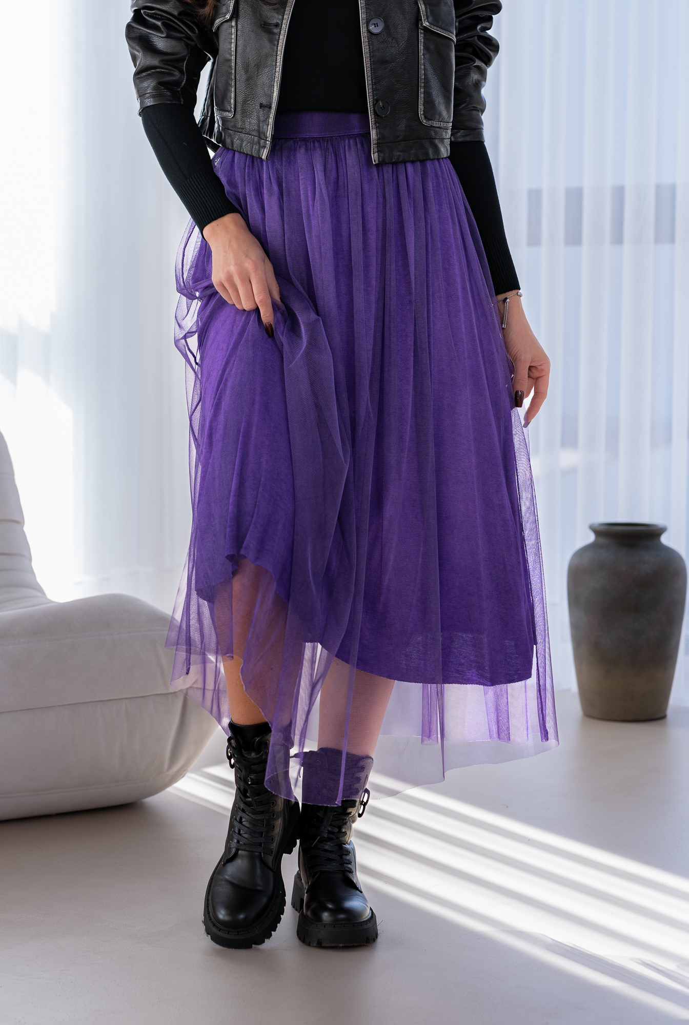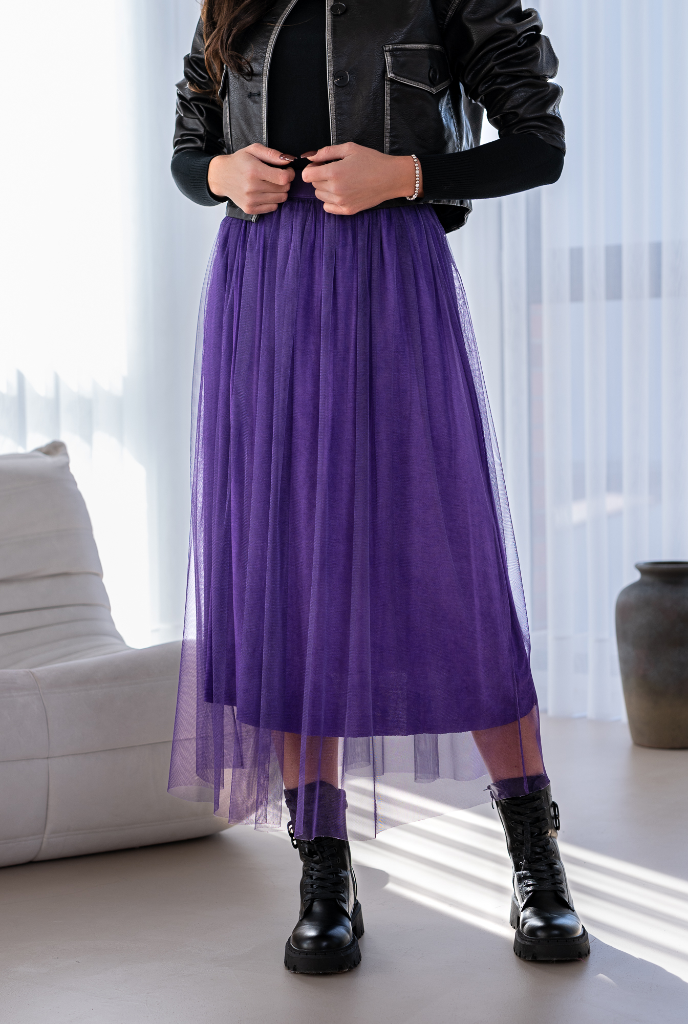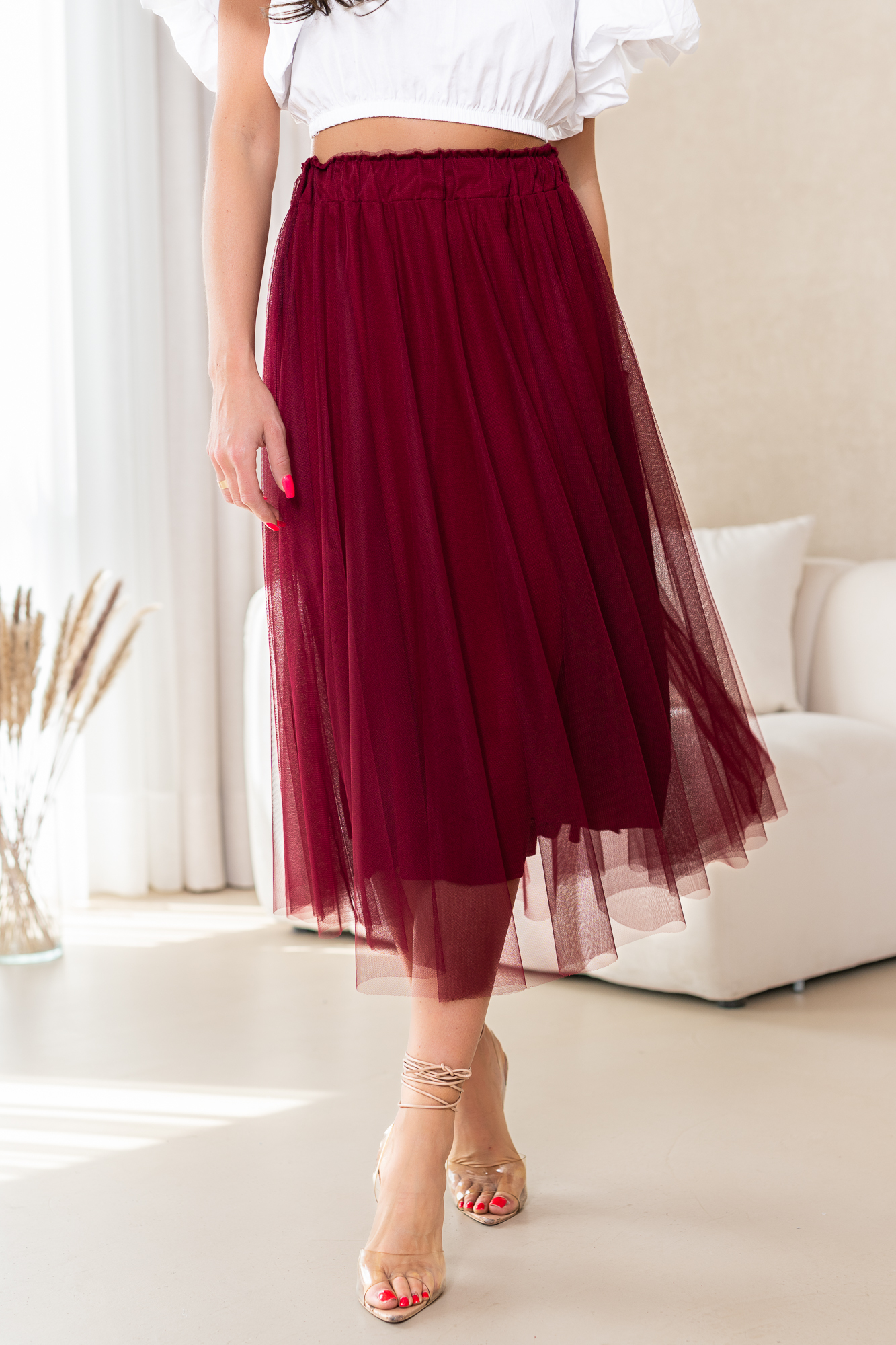 Spódnica tiulowa midi z szeroką gumką w pasie dla wygody noszenia. Uszyta jest z miękkiego tiulu, abyś czuła się w niej bardzo komfortowo, wygodnie i kobieco.