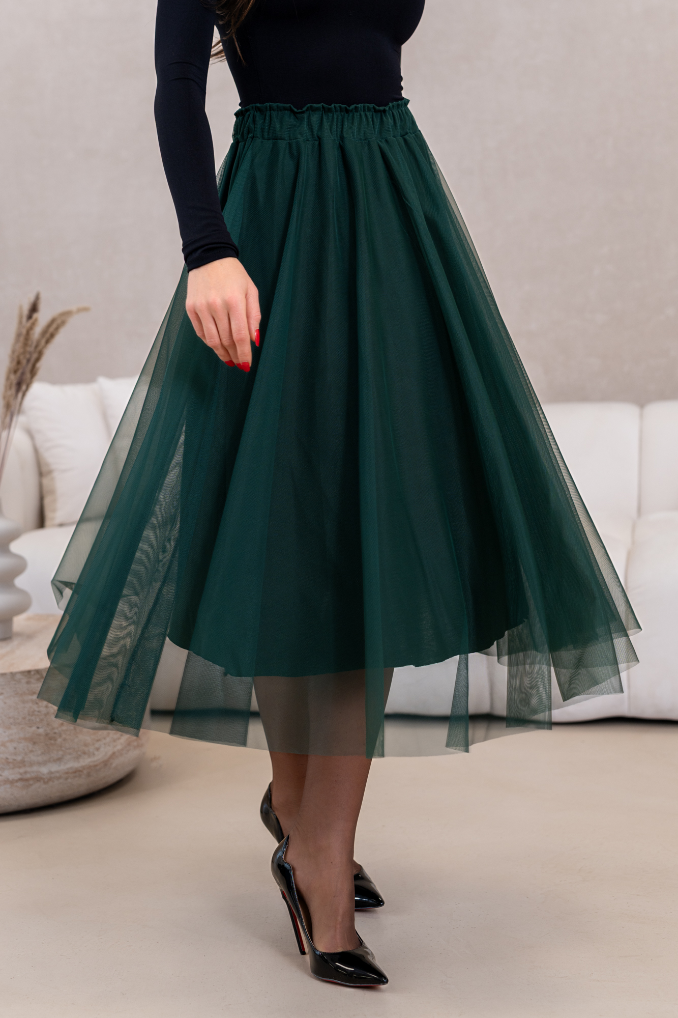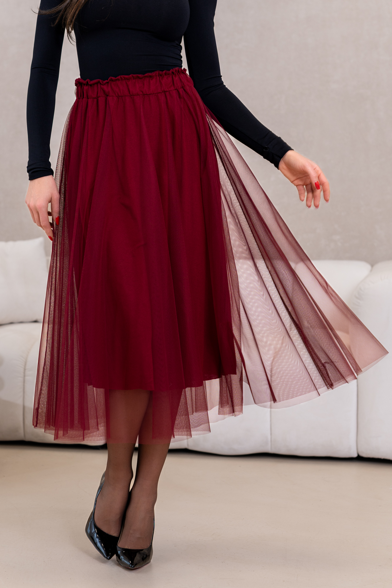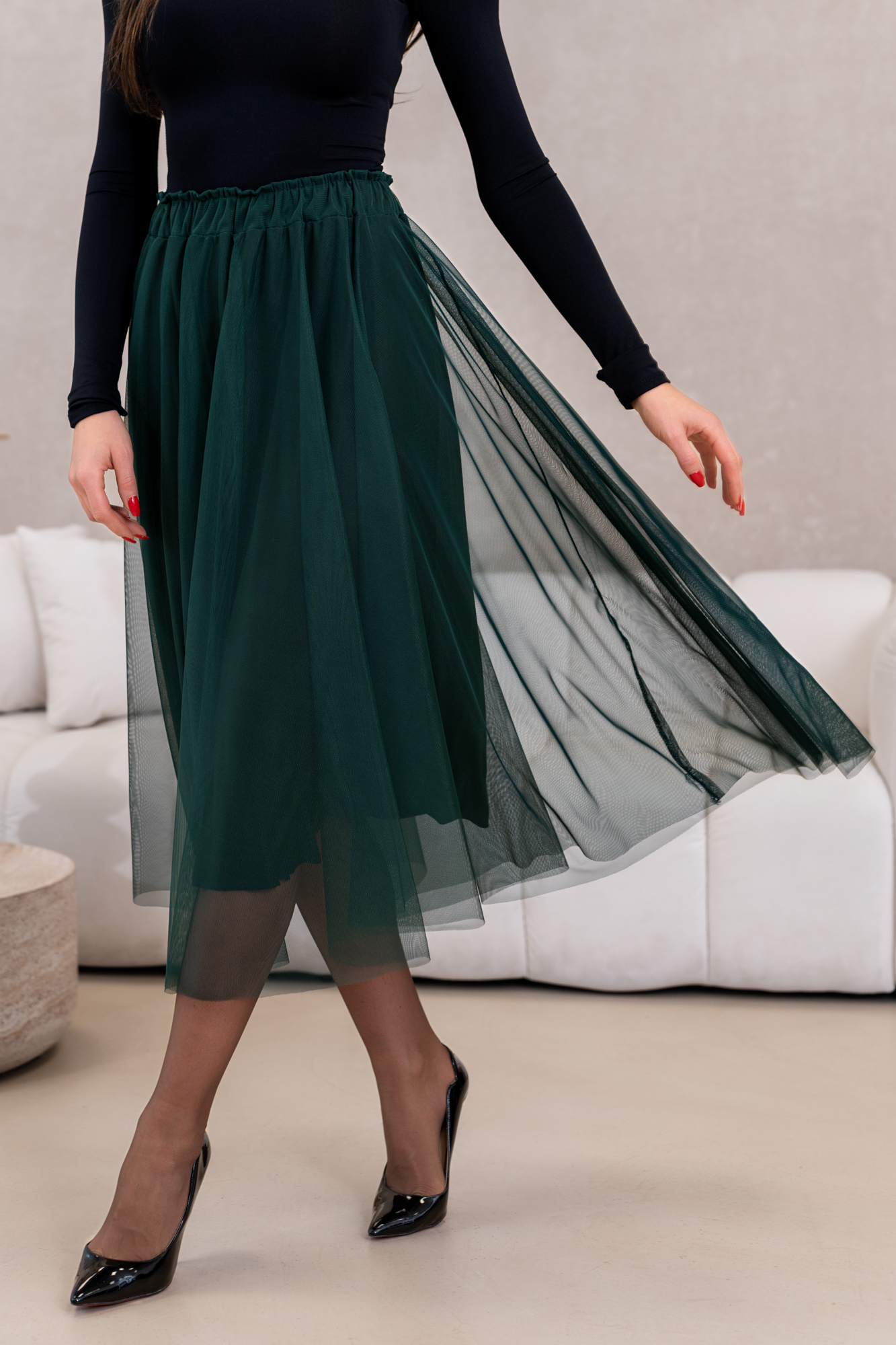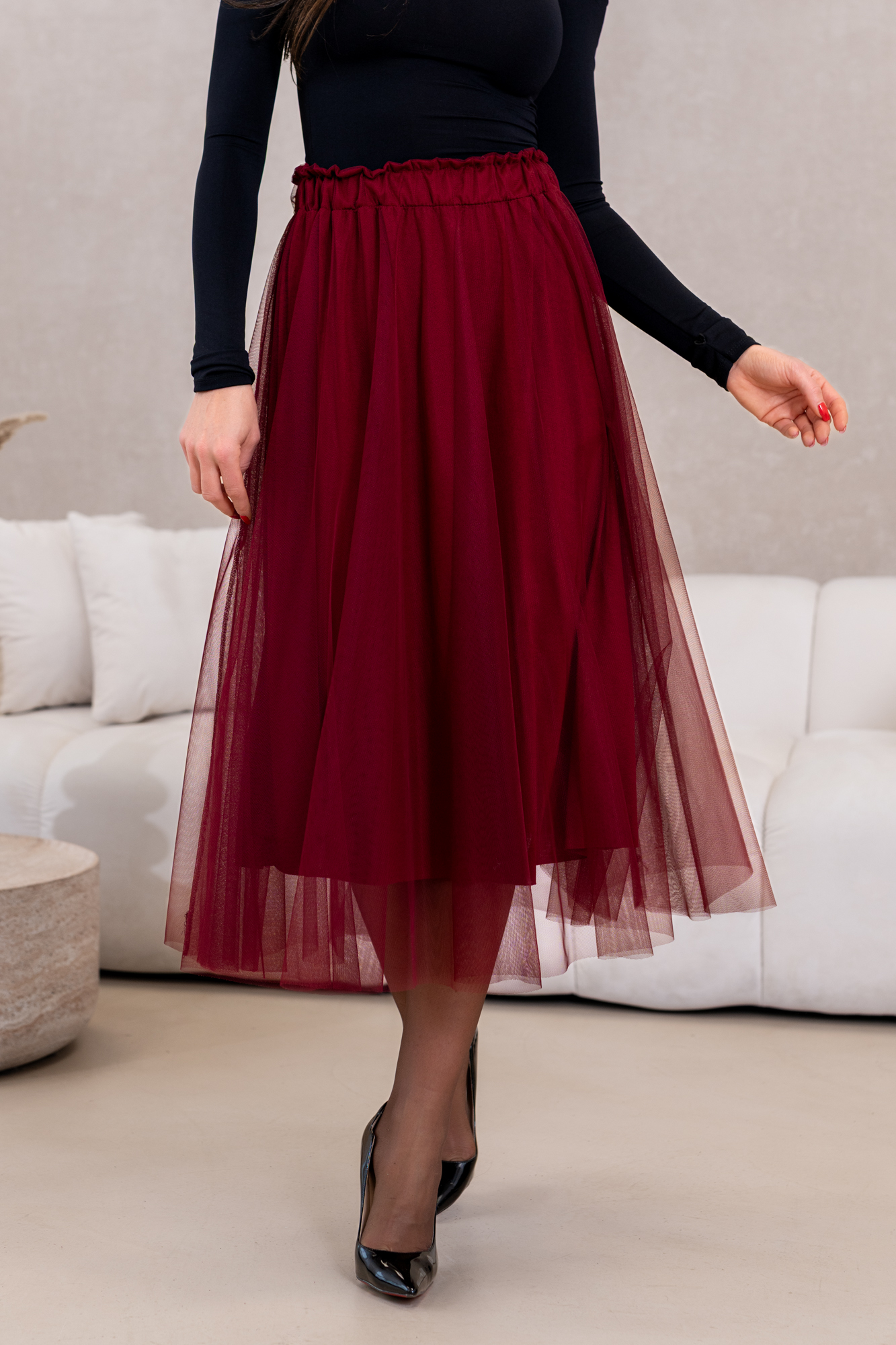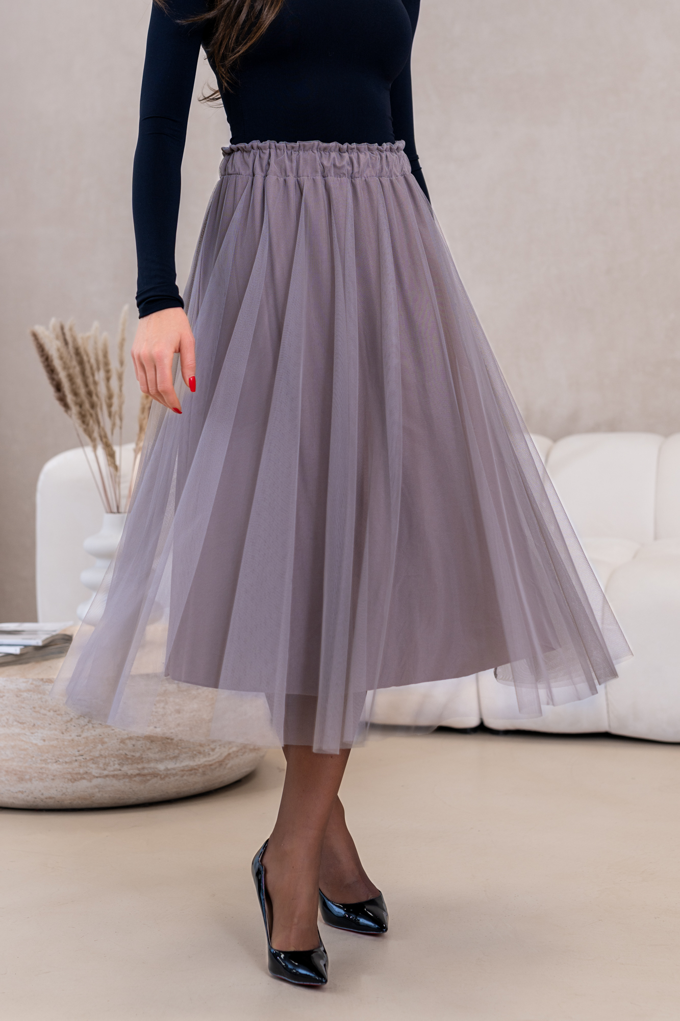 Spódnica tiulowa midi z szeroką gumką w pasie dla wygody noszenia. Uszyta jest z miękkiego tiulu, abyś czuła się w niej bardzo komfortowo, wygodnie i kobieco.