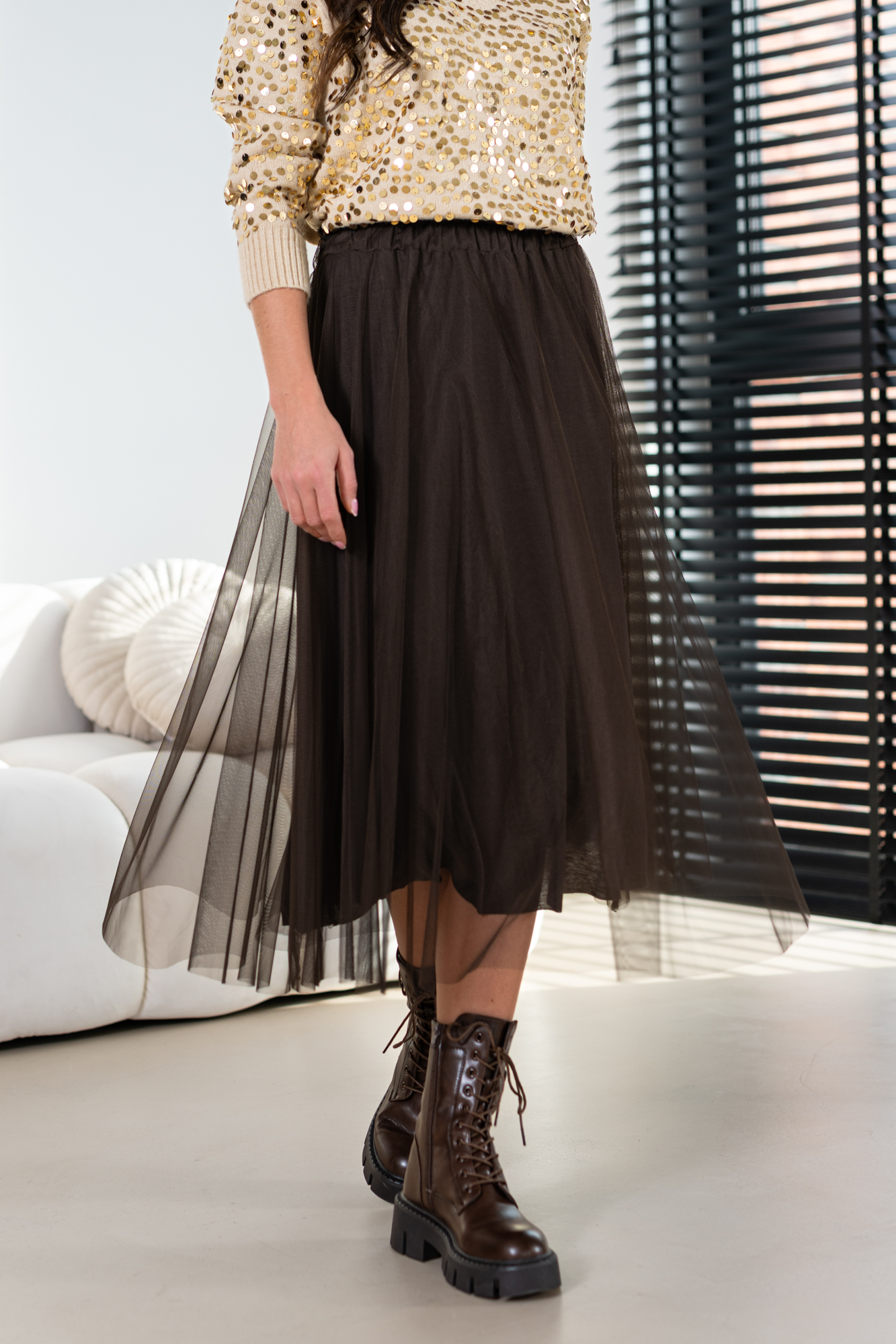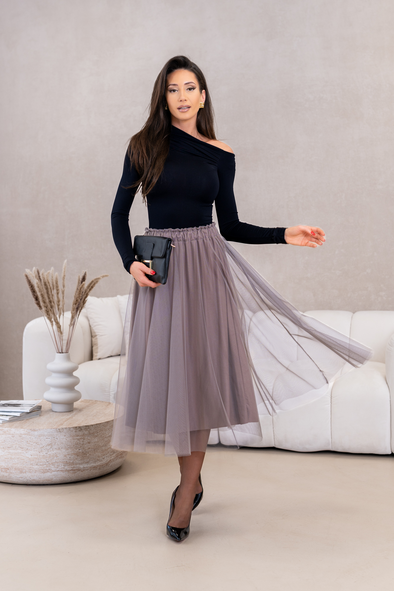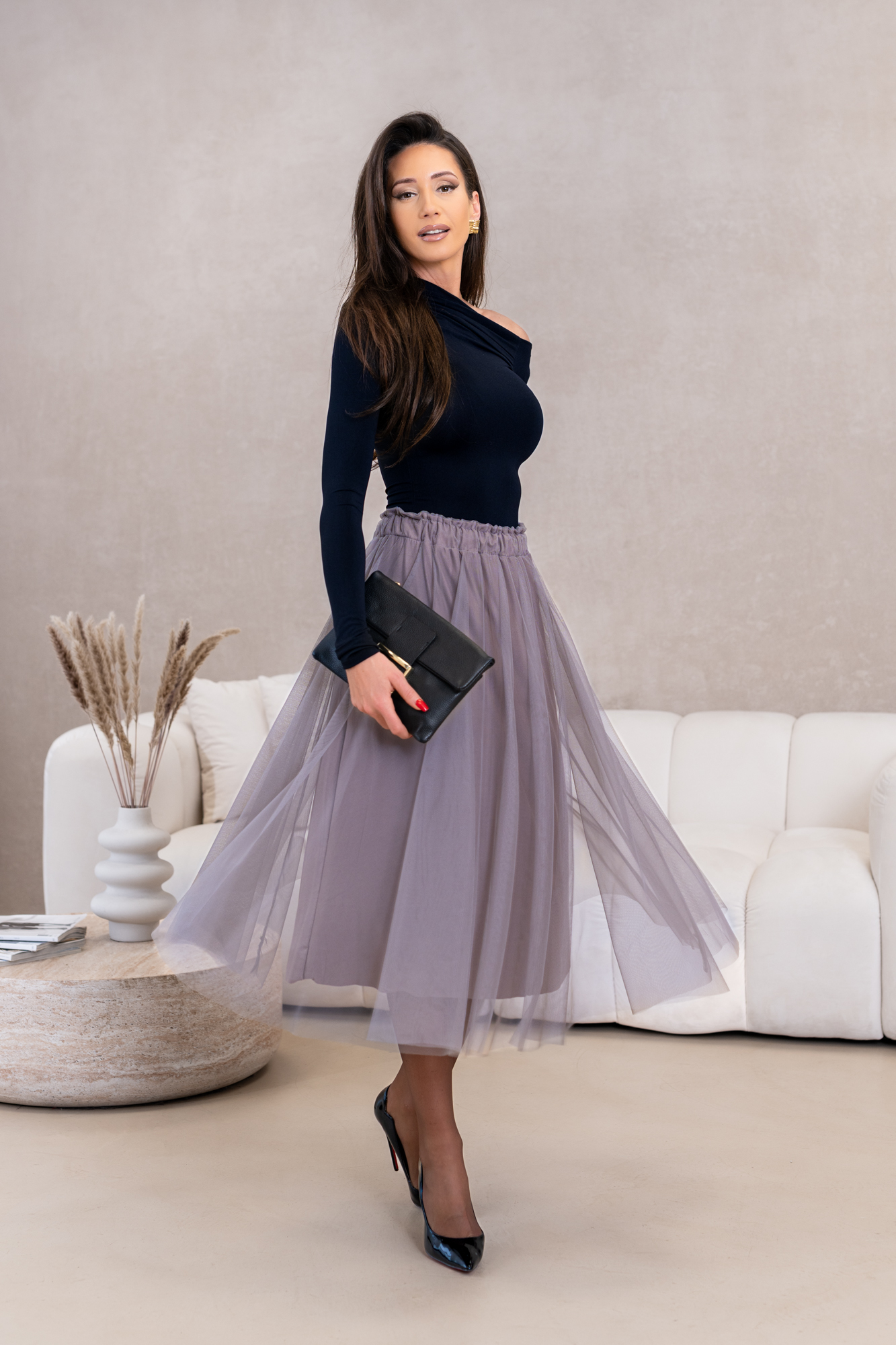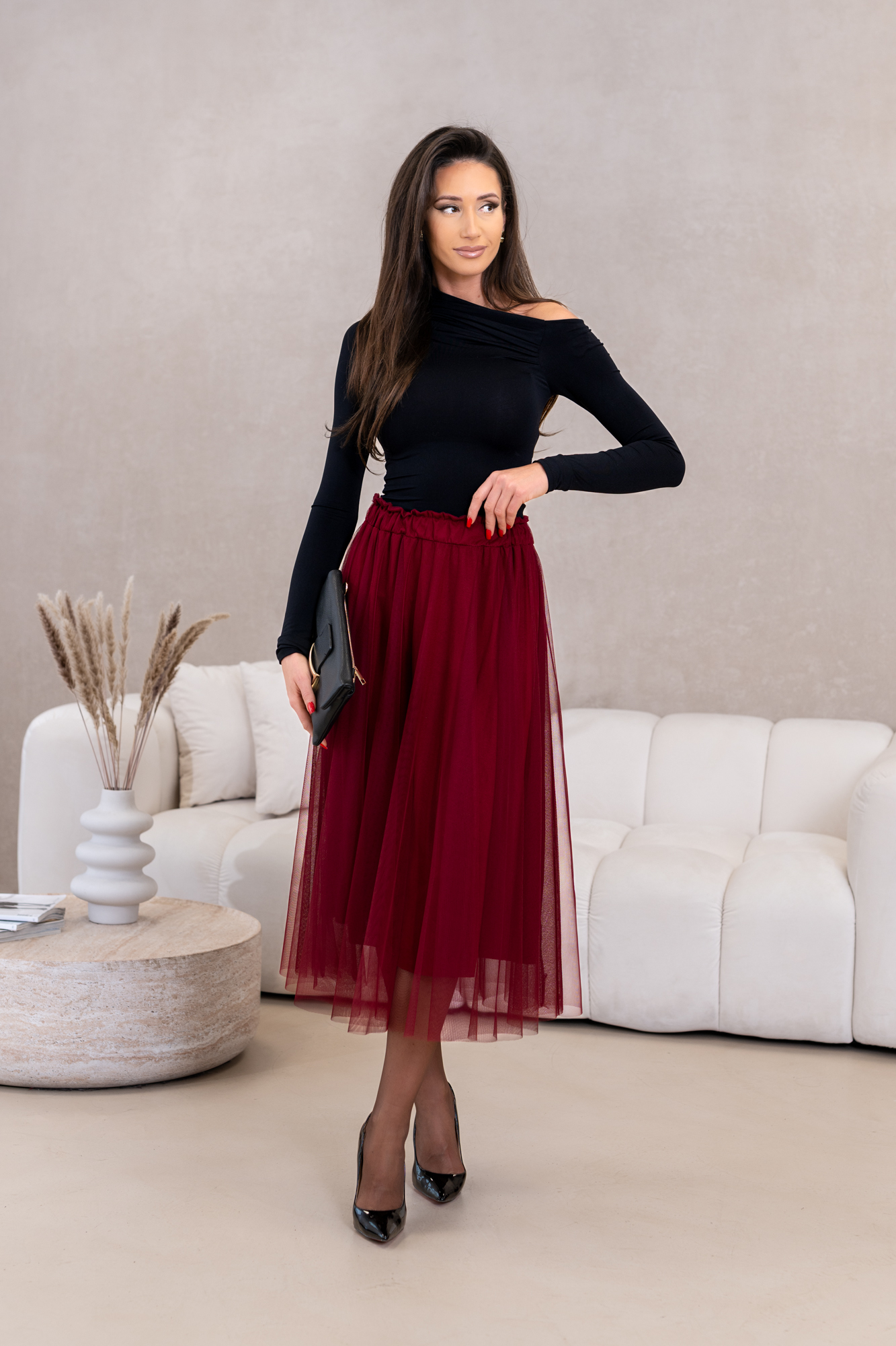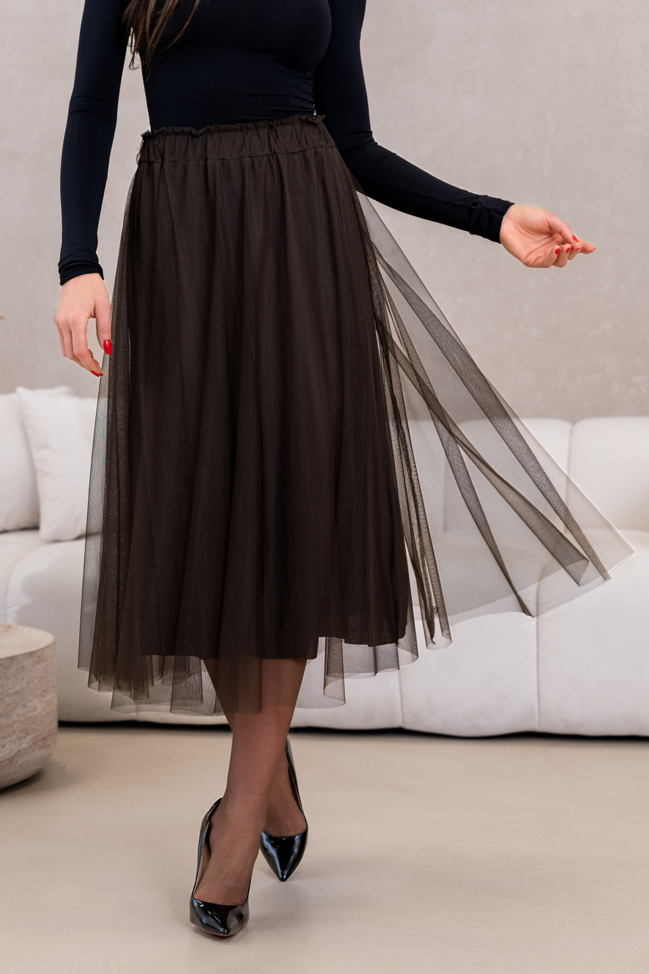Spódnica tiulowa midi z szeroką gumką w pasie dla wygody noszenia. Uszyta jest z miękkiego tiulu, abyś czuła się w niej bardzo komfortowo, wygodnie i kobieco.