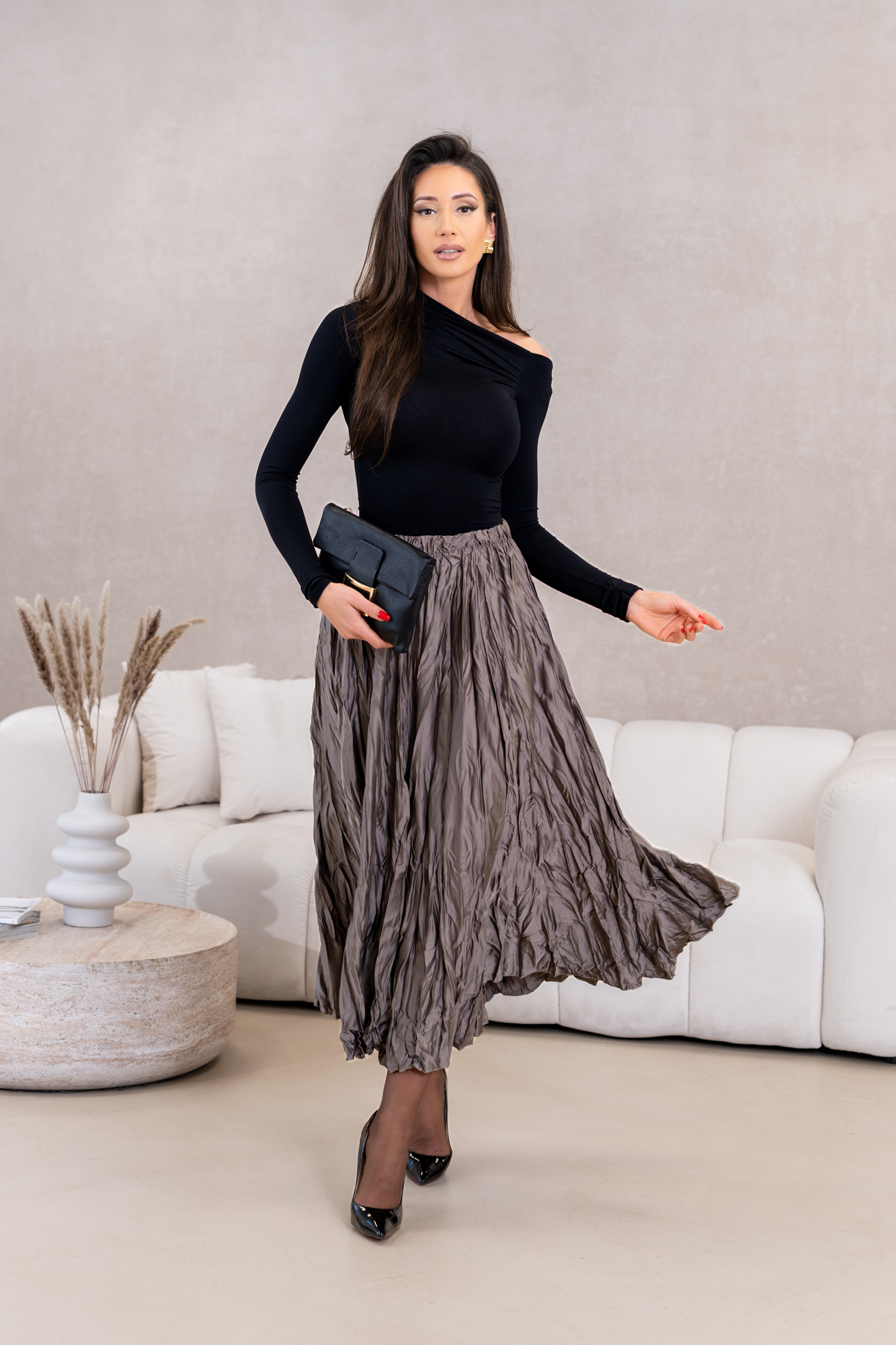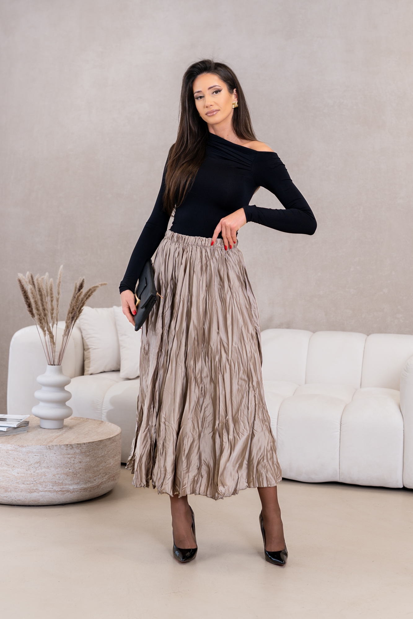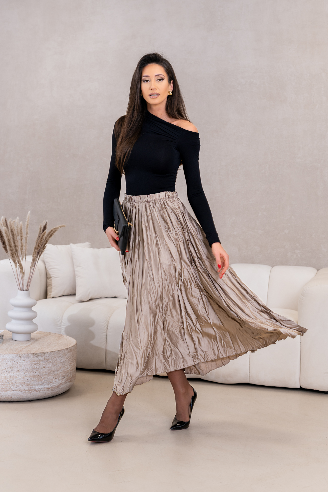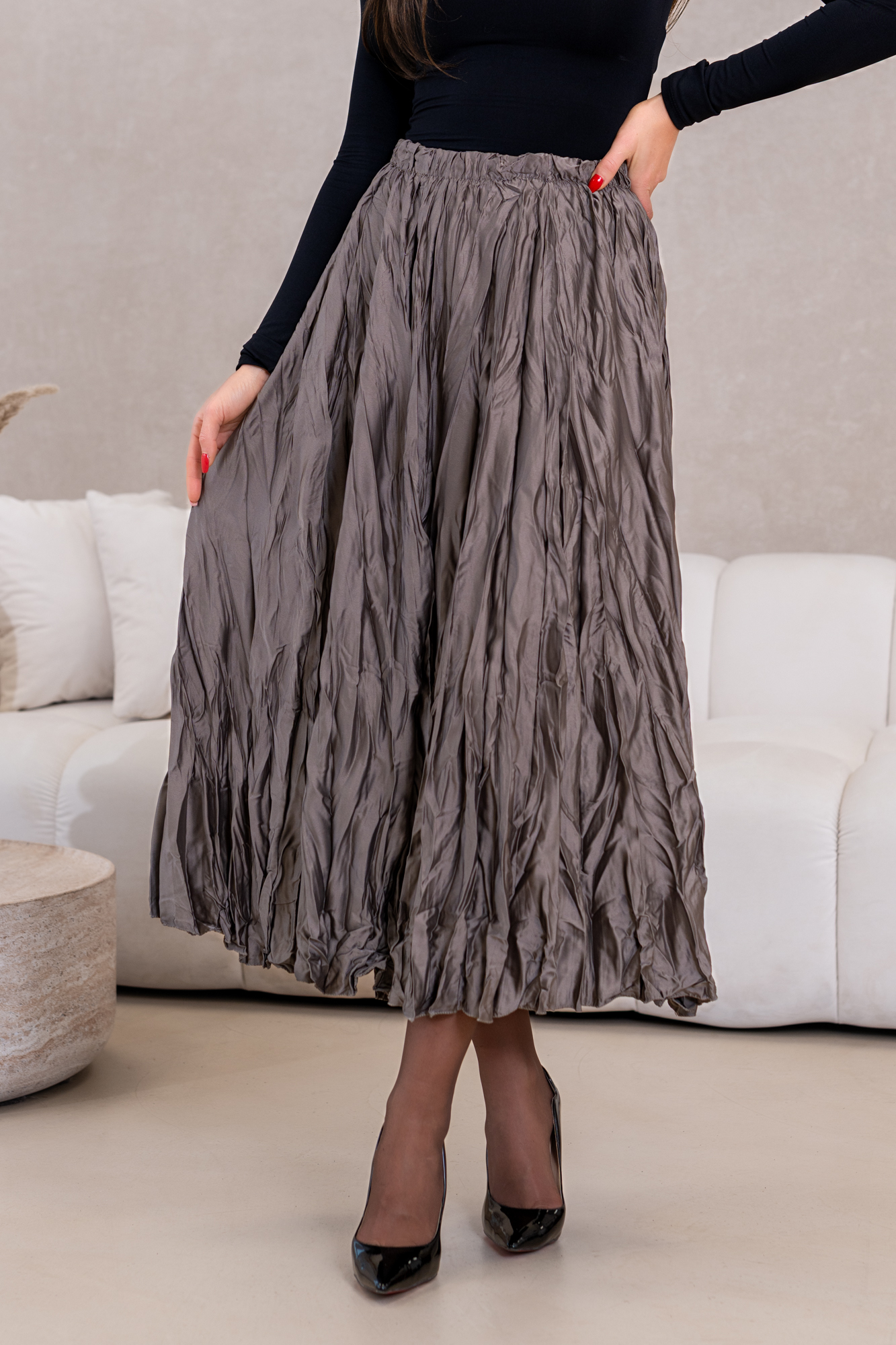 Niezwykły urok stylowej spódnicy maxi z efektem marszczenia, idealnej dla kobiet ceniących sobie elegancję połączoną z wygodą. Wykonana z wysokiej jakości, lekko połyskującego materiału, który zapewnia nie tylko piękny wygląd, ale także komfort noszenia przez cały dzień. Spódnica świetnie komponuje się z różnymi elementami garderoby, a jej zwiewny krój z subtelnymi, romantycznymi marszczeniami dodaje sylwetce lekkości i wdzięku. Idealna na co dzień, do pracy czy na wyjątkowe okazje, z pewnością stanie się kluczowym elementem Twojej szafy, podkreślając Twój wyjątkowy styl.