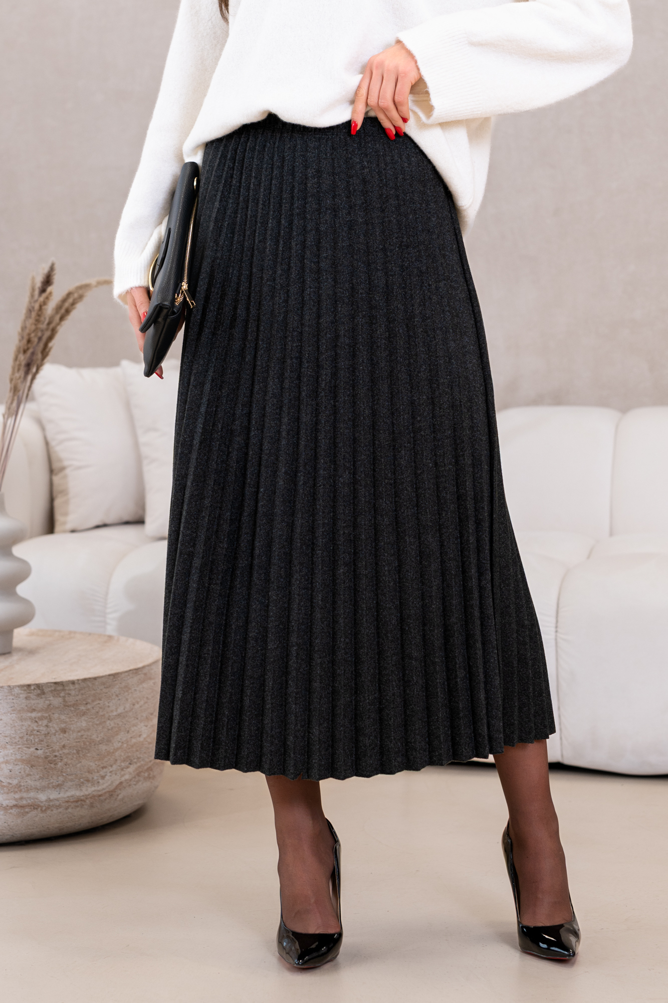 Dzianinowa, plisowana spódnica o długości midi. Miękka, wygodna i niezwykle stylowa — idealna na chłodniejsze dni i codzienne stylizacje.