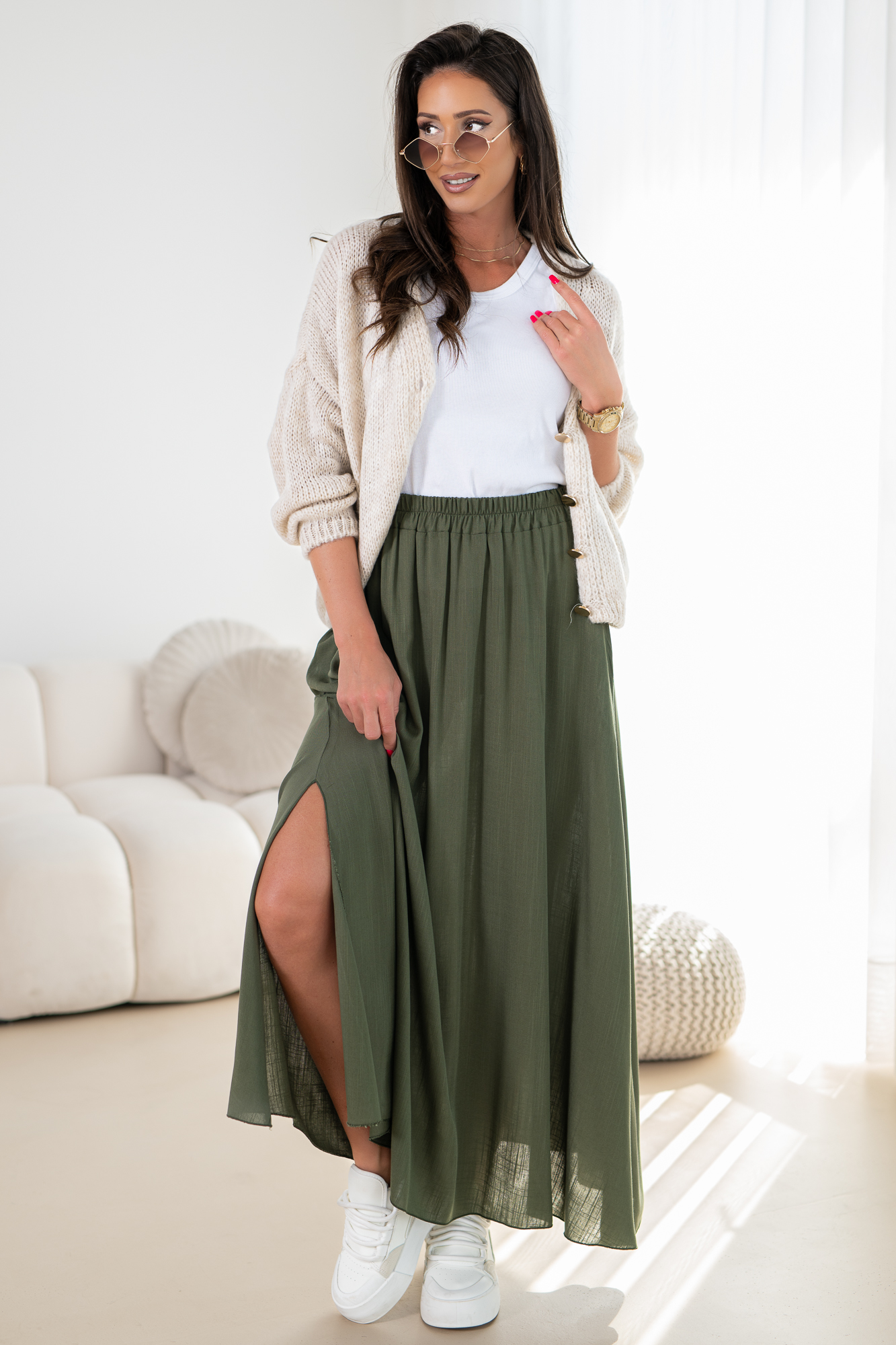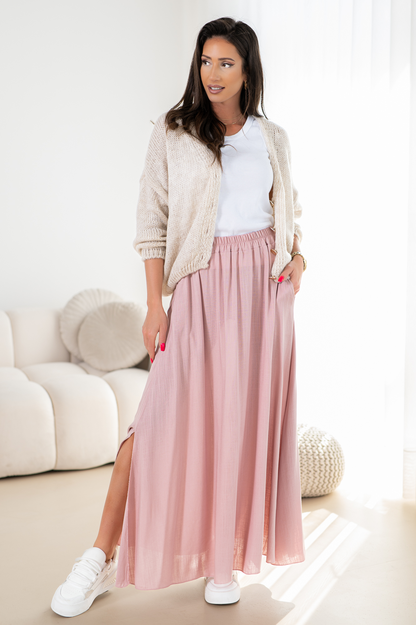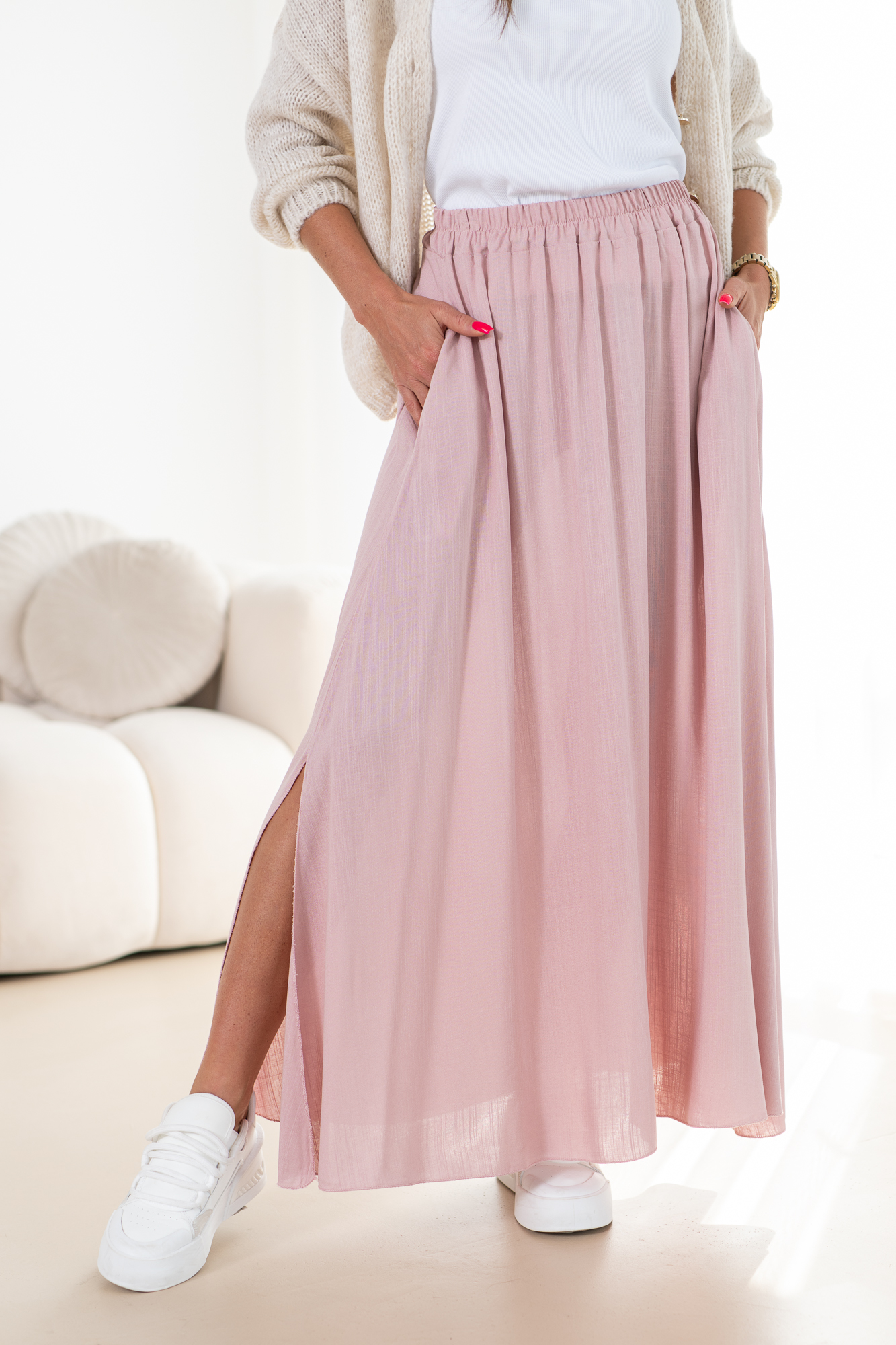 Odkryj elegancję i wygodę w naszej lejąca się spódnicy na szerokiej gumie z kieszeniami po bokach. Ten modny fason spódnicy łączy w sobie klasyczny krój z nowoczesnym akcentem, idealna na sezon letni. Materiał idealnie układa się na sylwetce, a subtelne rozcięcie na nodze dodają całości subtelnego uroku.