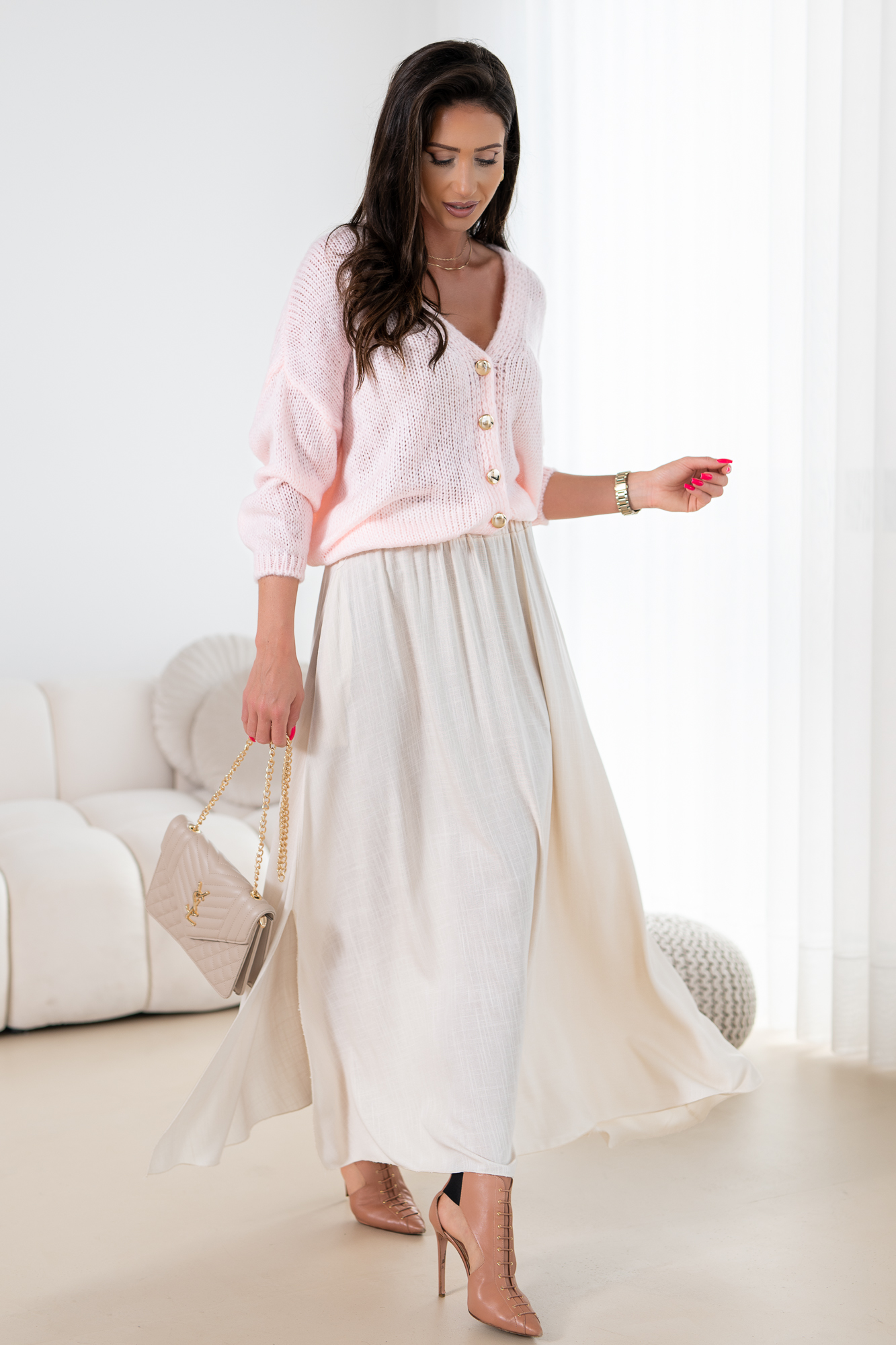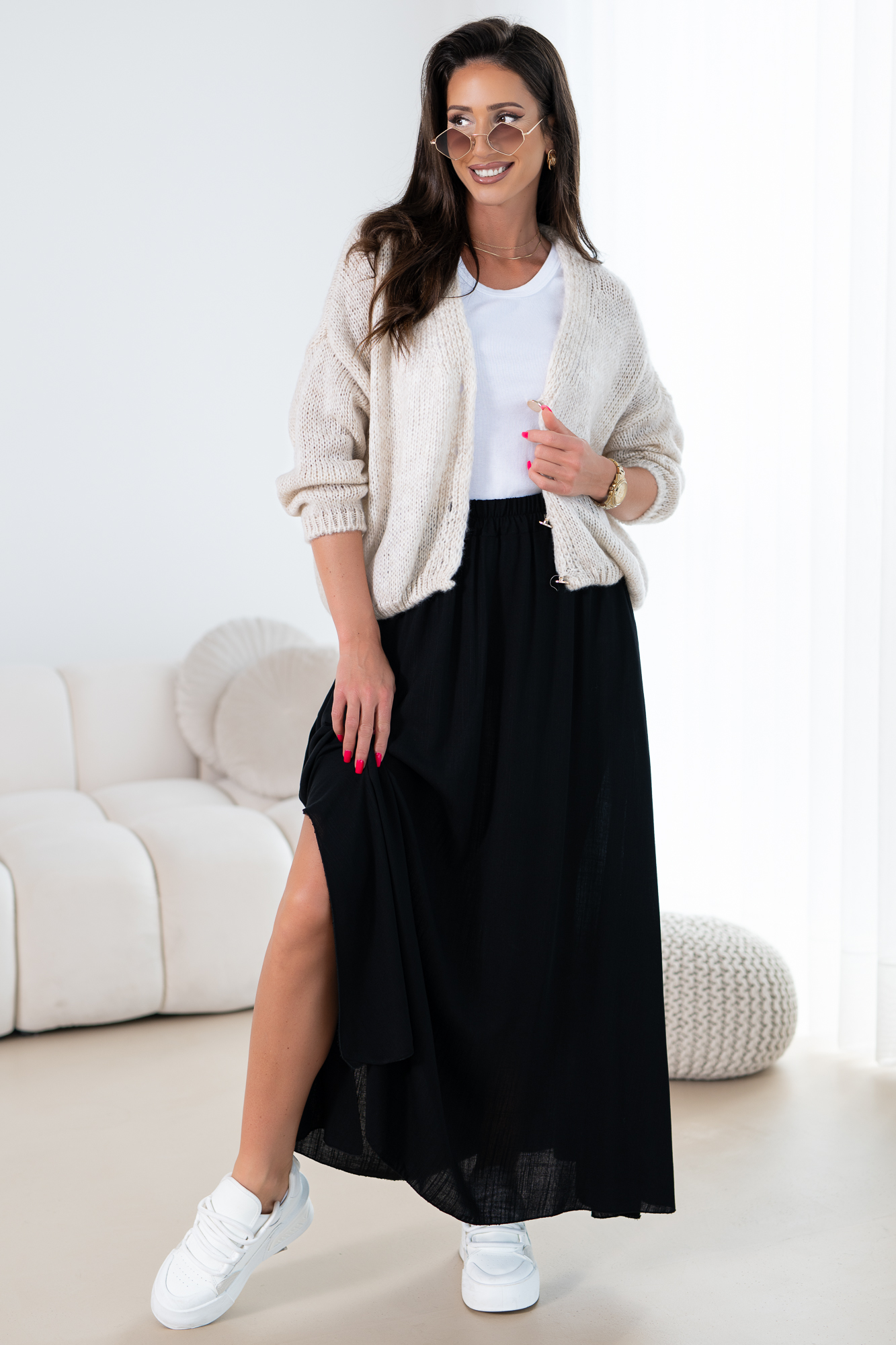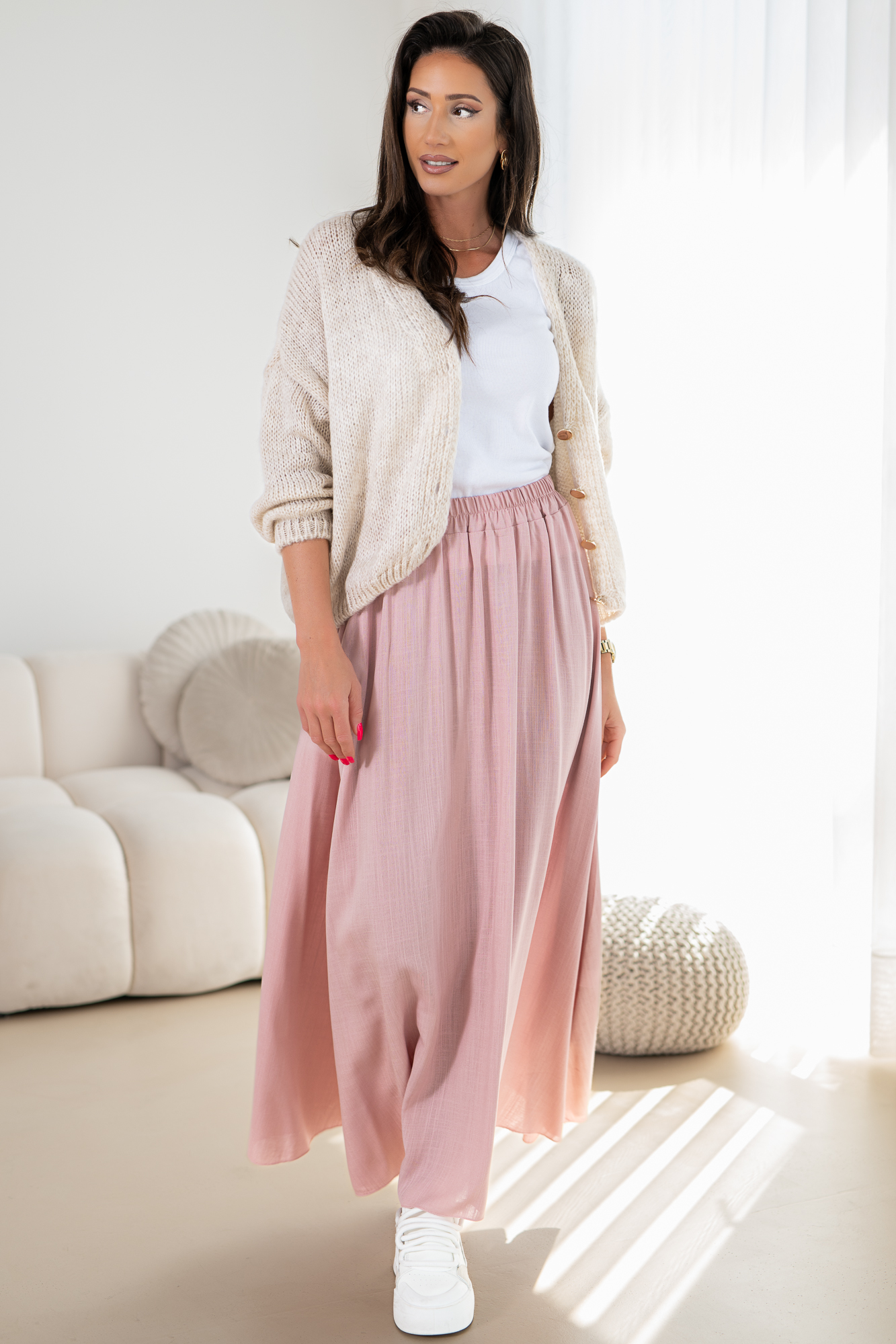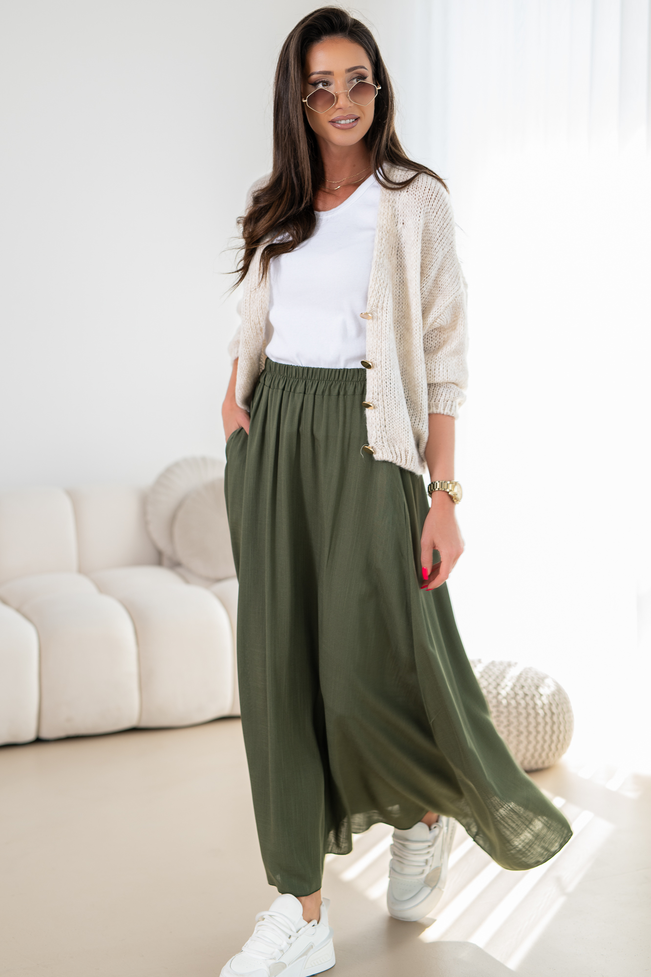 Odkryj elegancję i wygodę w naszej lejąca się spódnicy na szerokiej gumie z kieszeniami po bokach. Ten modny fason spódnicy łączy w sobie klasyczny krój z nowoczesnym akcentem, idealna na sezon letni. Materiał idealnie układa się na sylwetce, a subtelne rozcięcie na nodze dodają całości subtelnego uroku.