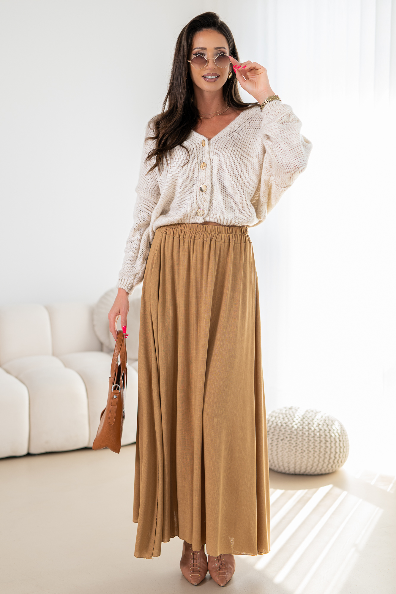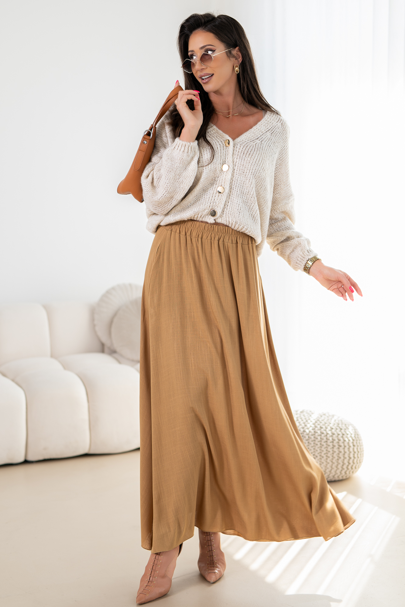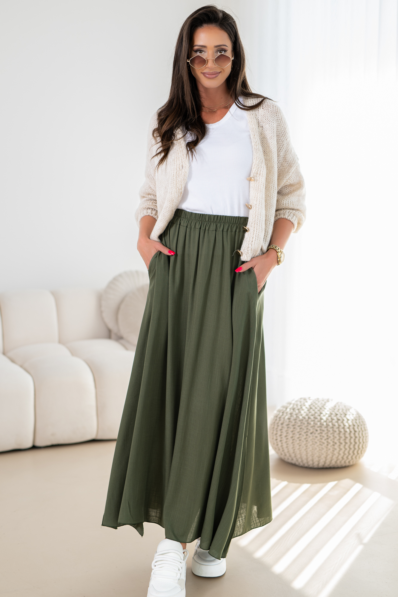 Odkryj elegancję i wygodę w naszej lejąca się spódnicy na szerokiej gumie z kieszeniami po bokach. Ten modny fason spódnicy łączy w sobie klasyczny krój z nowoczesnym akcentem.