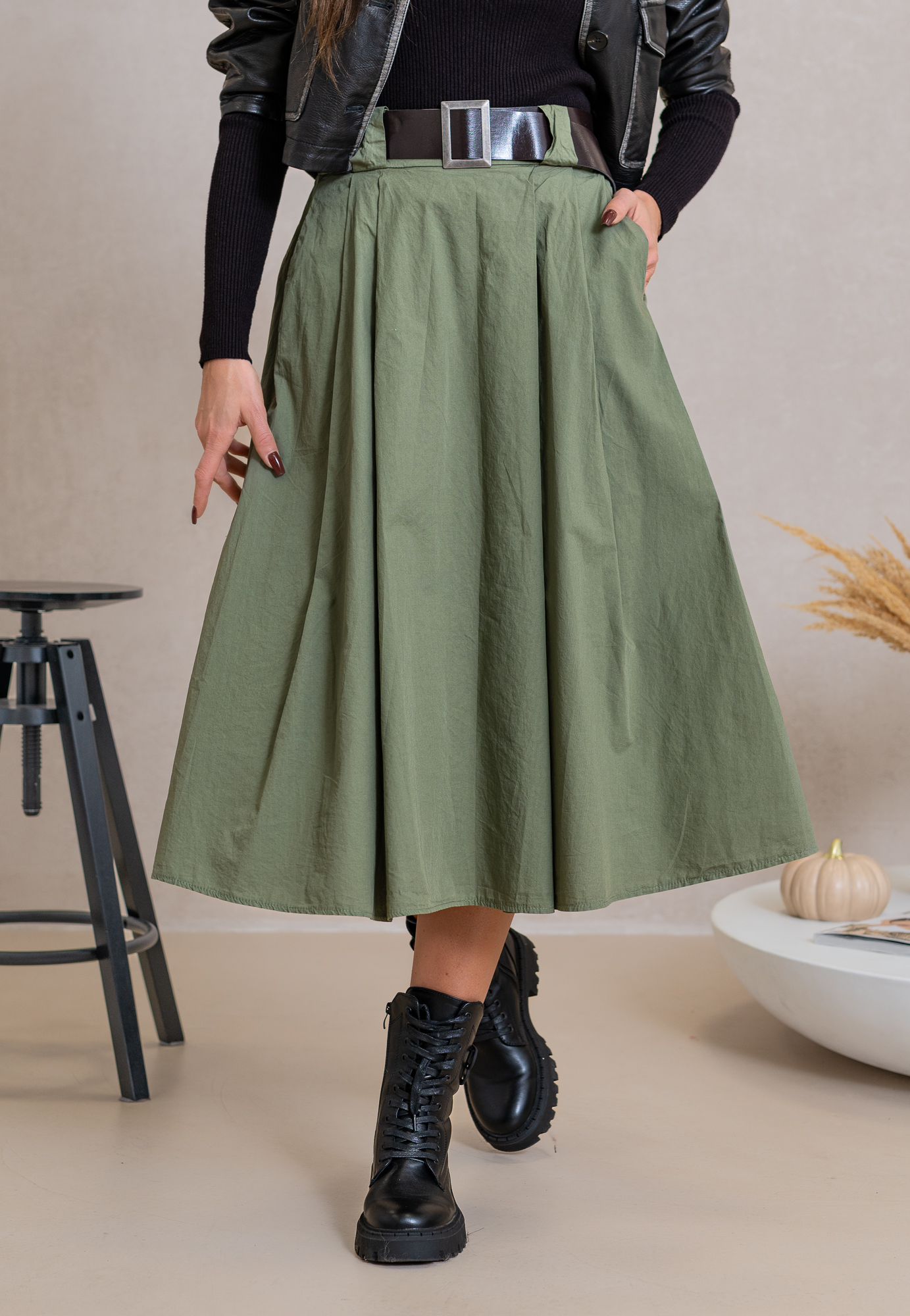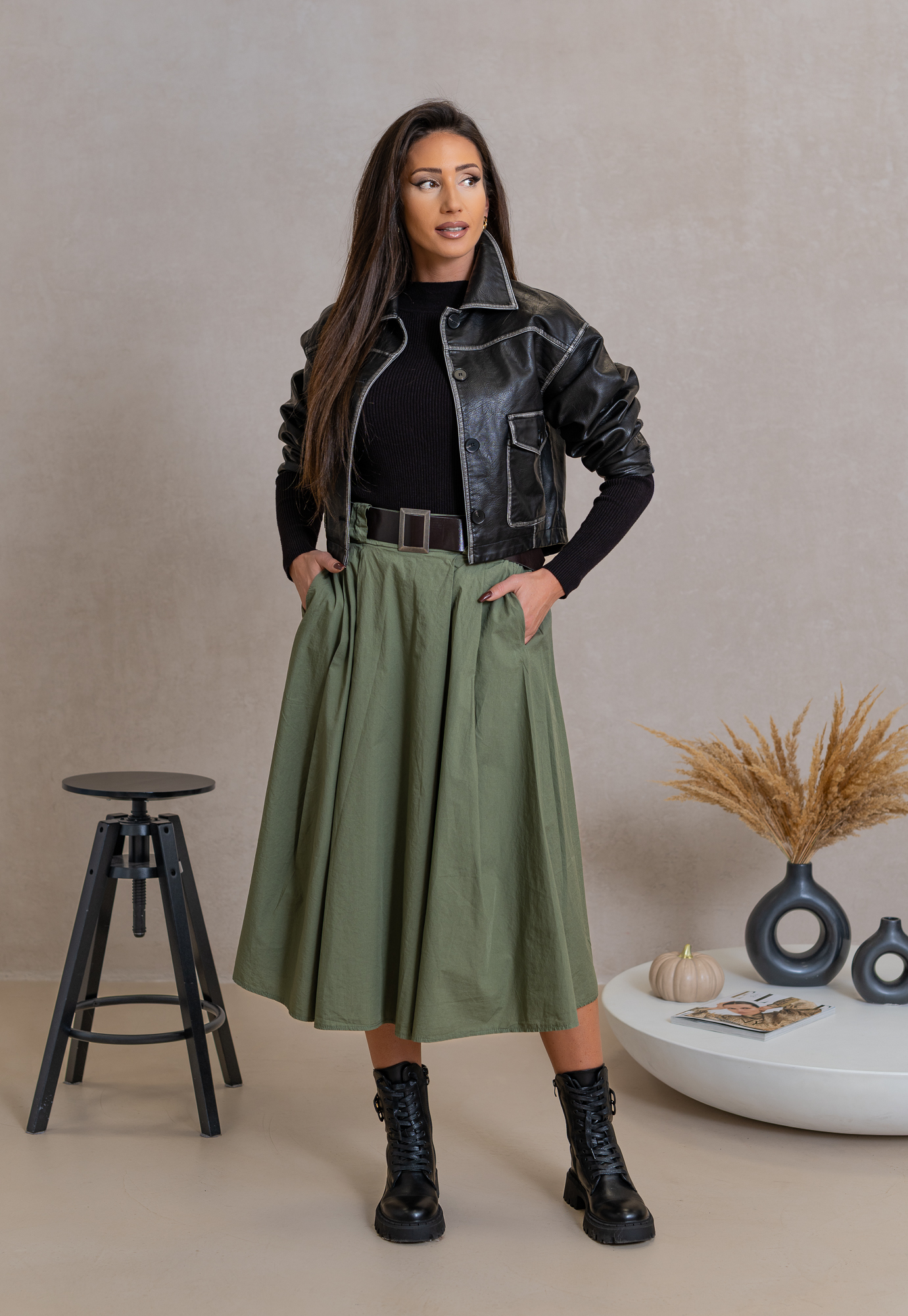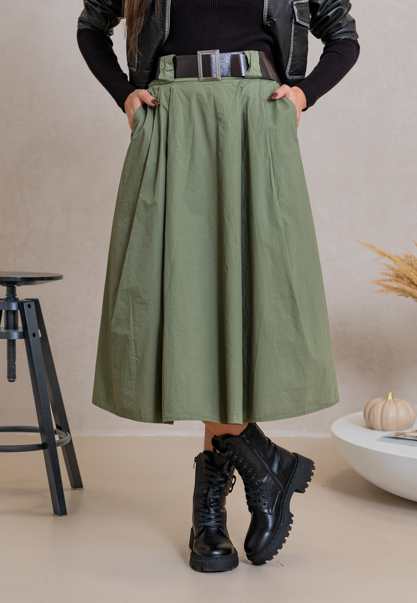 Kobieca, lekka, klasyczna a jednak zupełnie inna – Spódnica OLEANDRII – spódnica ma krój trapezu. Posiada gumkę w pasie i dwie obszerne kieszenie – dodatkowo pasek w komplecie. Materiał ładnie układający się na sylwetce.