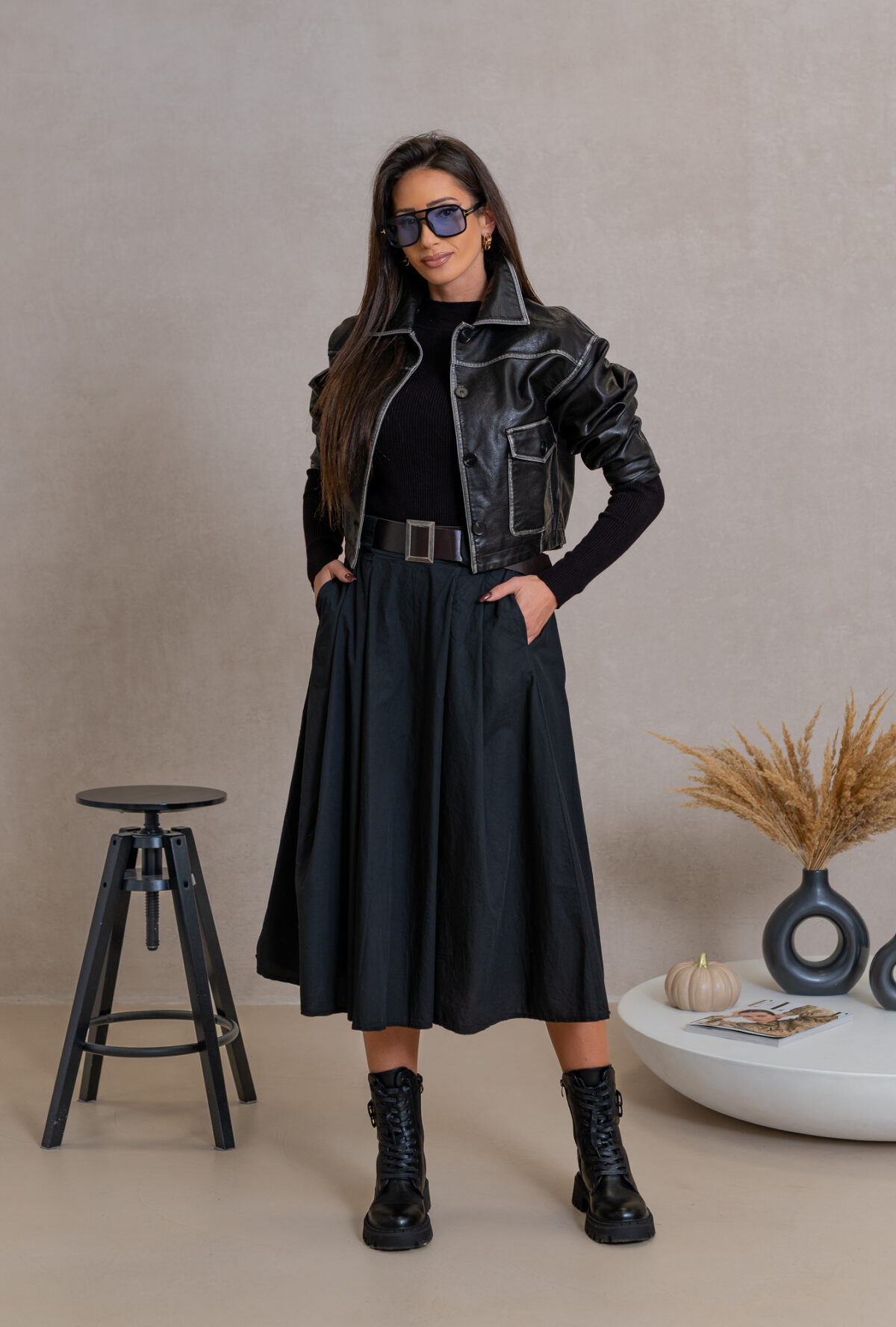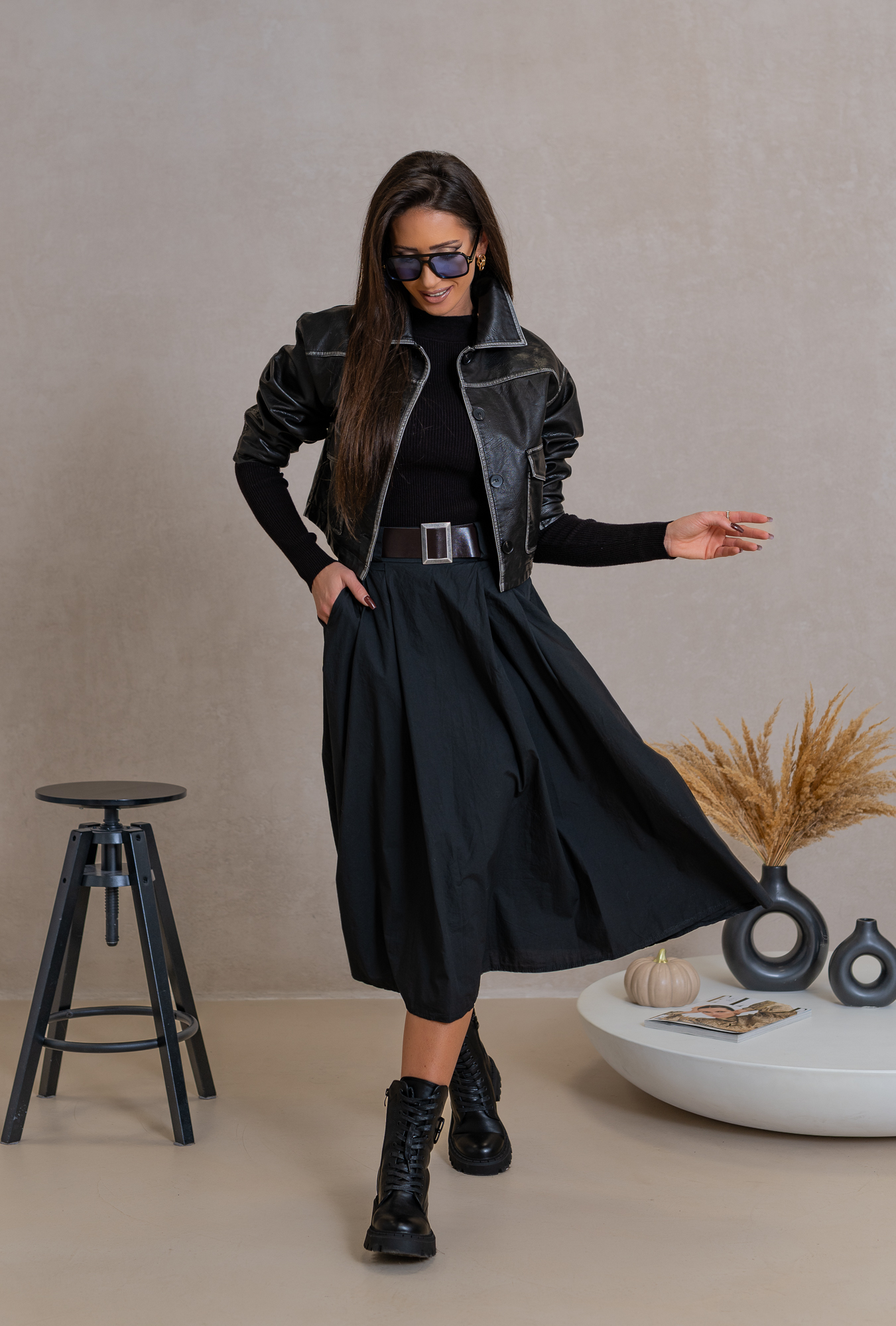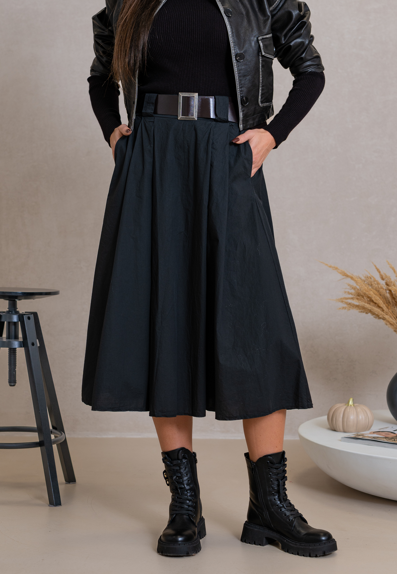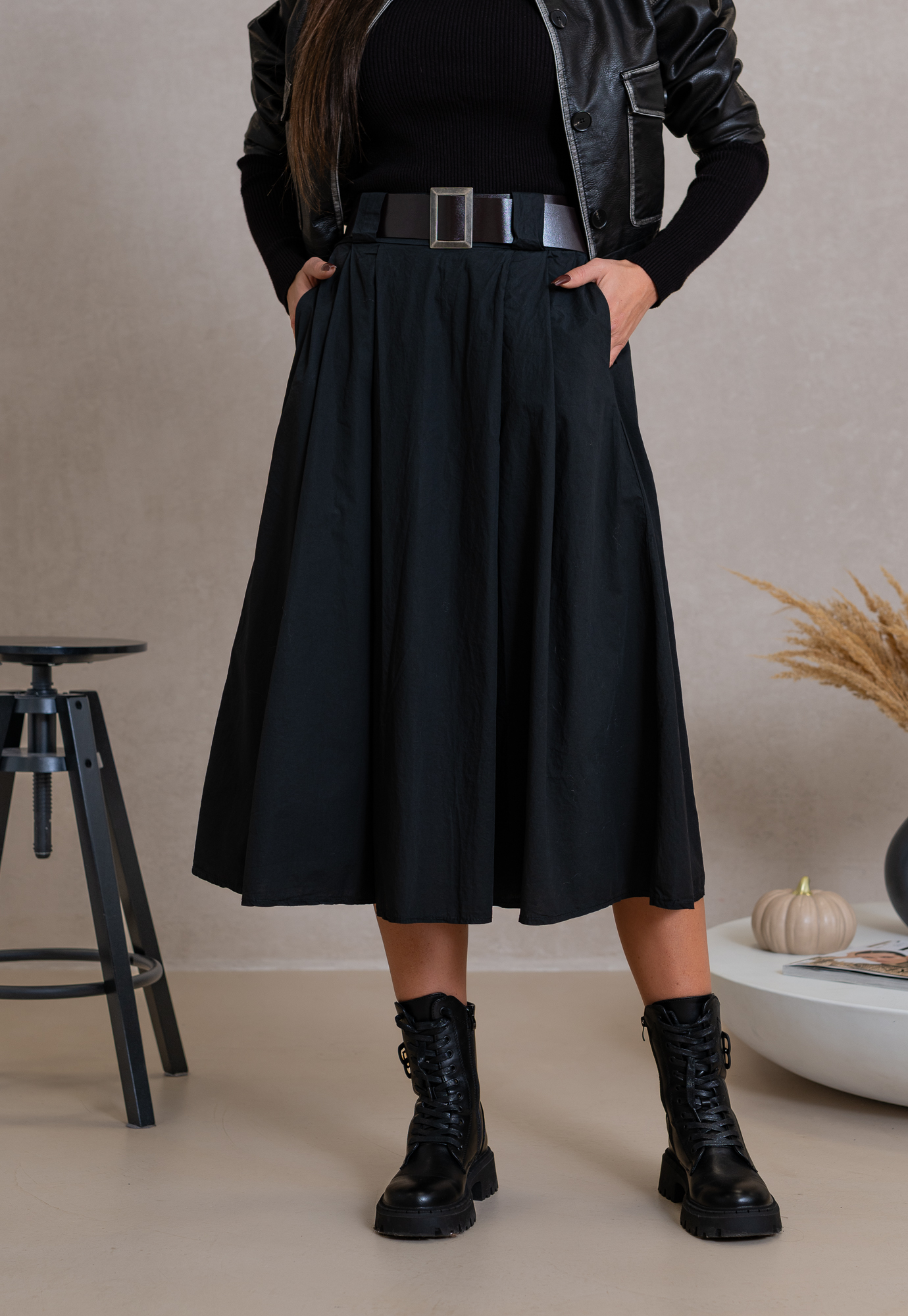 Kobieca, lekka, klasyczna a jednak zupełnie inna – Spódnica OLEANDRII – spódnica ma krój trapezu. Posiada gumkę w pasie i dwie obszerne kieszenie – dodatkowo pasek w komplecie. Materiał ładnie układający się na sylwetce.
