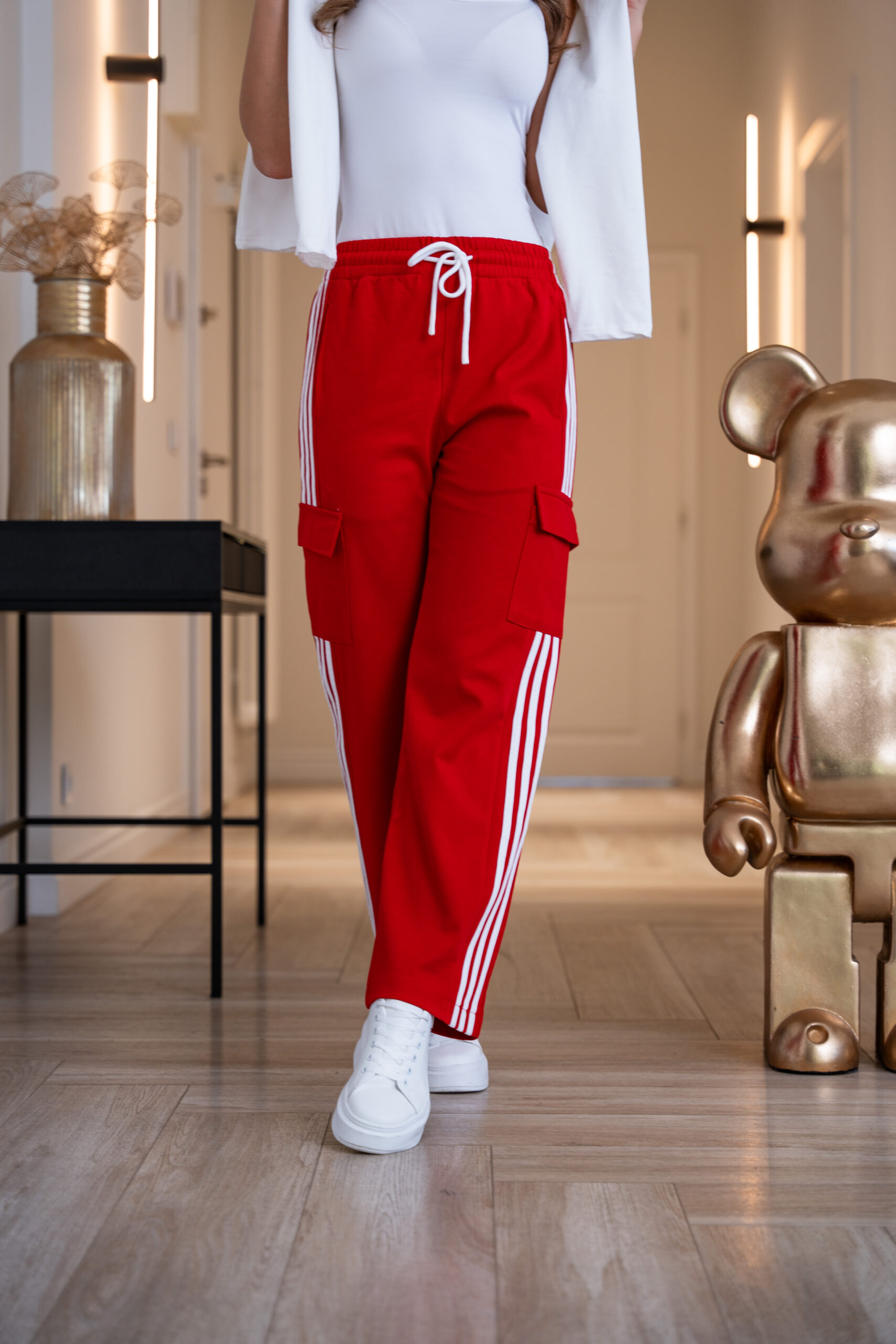 Odkryj nasze wyjątkowe, czerwone spodnie casualowe, które wprowadzą do Twojej garderoby połączenie sportowego stylu i nieprzeciętnej wygody. Wykonane z najwyższej jakości materiału, te spodnie zapewniają niezwykłą miękkość i komfort na co dzień. Wyrazisty czerwony kolor w połączeniu z klasycznymi białymi paskami po bokach nadaje im dynamicznego i modnego charakteru. Spodnie wyposażone w praktyczne kieszenie cargo są wyjątkowo funkcjonalne i stylowe. Świetnie dopasowują się do każdej sylwetki, podkreślając jej atuty i zapewniając maksymalną wygodę. Te spodnie to idealny wybór zarówno na aktywne dni, jak i na swobodne, luźne spotkania towarzyskie.