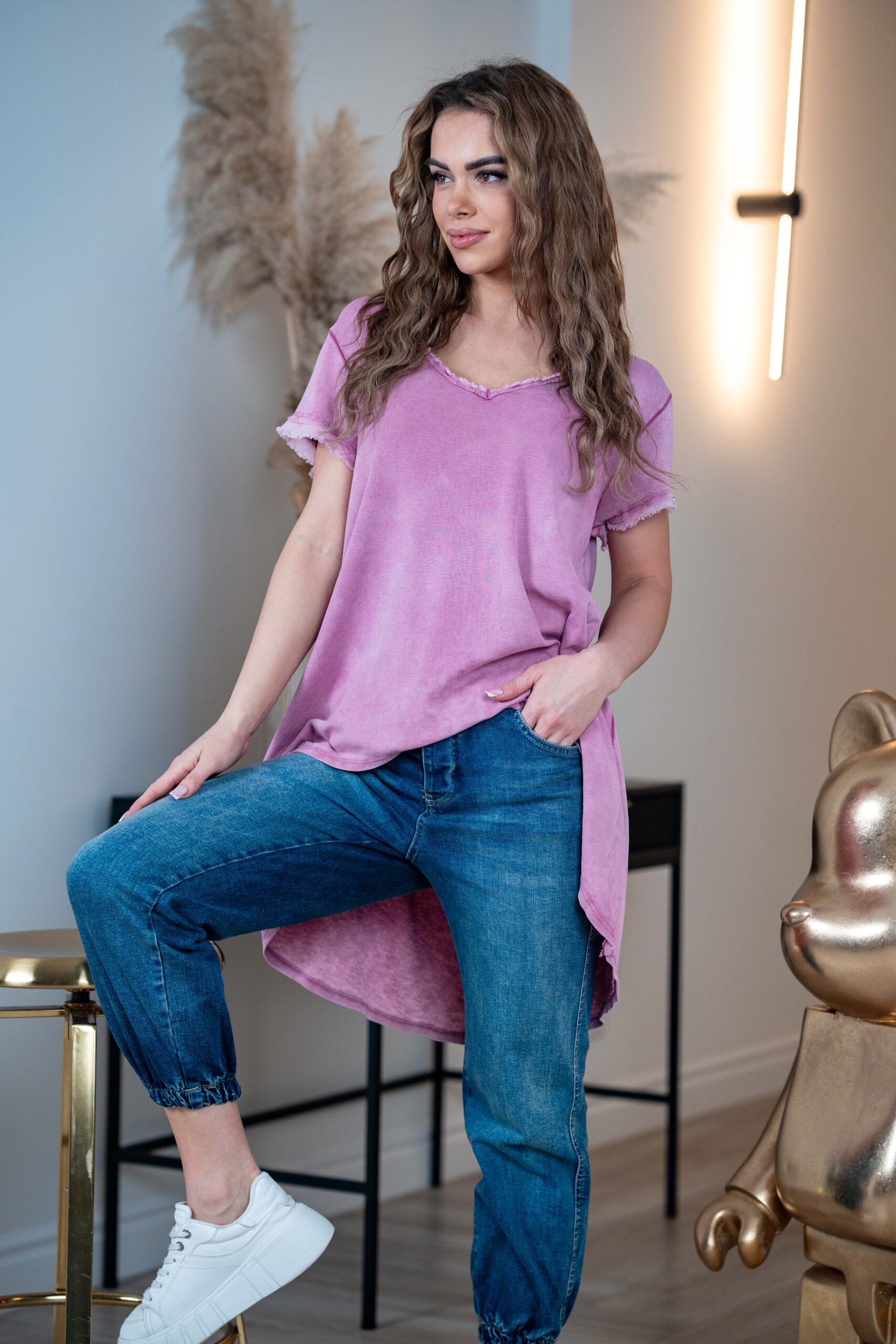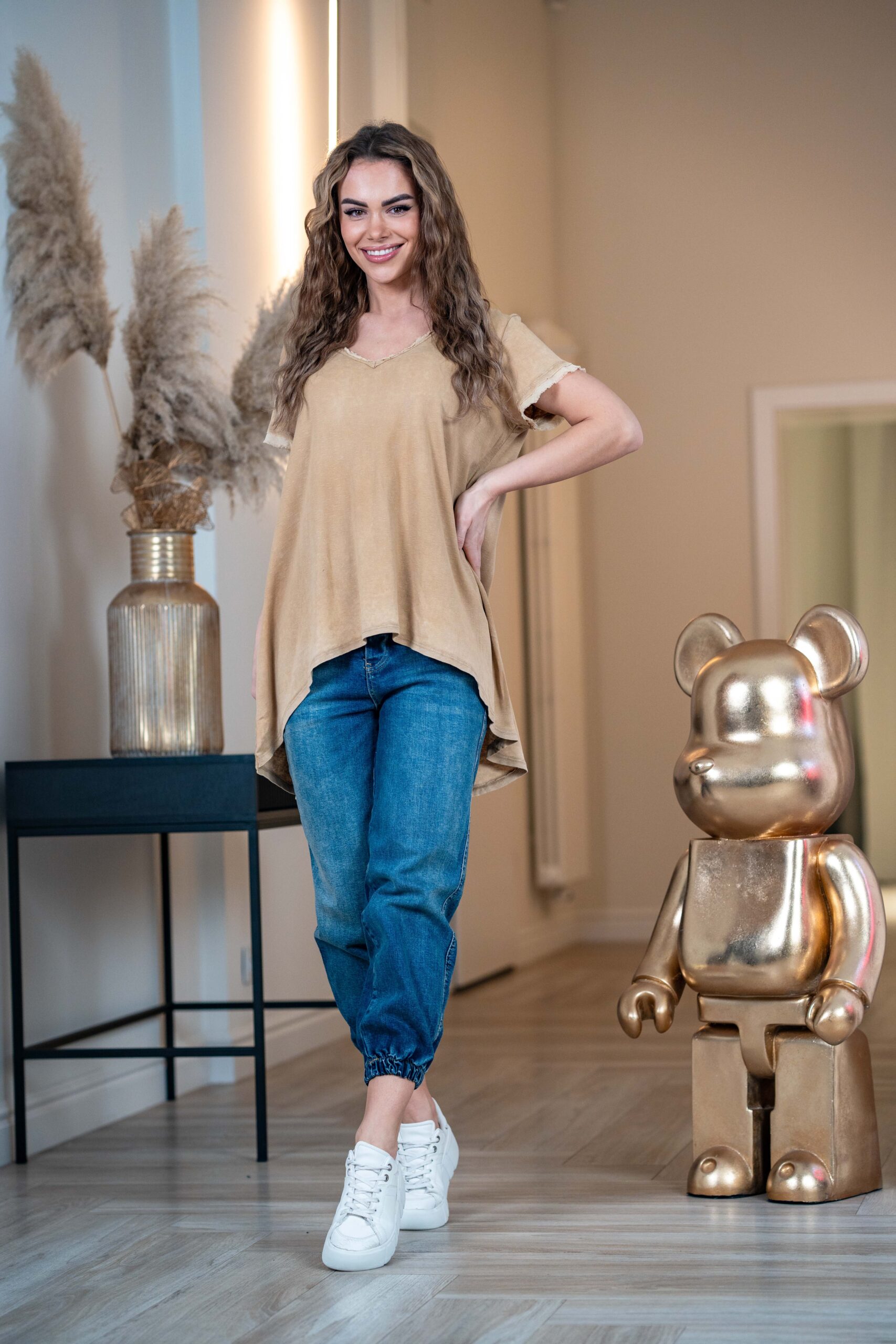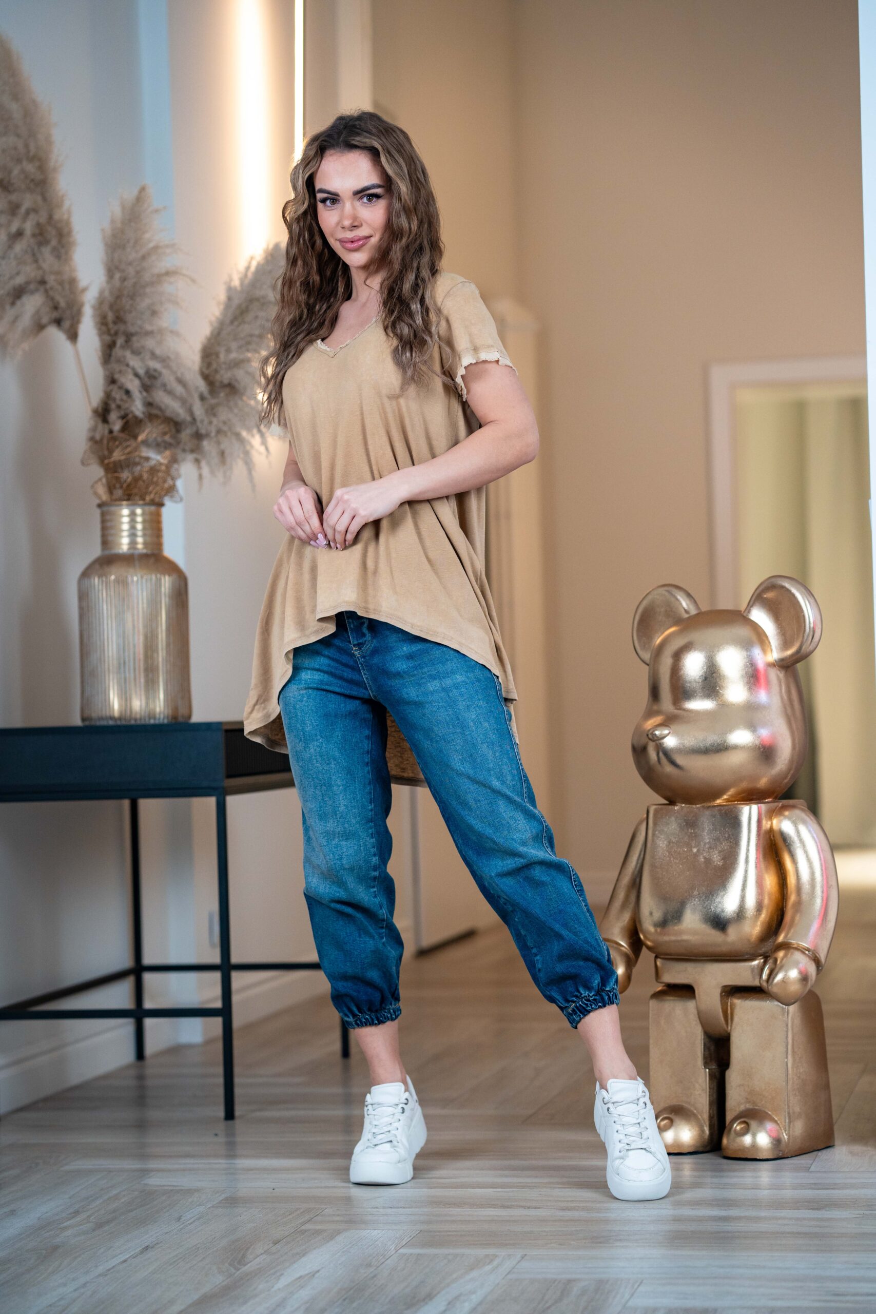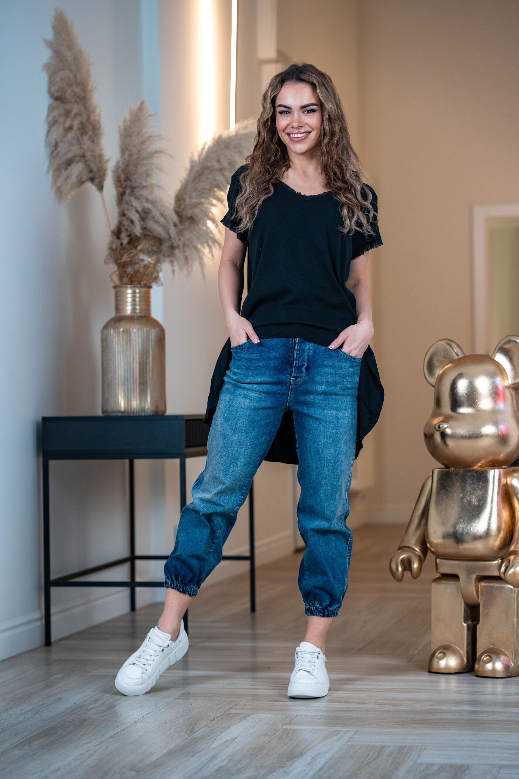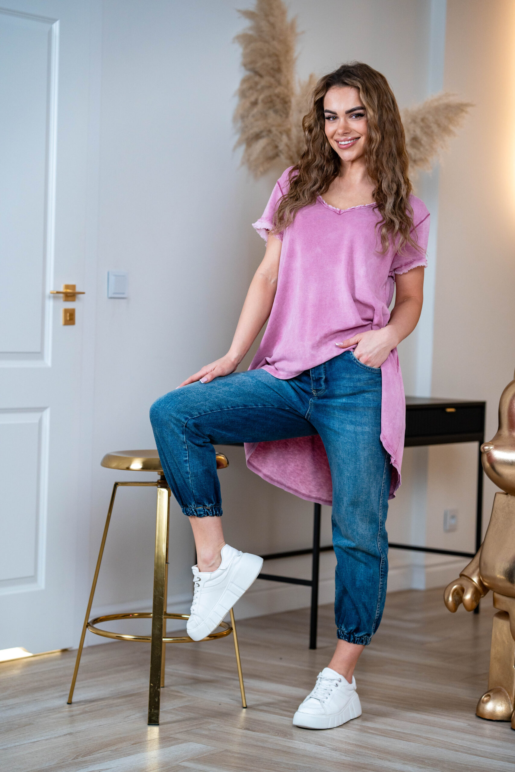 Spodnie bawełniane/jeans wykonane z elastycznego materiału. Krój spodni o prostych nogawkach zakończonych gumką. Nadadzą charakteru każdej Twojej stylizacji, bez wątpienia zaprezentują się niebanalnie i podkreślą sylwetkę. Bardzo komfortowa propozycja,