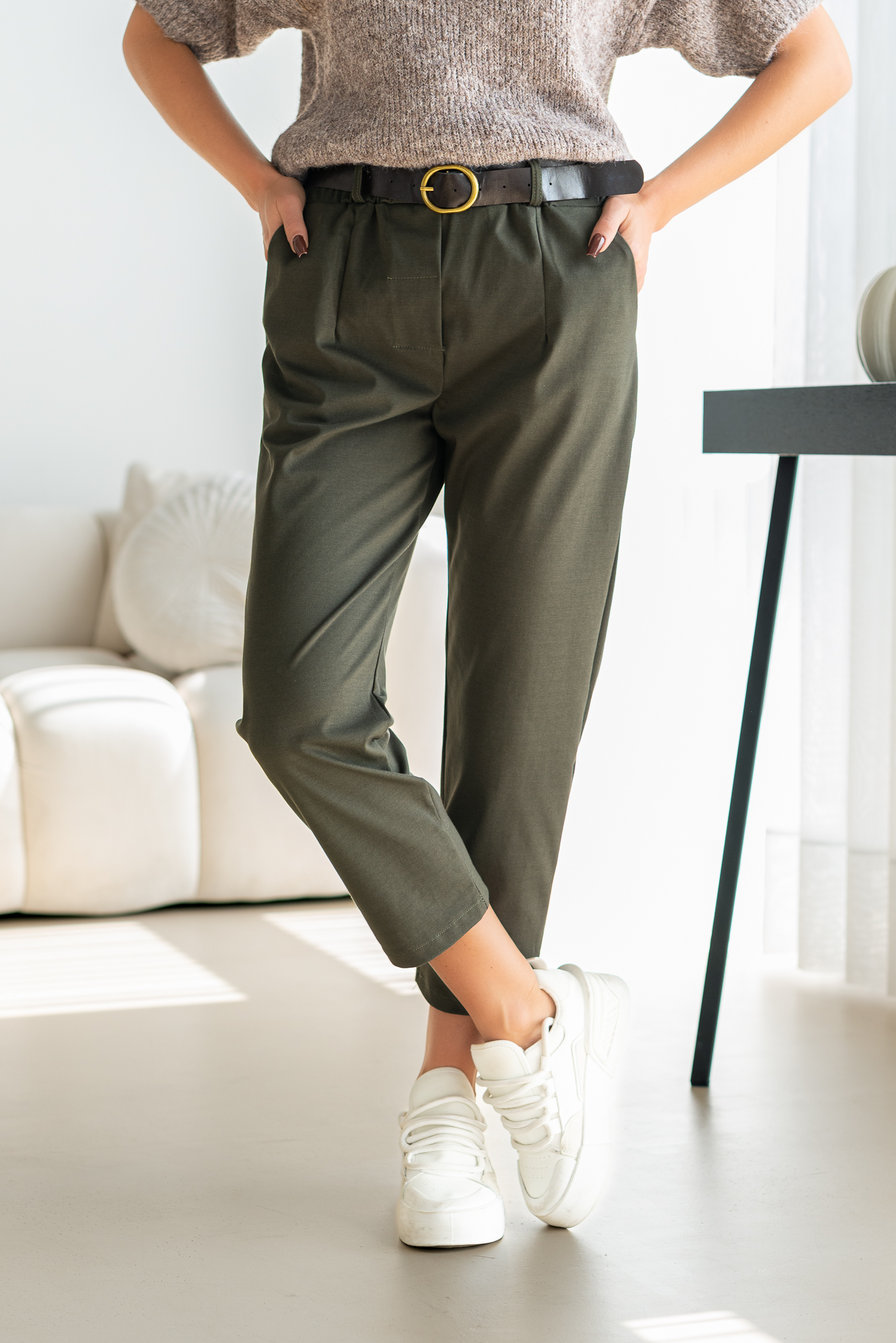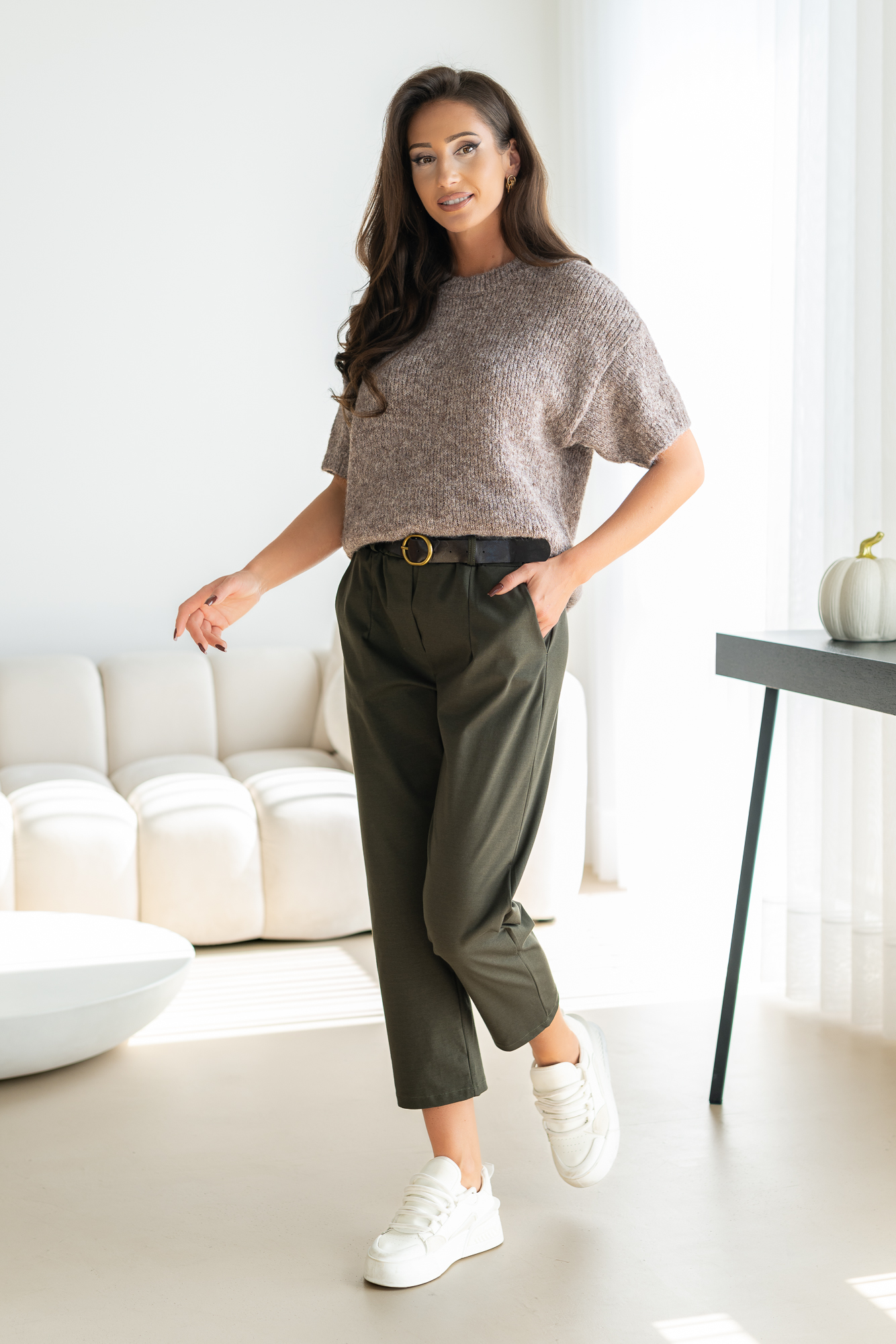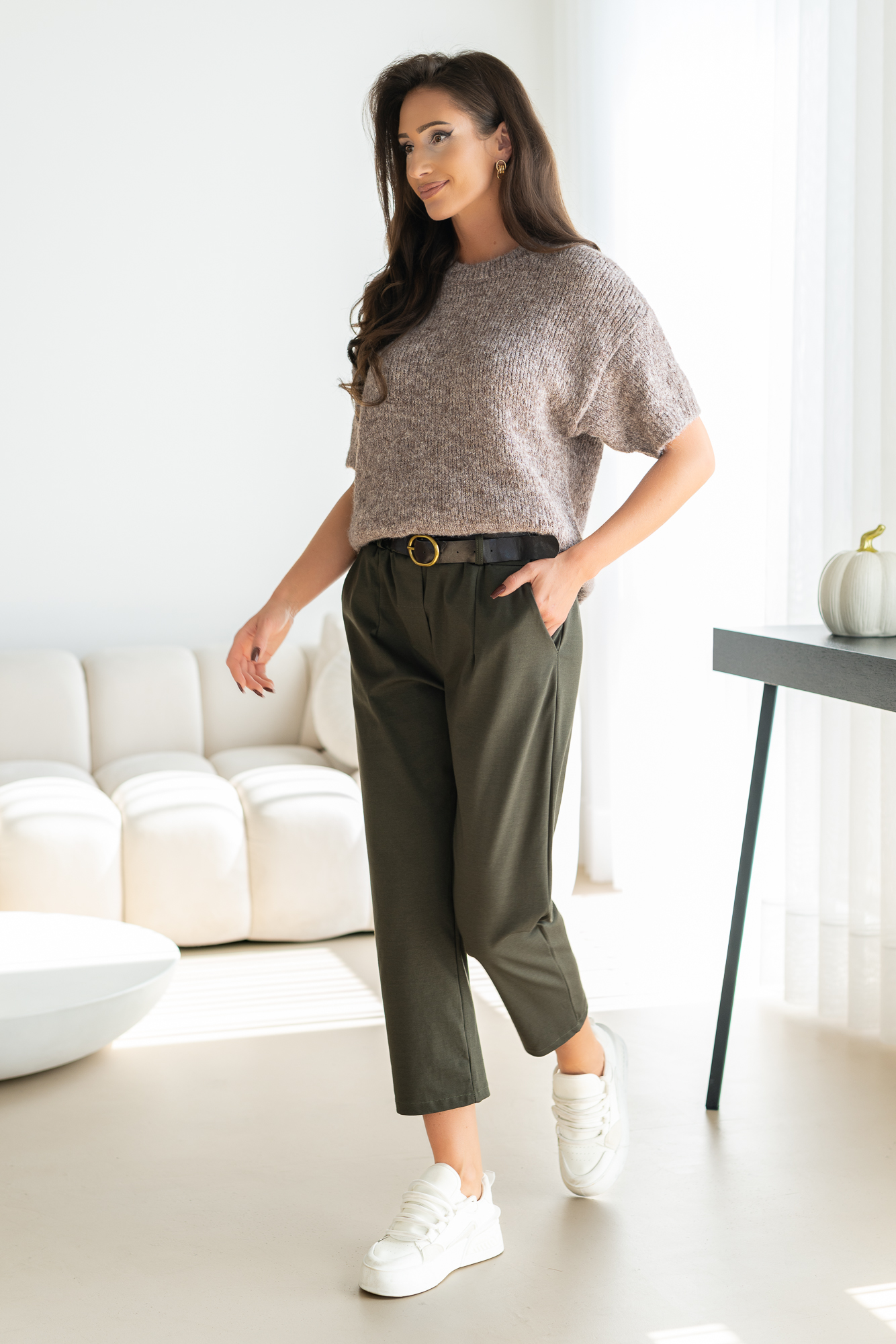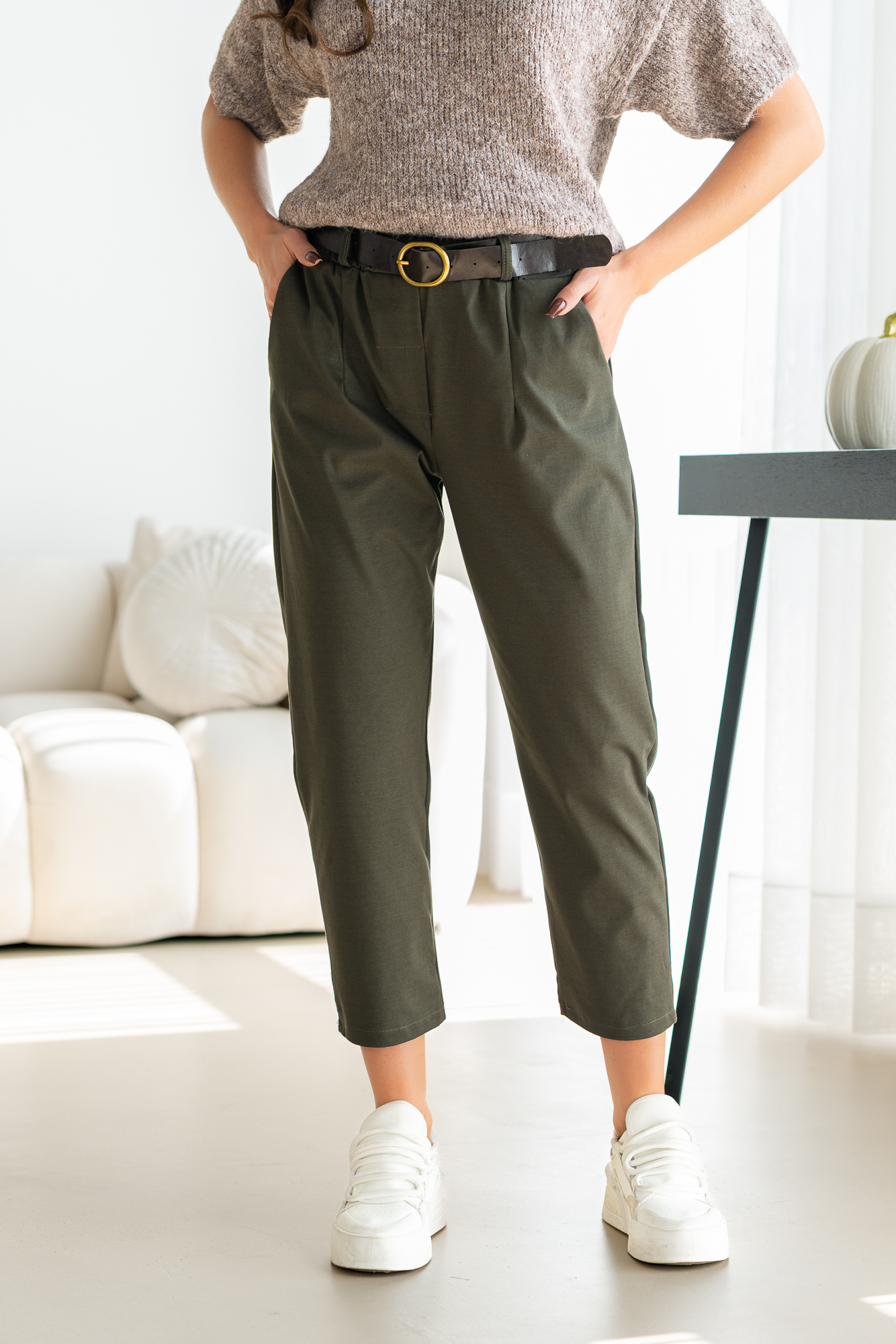 Spodnie Brigi – to spodnie o prostej zwężanej ku dołowi nogawce. Mają elastyczną gumkę w pasie, co zapewnia wygodne dopasowanie. Spodnie wyposażone są w praktyczne kieszenie, dodając funkcjonalności do ich stylowego wyglądu. To modny i wygodny wybór, który doda swobody każdej casualowej stylizacji. Spodnie sprzedawane są w komplecie z paskiem.