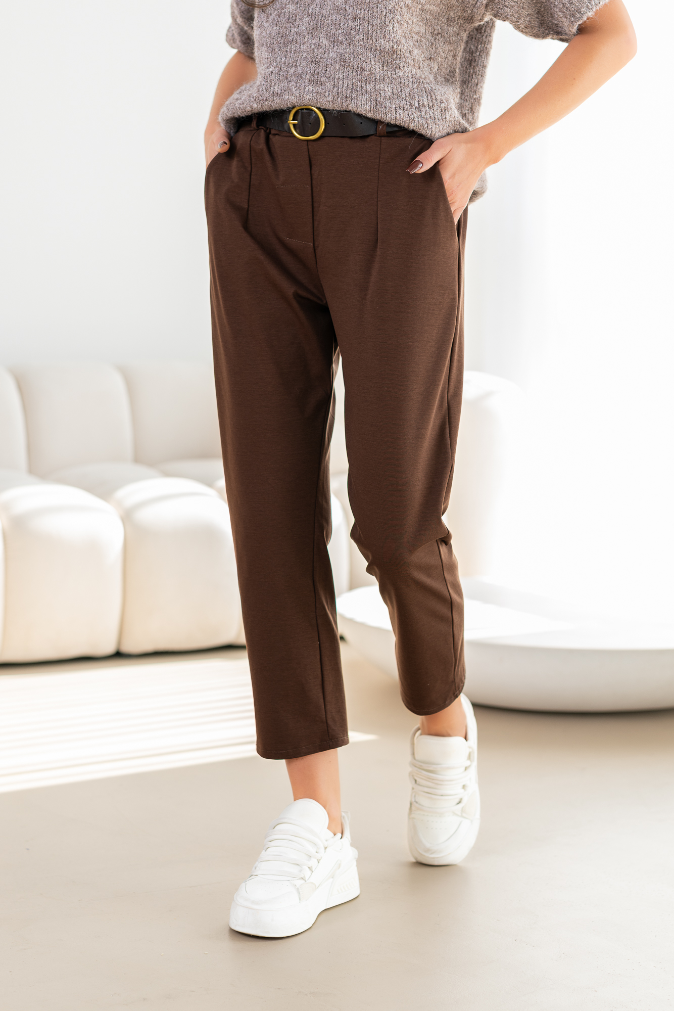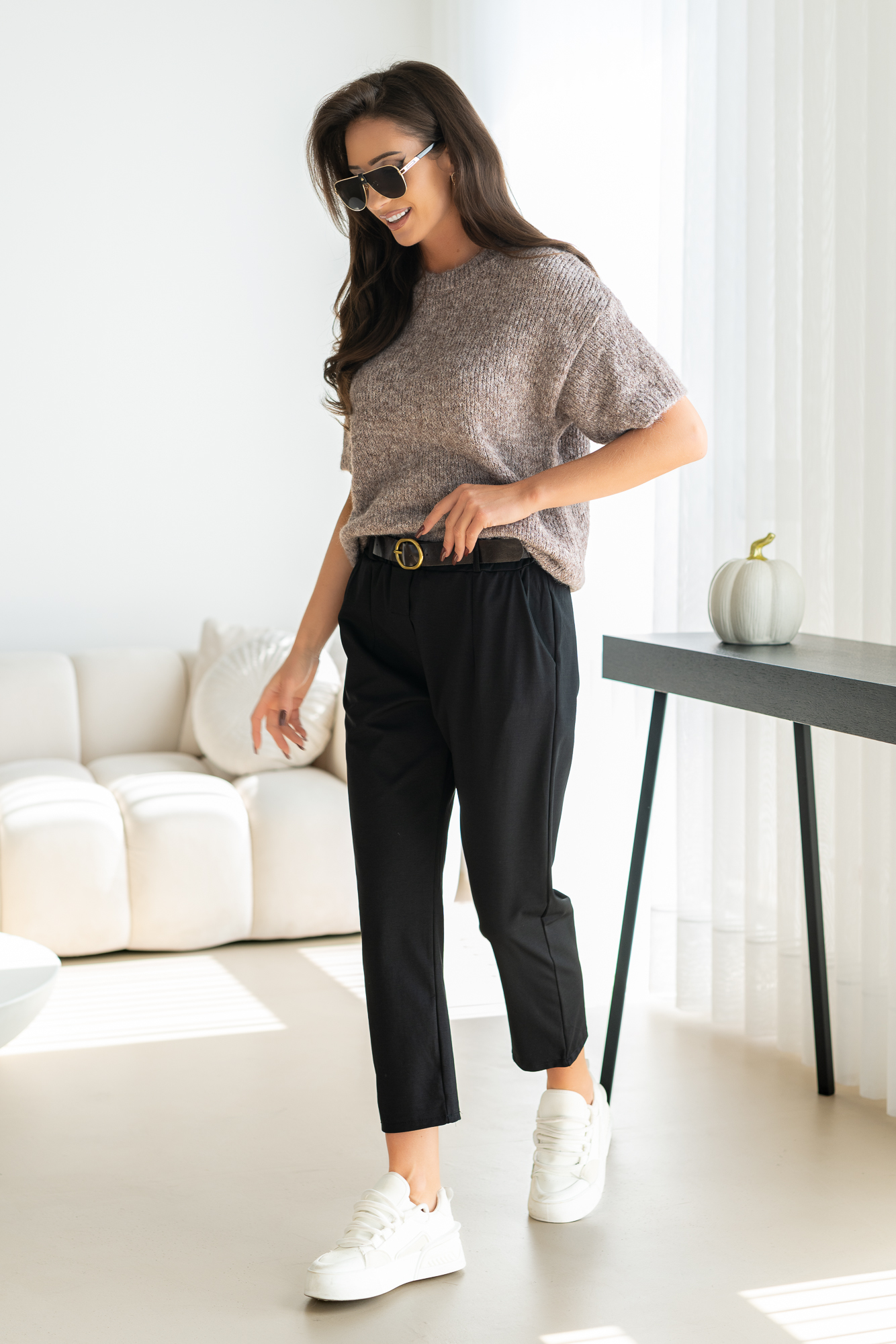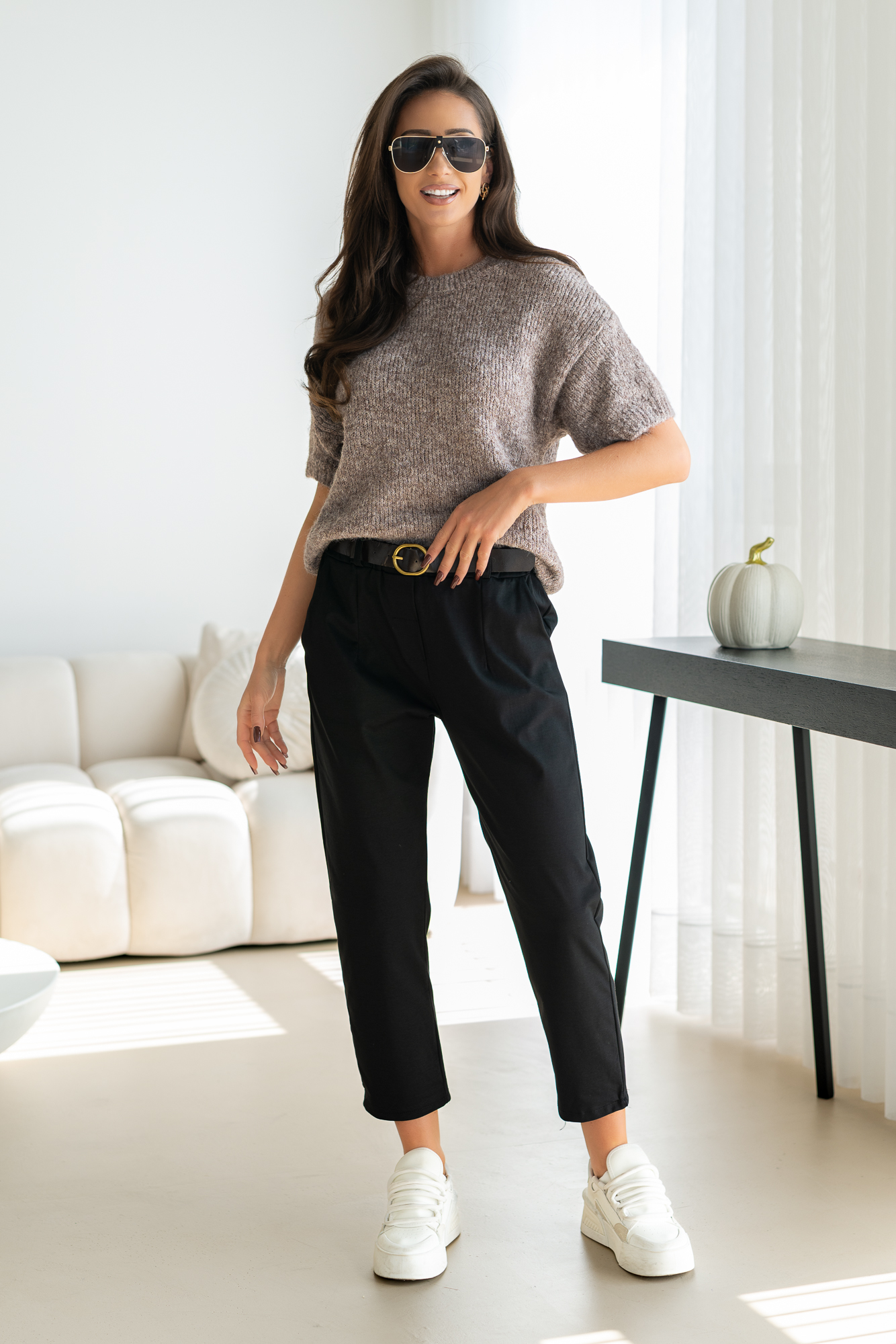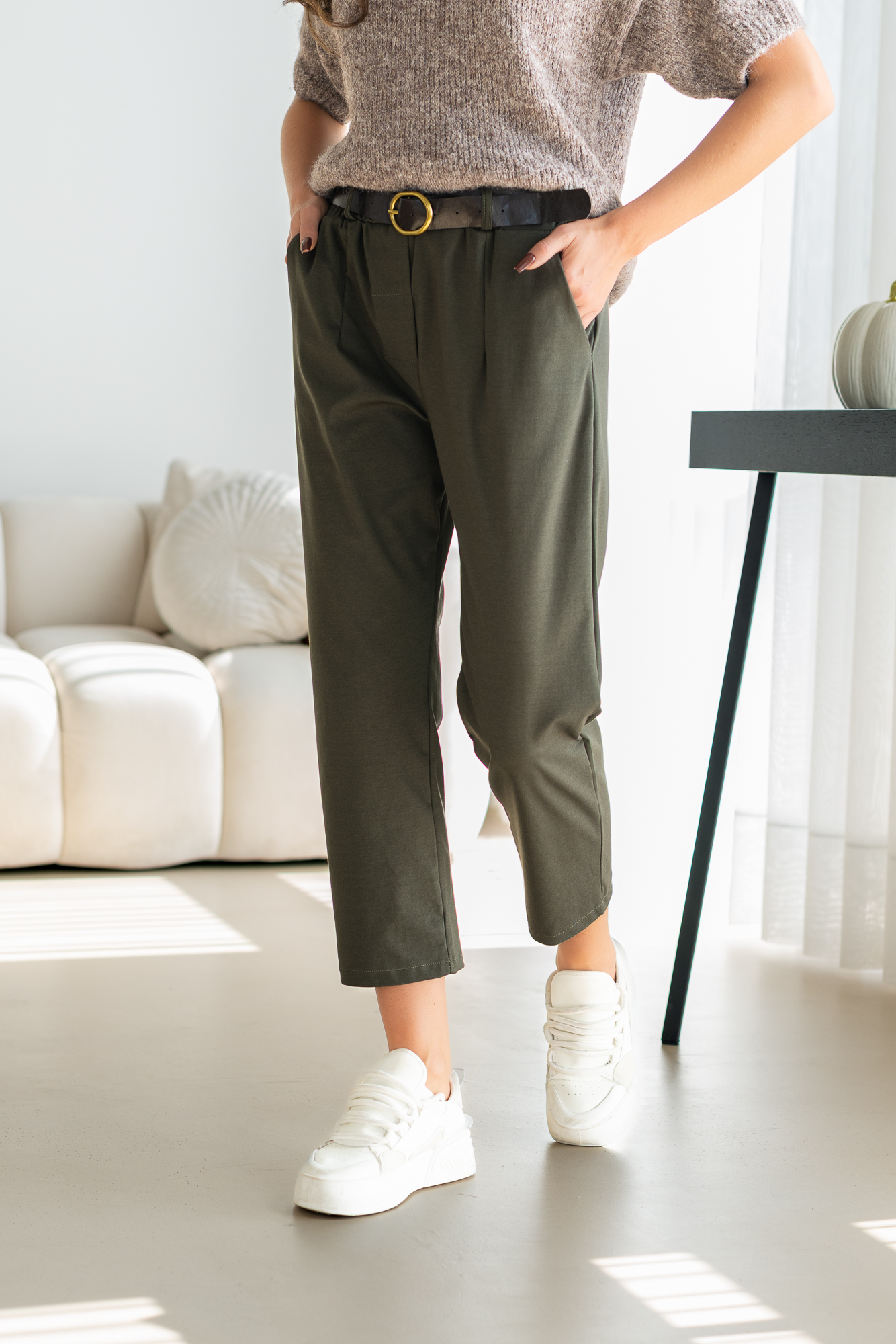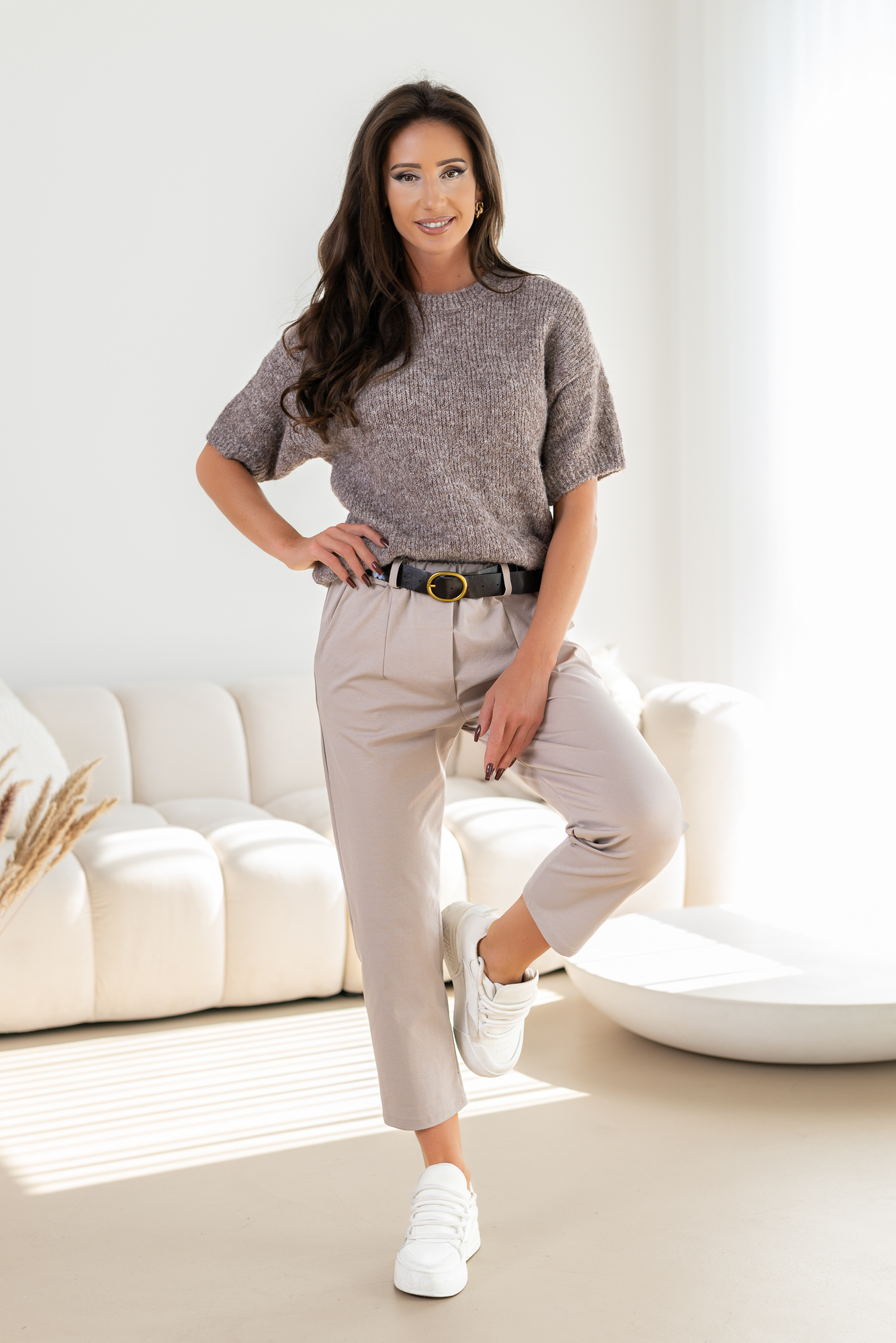 Spodnie Brigi – to spodnie o prostej zwężanej ku dołowi nogawce. Mają elastyczną gumkę w pasie, co zapewnia wygodne dopasowanie. Spodnie wyposażone są w praktyczne kieszenie, dodając funkcjonalności do ich stylowego wyglądu. To modny i wygodny wybór, który doda swobody każdej casualowej stylizacji. Spodnie sprzedawane są w komplecie z paskiem.