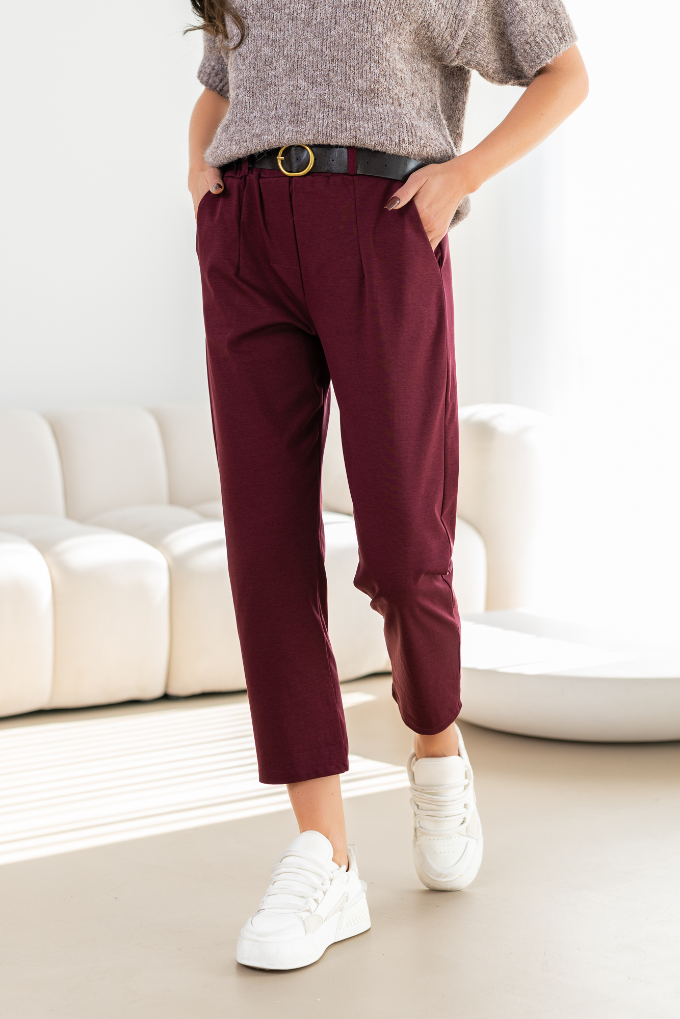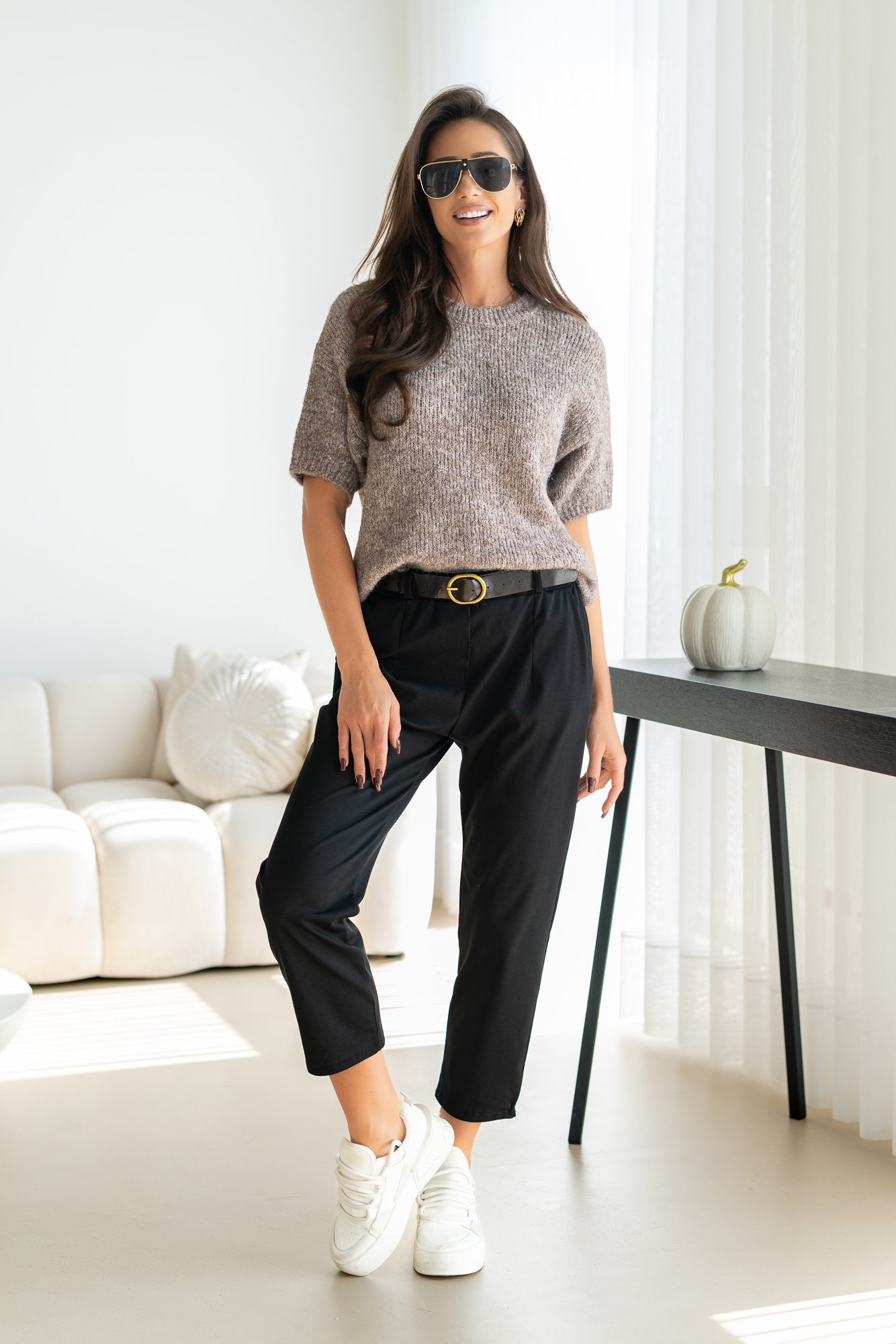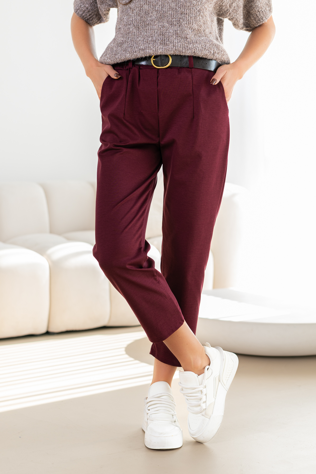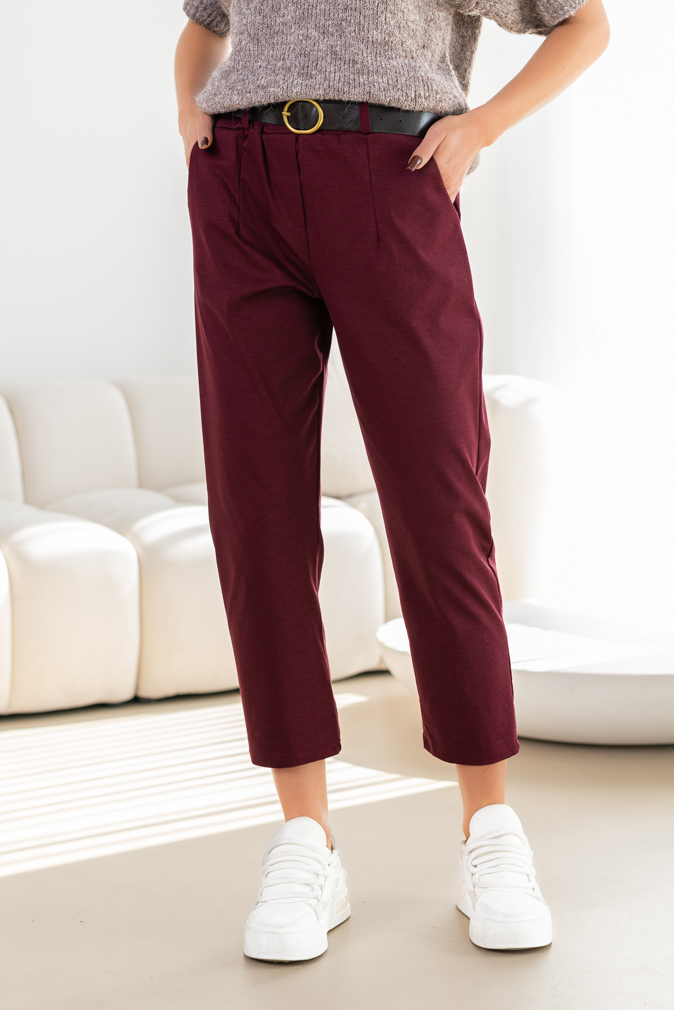 Spodnie Brigi – to spodnie o prostej zwężanej ku dołowi nogawce. Mają elastyczną gumkę w pasie, co zapewnia wygodne dopasowanie. Spodnie wyposażone są w praktyczne kieszenie, dodając funkcjonalności do ich stylowego wyglądu. To modny i wygodny wybór, który doda swobody każdej casualowej stylizacji. Spodnie sprzedawane są w komplecie z paskiem.